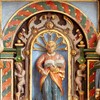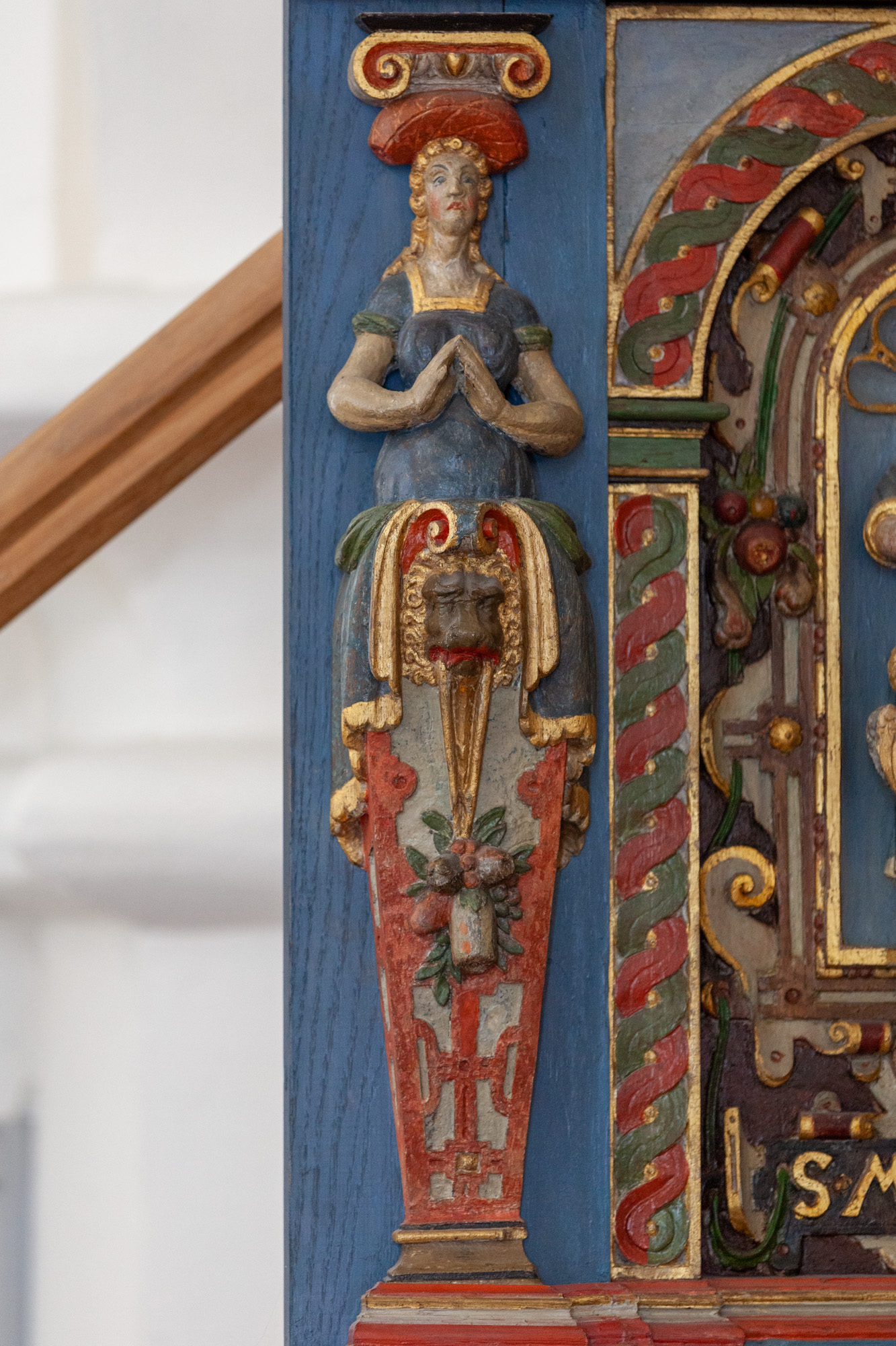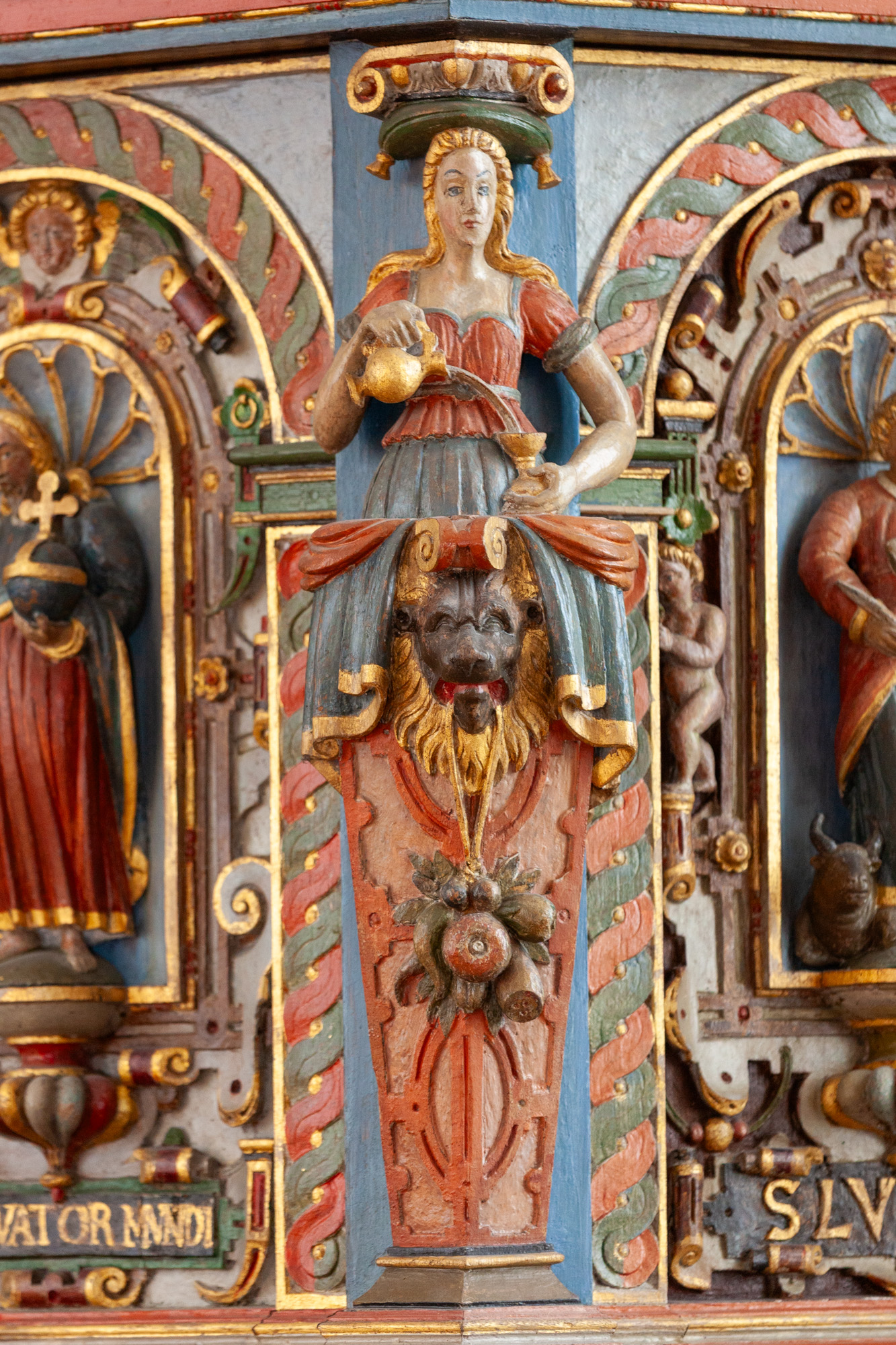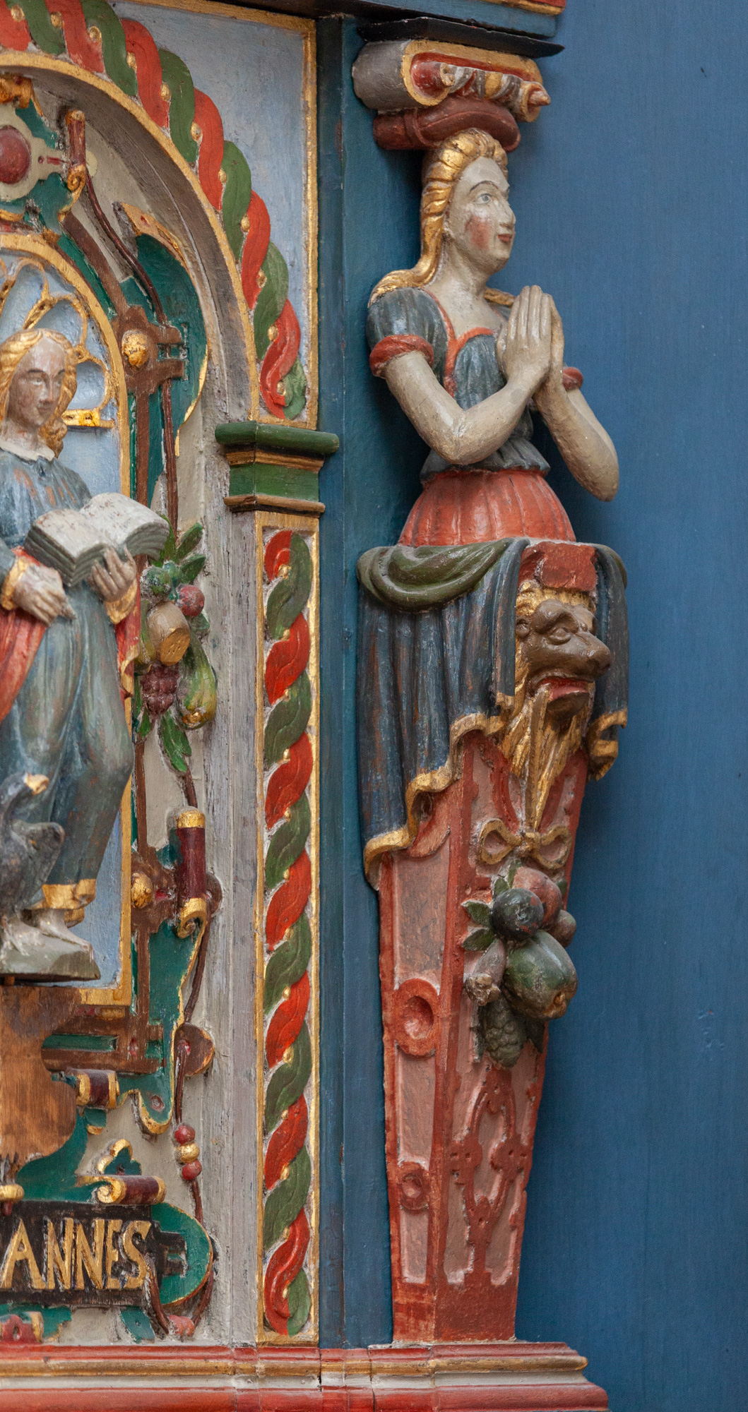 Hermerne på fremspringene fremstiller dyder: først en tilbedende (adorant), dernæst Justitia, måske Fides, idet atributten mangler, Temperantia, en ukendt, fordi attributen mangler, og til sidst endnu en adorant.