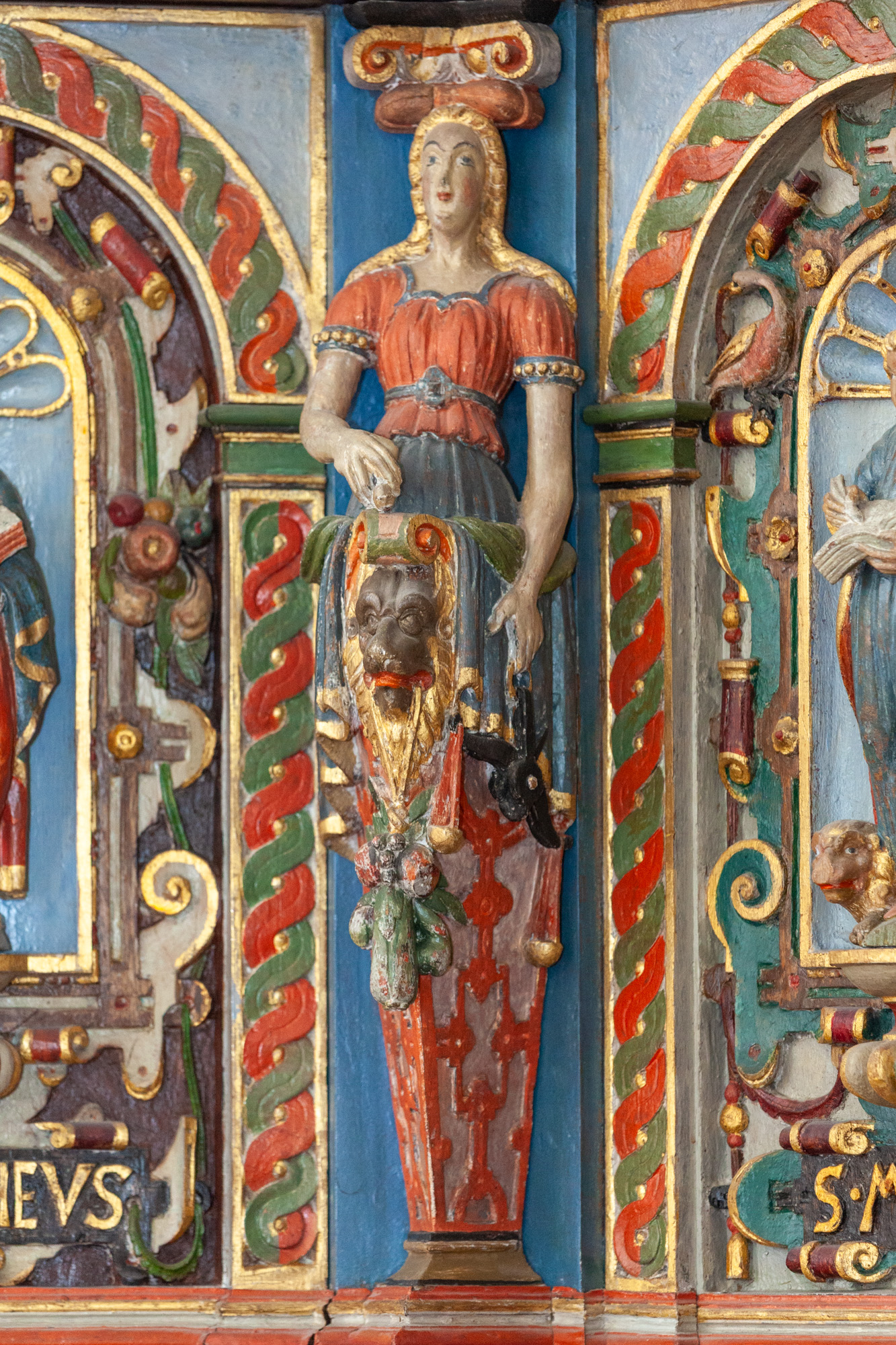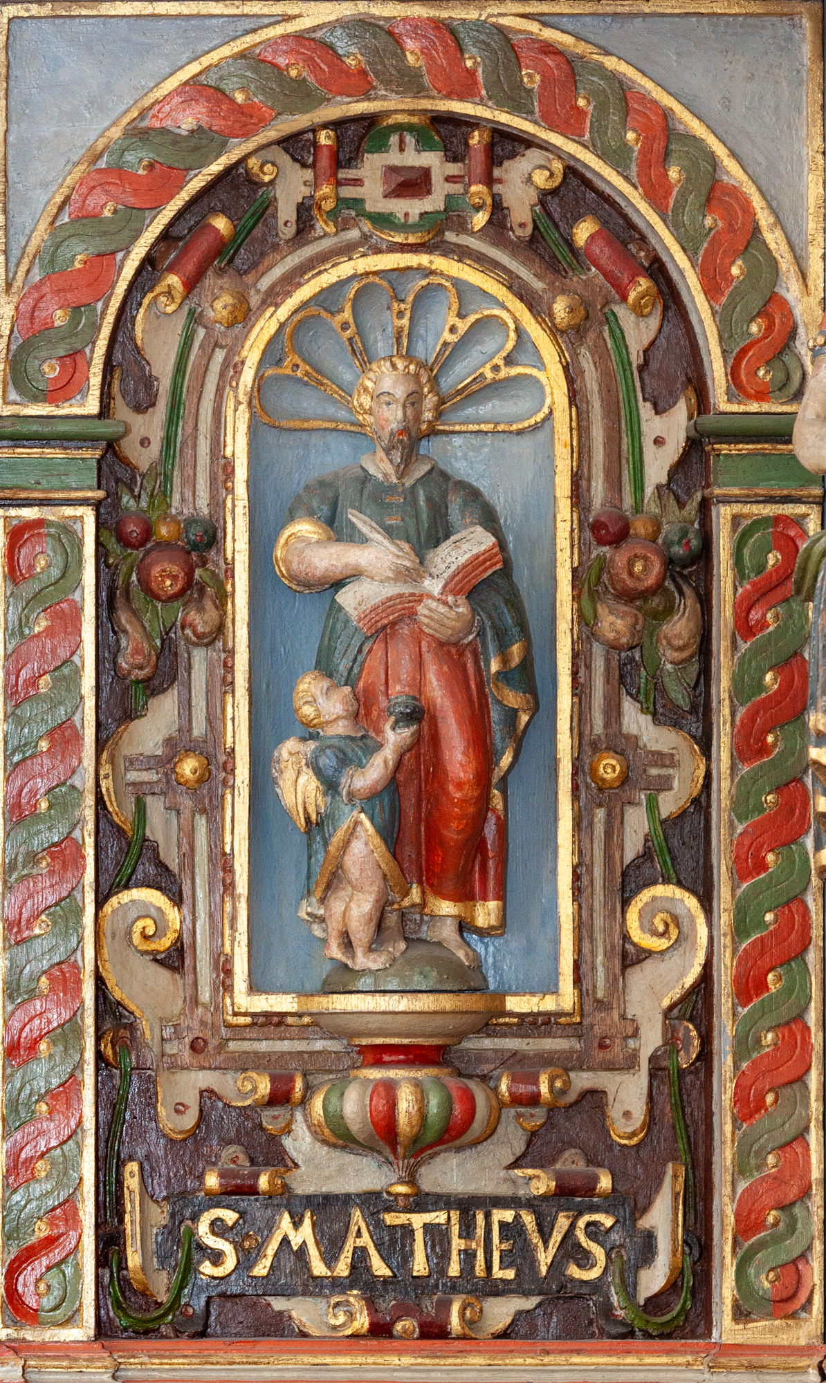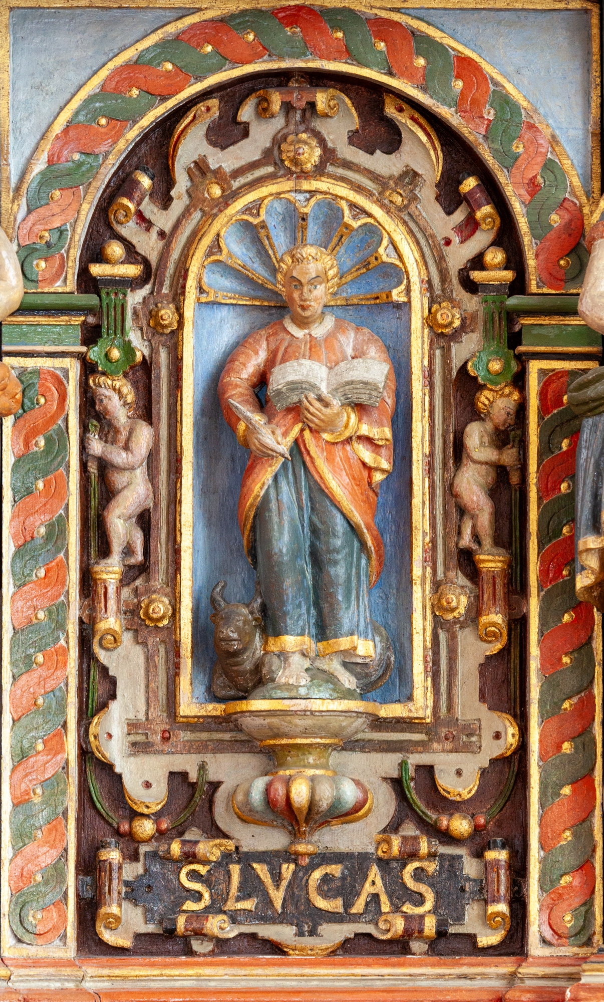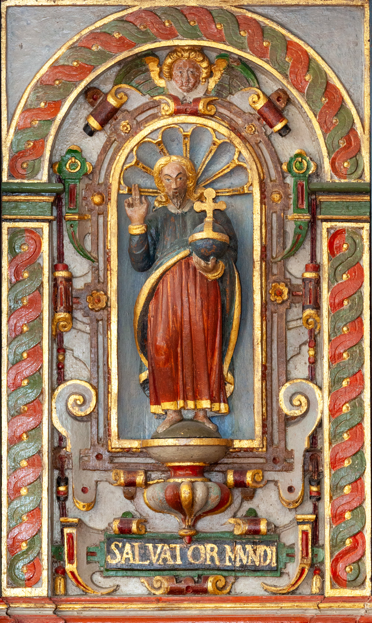 Storfelterne har fremstillinger af Kristus og evangelisterne i frifigur. De står på et postament i en indre ramme bestående af rulleværk og en ydre med slyngbånd. Under figurerne er en kartouche med deres navn.