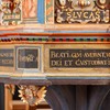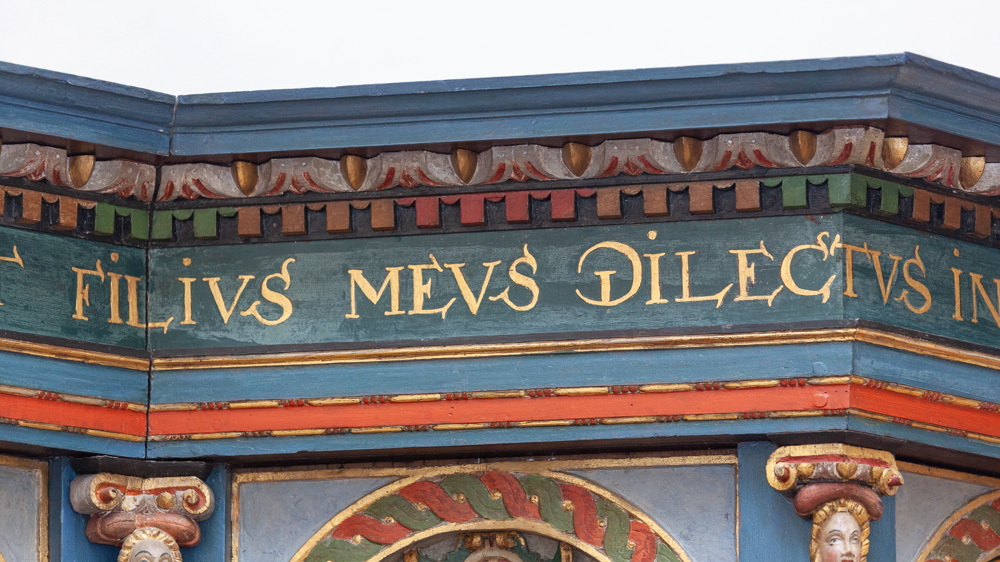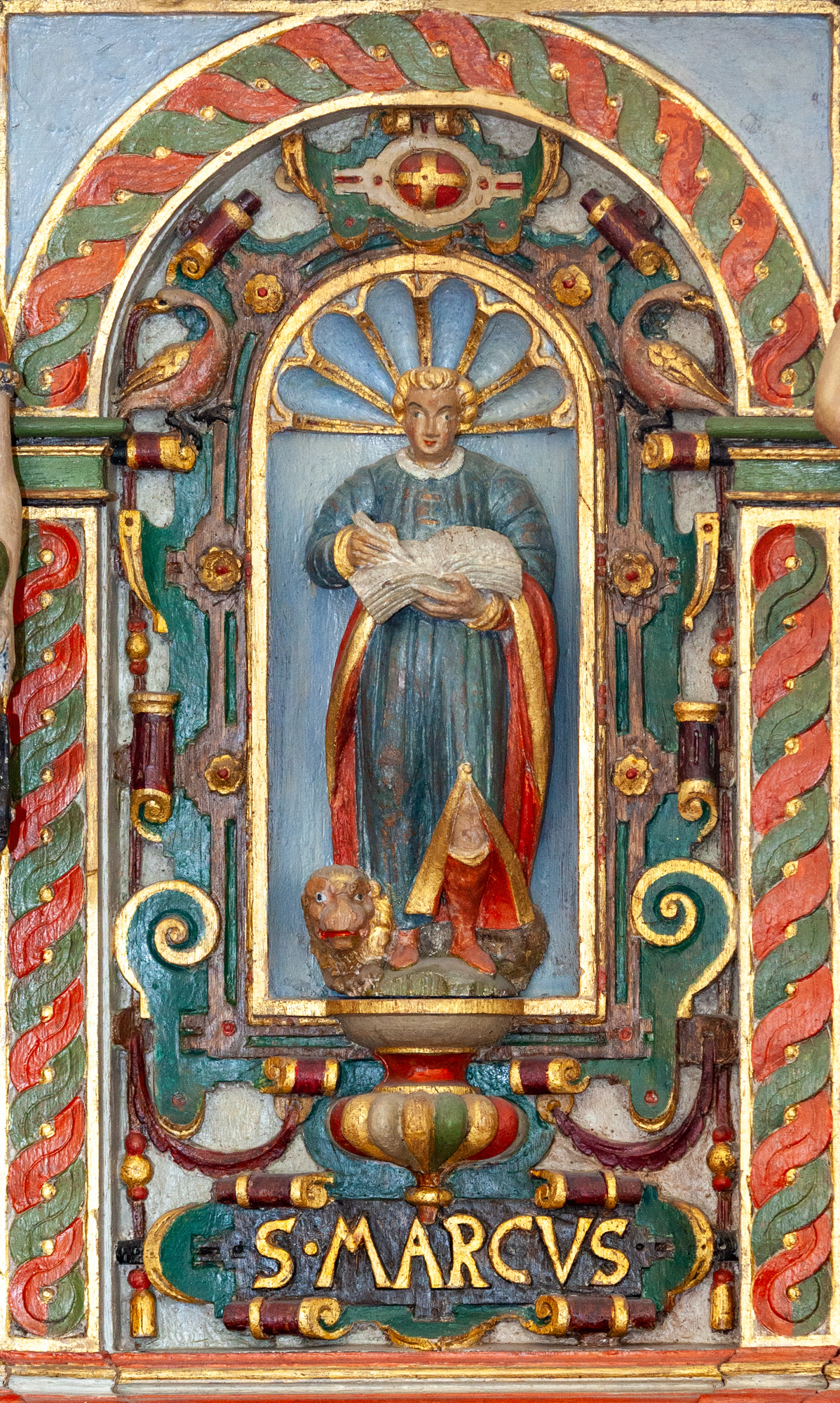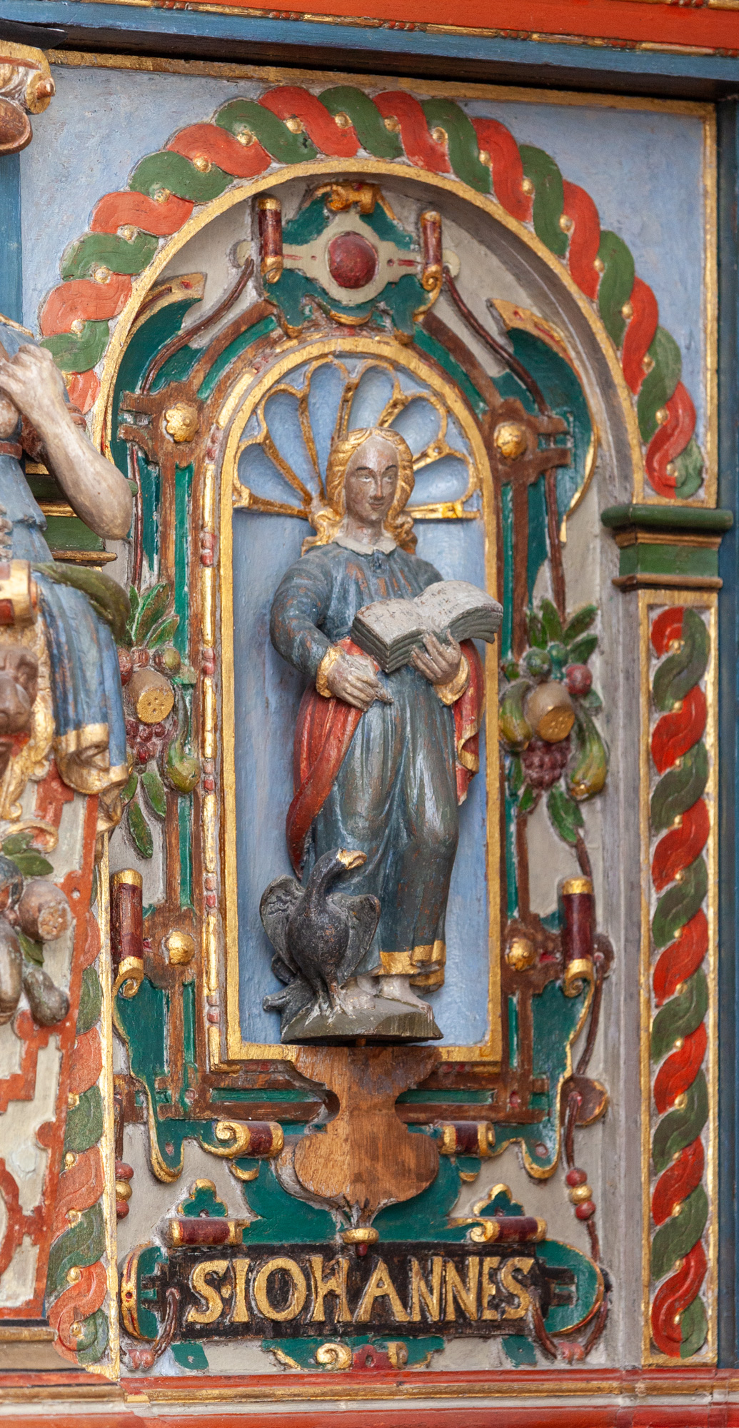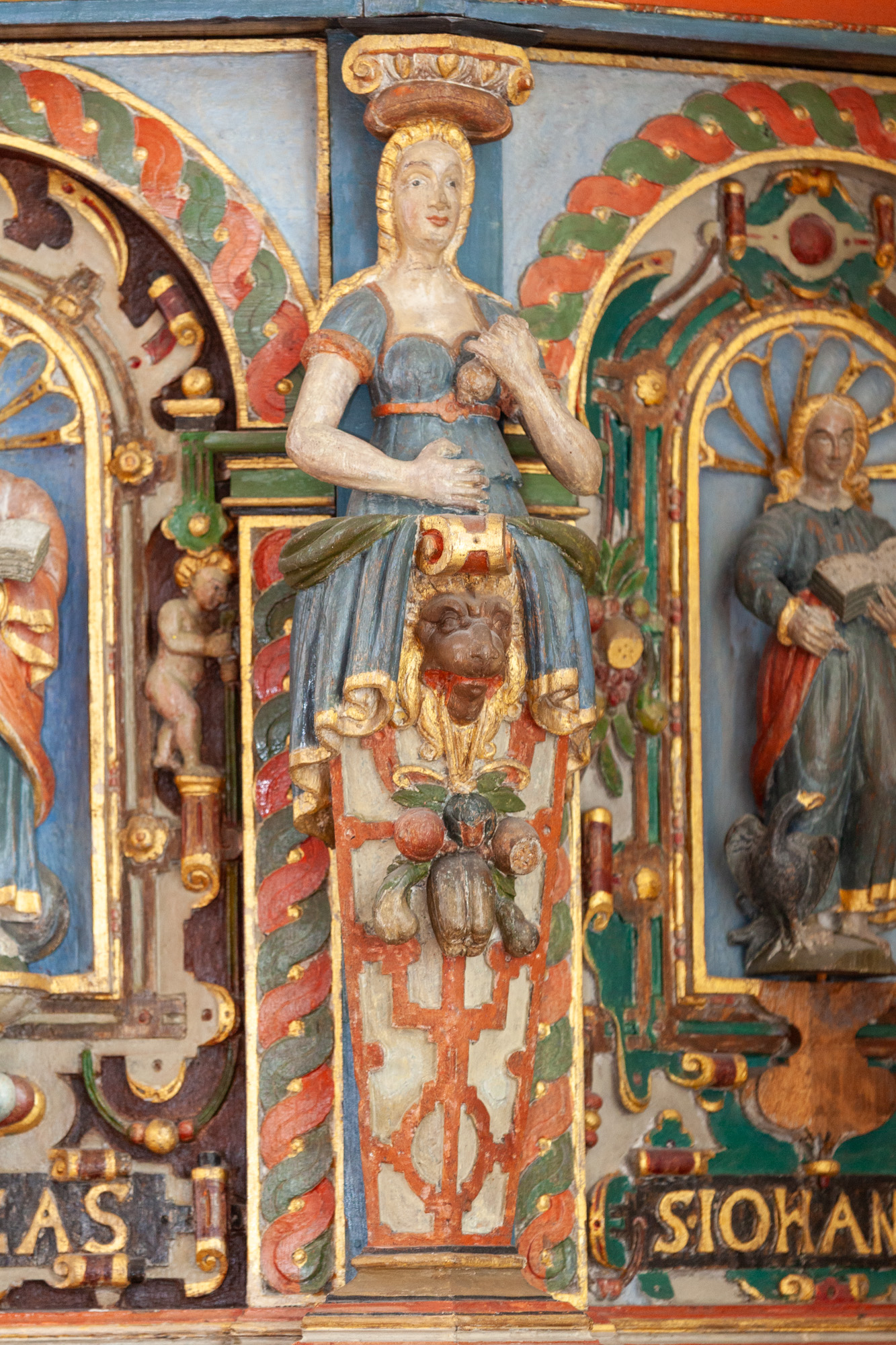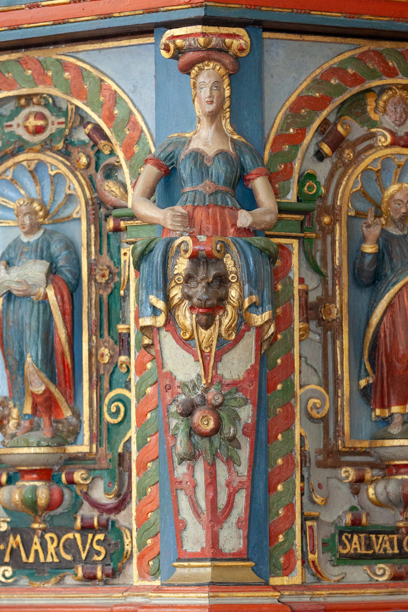 Storfelterne har fremstillinger af Kristus og evangelisterne i frifigur. De står på et postament i en indre ramme bestående af rulleværk og en ydre med slyngbånd. Under figurerne er en kartouche med deres navn.