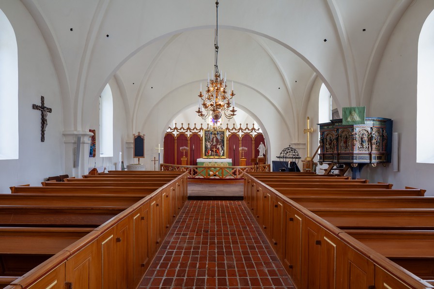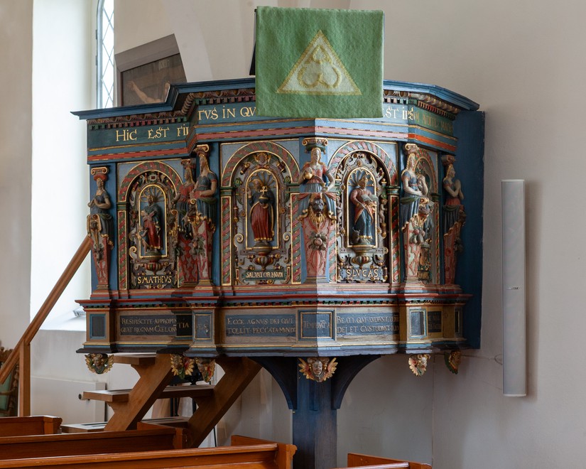 Prædikestolen er et renæssancearbejde fra 1598. I de øverste smalfelter står der: ”Hic est filius meus dilectus in qvo mihi beneplacitum est ipsum audite. Math. XVII” (Denne er min søn den elskede, i hvem jeg har velbehag. Hør ham.)