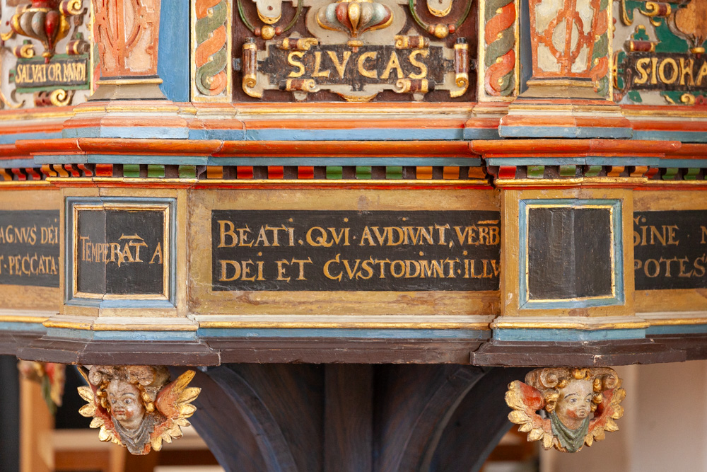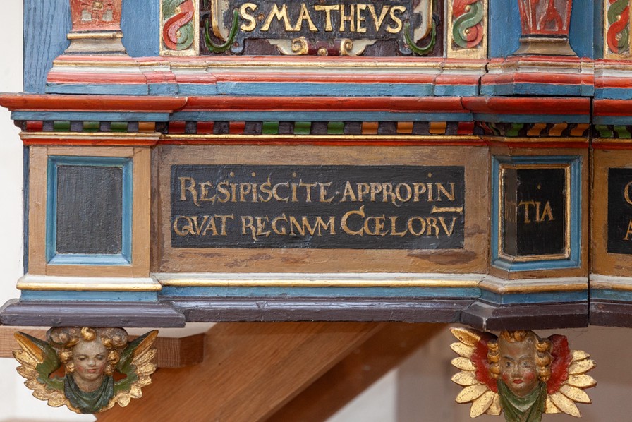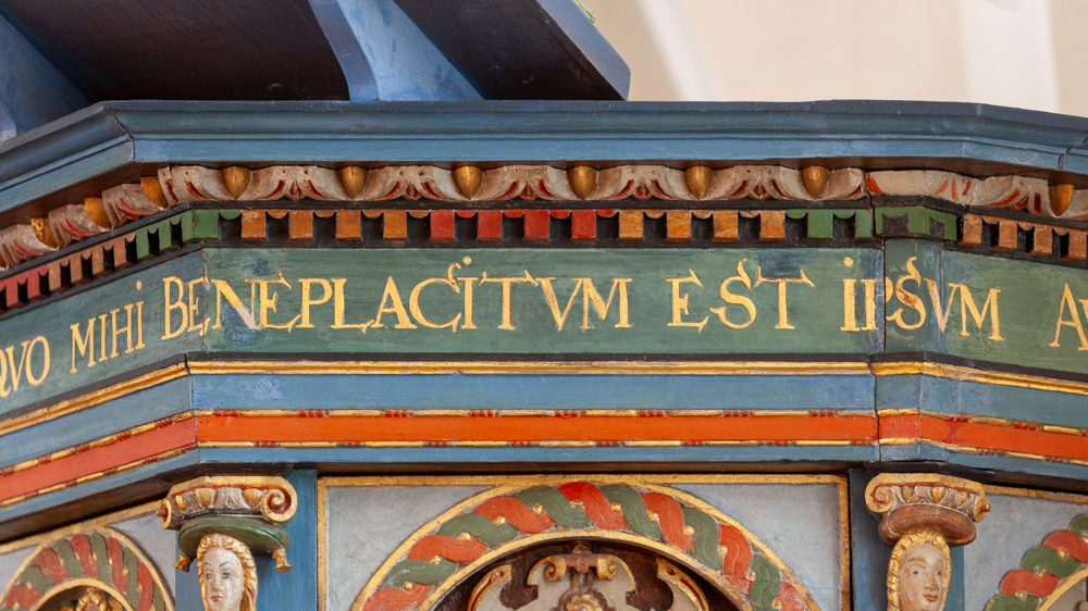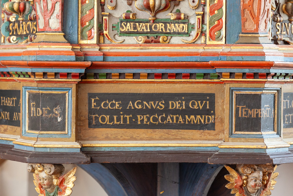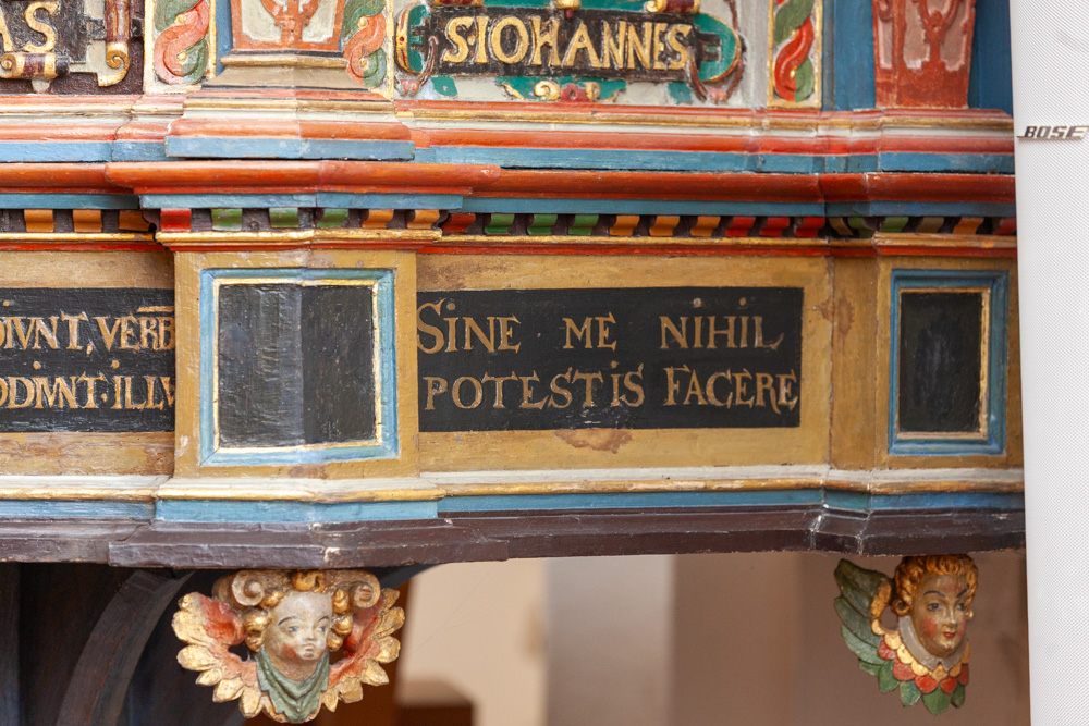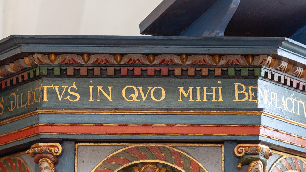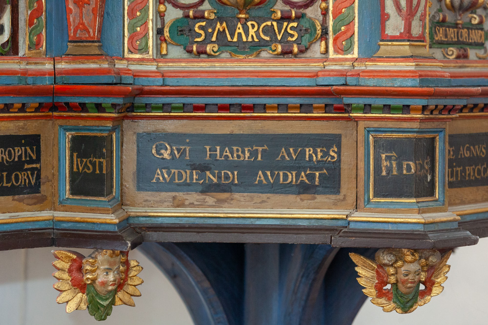 Anno 1598 den tijd Axel Brahe war höfwitsmann på Helsingborgs slott, blef denne predikestol giord. M. Michel Olson sogneprest i Helsingborg och herrids profwits förskrefne år, Claus Holst slotsfoged og riefoged i Lougud Herridt. Min lycke ståår i Guds haand. Hr Jacob Olsen Skåning sogneprest i det samme åår. Frustra laborat lingua doctoris nisi intus operatur gratia salvatoris. Cui deus bene vult homo prevalere non potest (Forgæves taler læreren tunge, om ikke Frelserens nåde er virksam i ham. Den Gud vil det godt kan intet menneske overvinde). Hwad Gud will mig tillsände kan ingen afwende. Hwad Gud mig aand (=under) förmenn mig ingen mand. Kirckewerge Peder Axelson, Anders Janson.