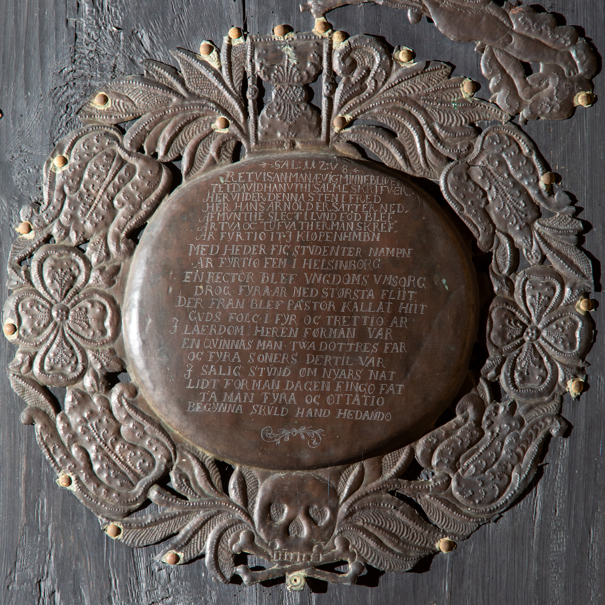 På dansk: “O Du denne kirkes lærer i sandhed, rose i tålmodighed, elfenben i kyskhed, Du har for intet rakt os visdommens vand. Du nådens fortaler foren os med de salige. Heinrich de Borch støbte mig 1521.”