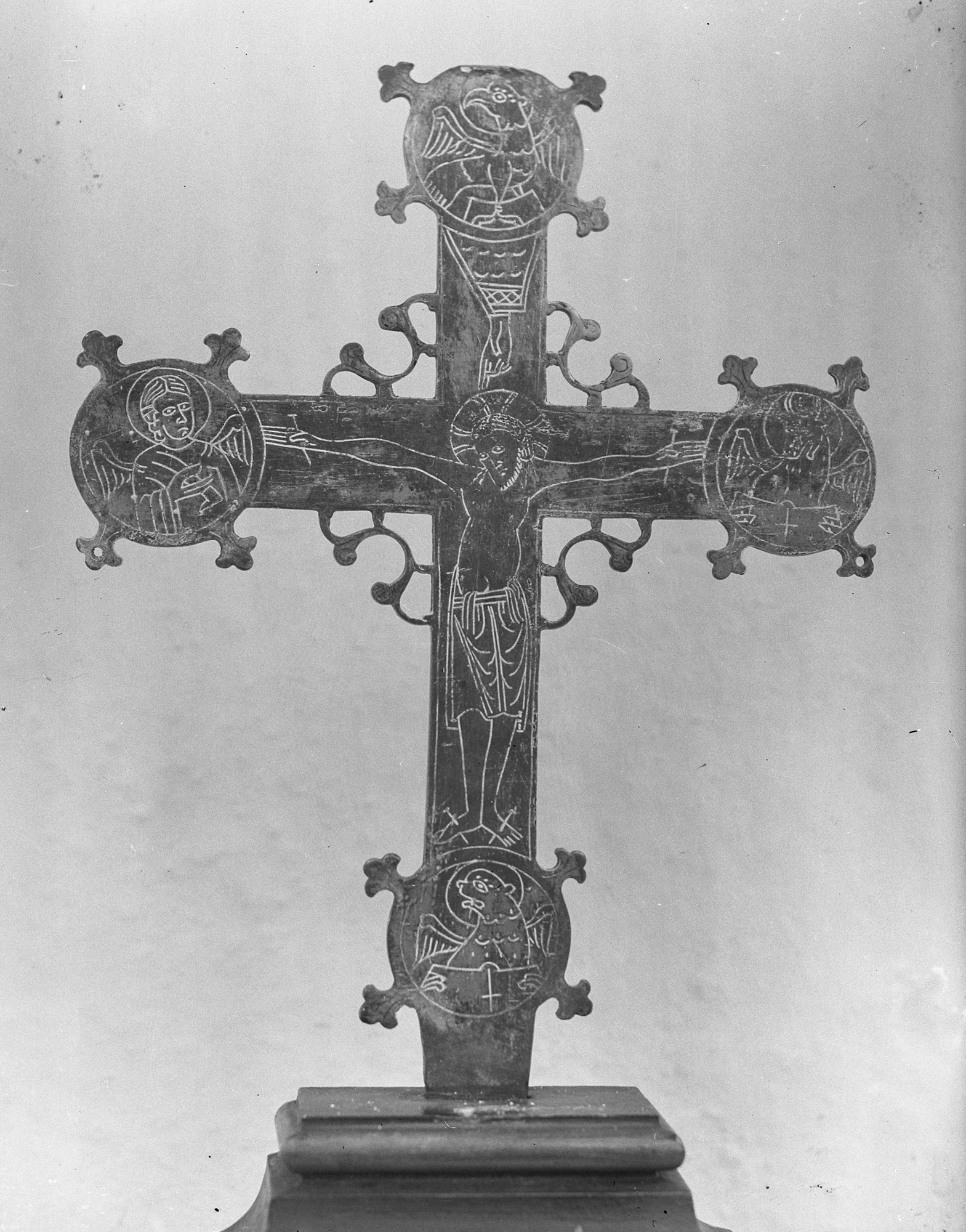 Korsets endeplader er runde med hjørneblade og evangelistsymboler.