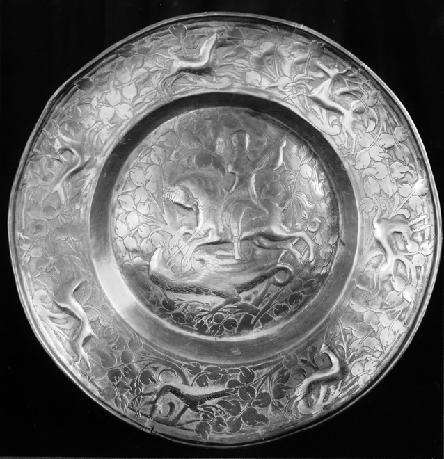 Dåbsfad af messing fra 1698. Motiv: Skt. Jørgen og dragen.