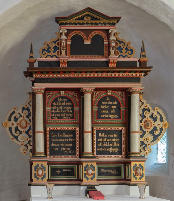 Ifølge oplysning på predellaen er altertavlen lavet i 1600 og renoveret 1772 og 1890. Predellaen er delt af tre konsoller med beslagornamentik og ansigtsmasker. De bærer tre kraftige søjler med glatte marmorerede skafter, som danner to høje felter, der begge der delt i et rektangulært felt forneden og øverst et næsten kvadratisk med rundbue og slyngbånd. Felterne er udfyldt med skriftsteder. De stammer fra altertavlens renovering 1772. Ved renoveringen 1890 blev sproget moderniseret.
