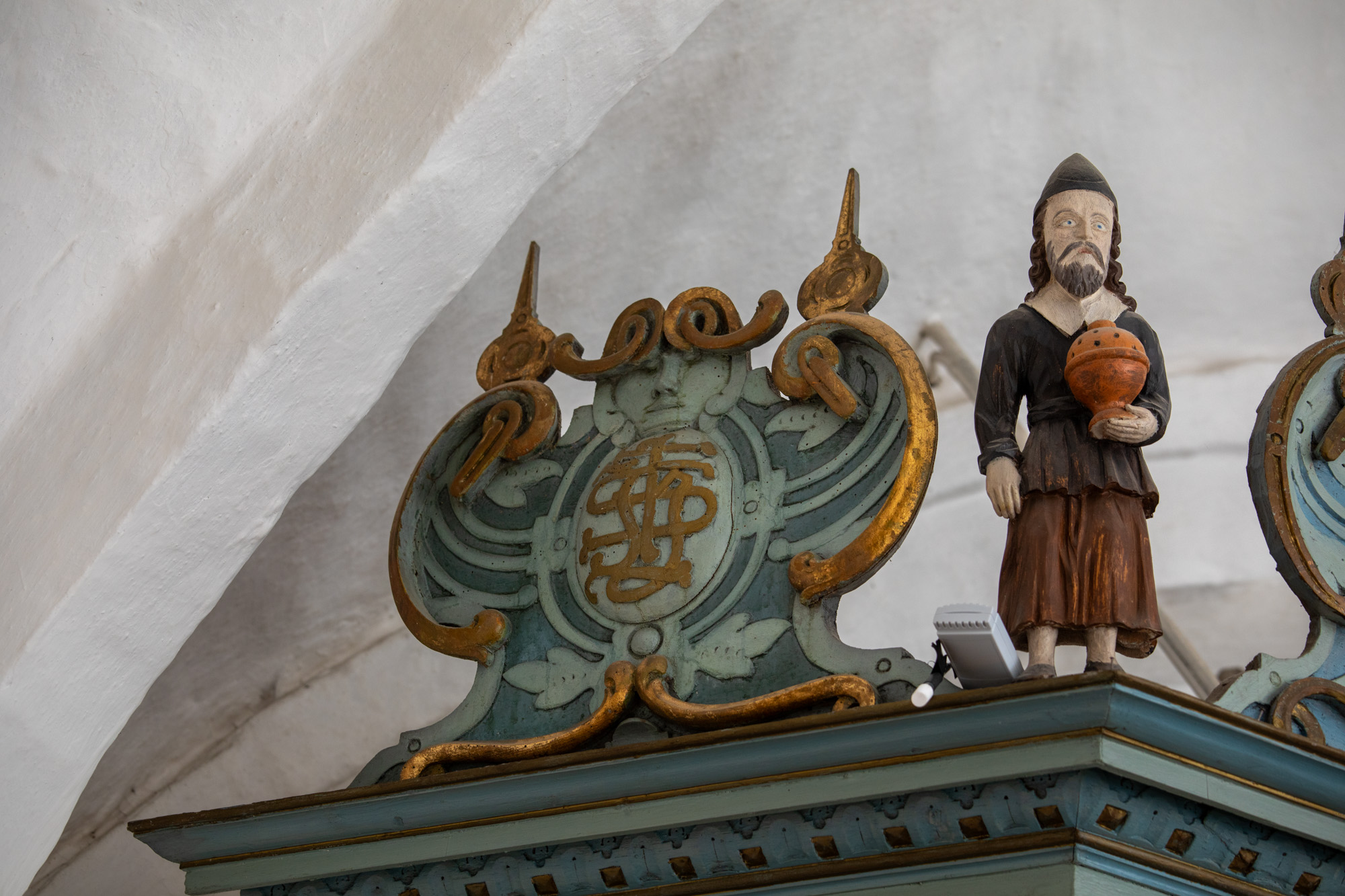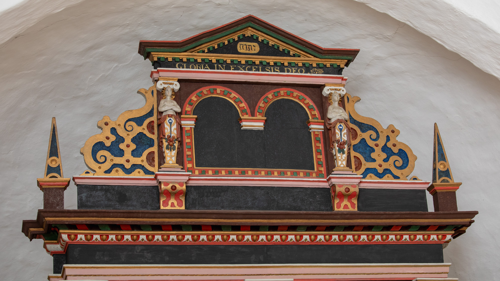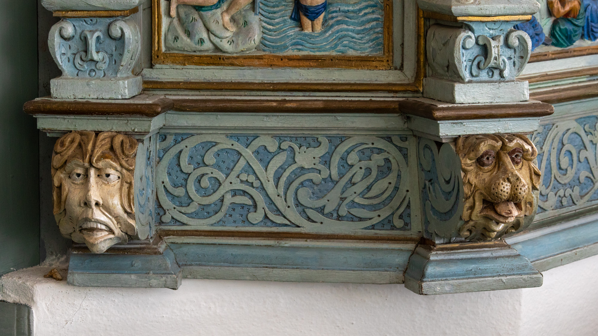 De øverste smalfelter er tomme, mens de nederste er udsmykket med ranker. Konsollerne har løvemasker. Lydhimlen har kartoucher med Kristusmonogrammer. På underkanten hænger fire basunblæsende engle.