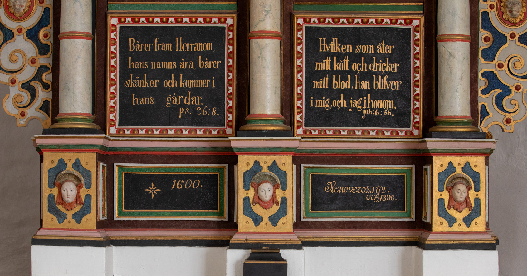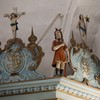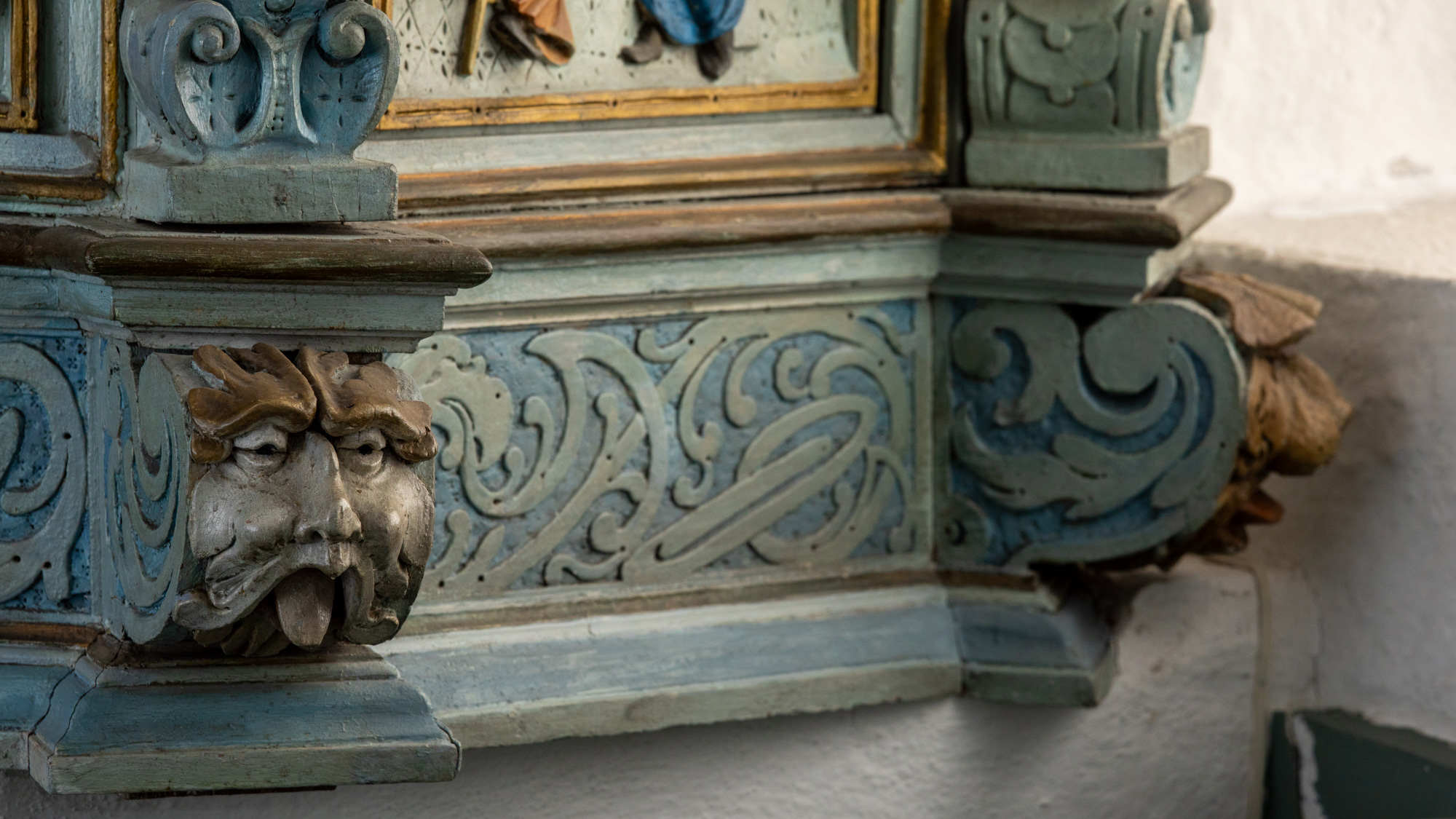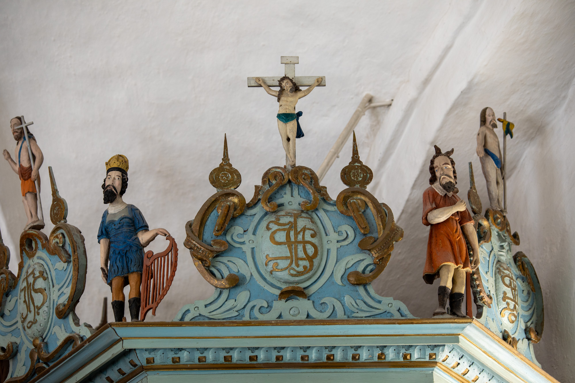 De øverste smalfelter er tomme, mens de nederste er udsmykket med ranker. Konsollerne har løvemasker. Lydhimlen har kartoucher med Kristusmonogrammer. På underkanten hænger fire basunblæsende engle.