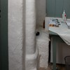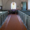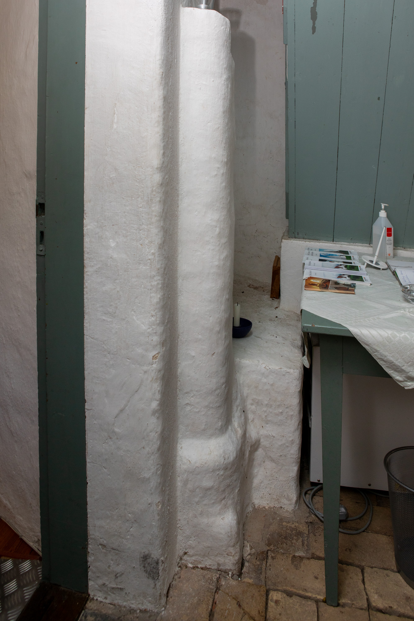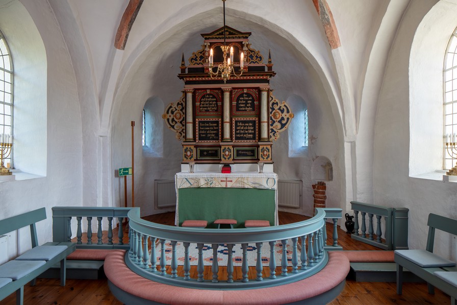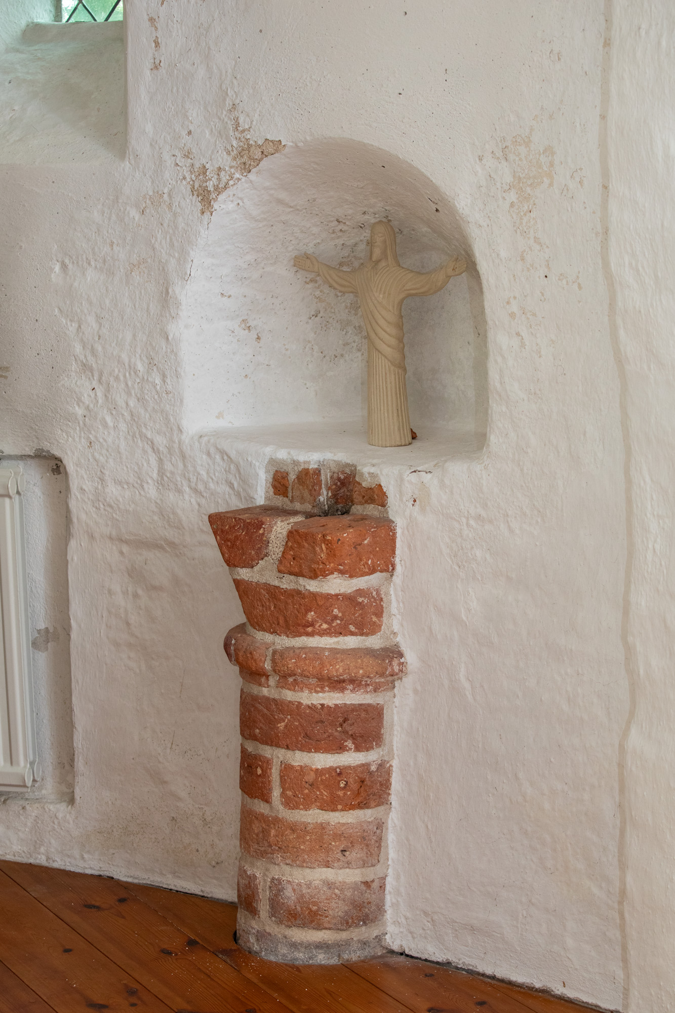 I apsis’ sydside er en rundbuet fordybning og foran den en halvsøjle til udtømning af vand ved altertjenesten.