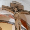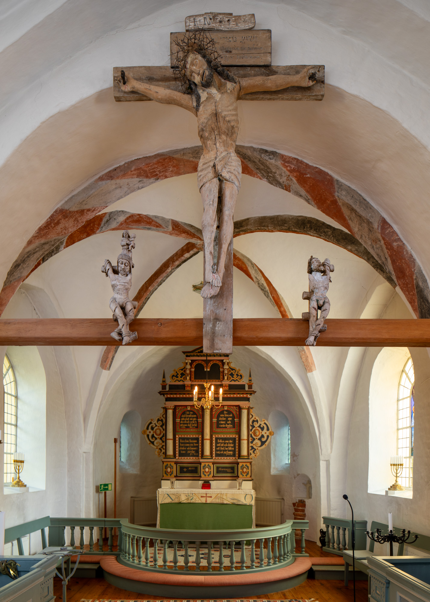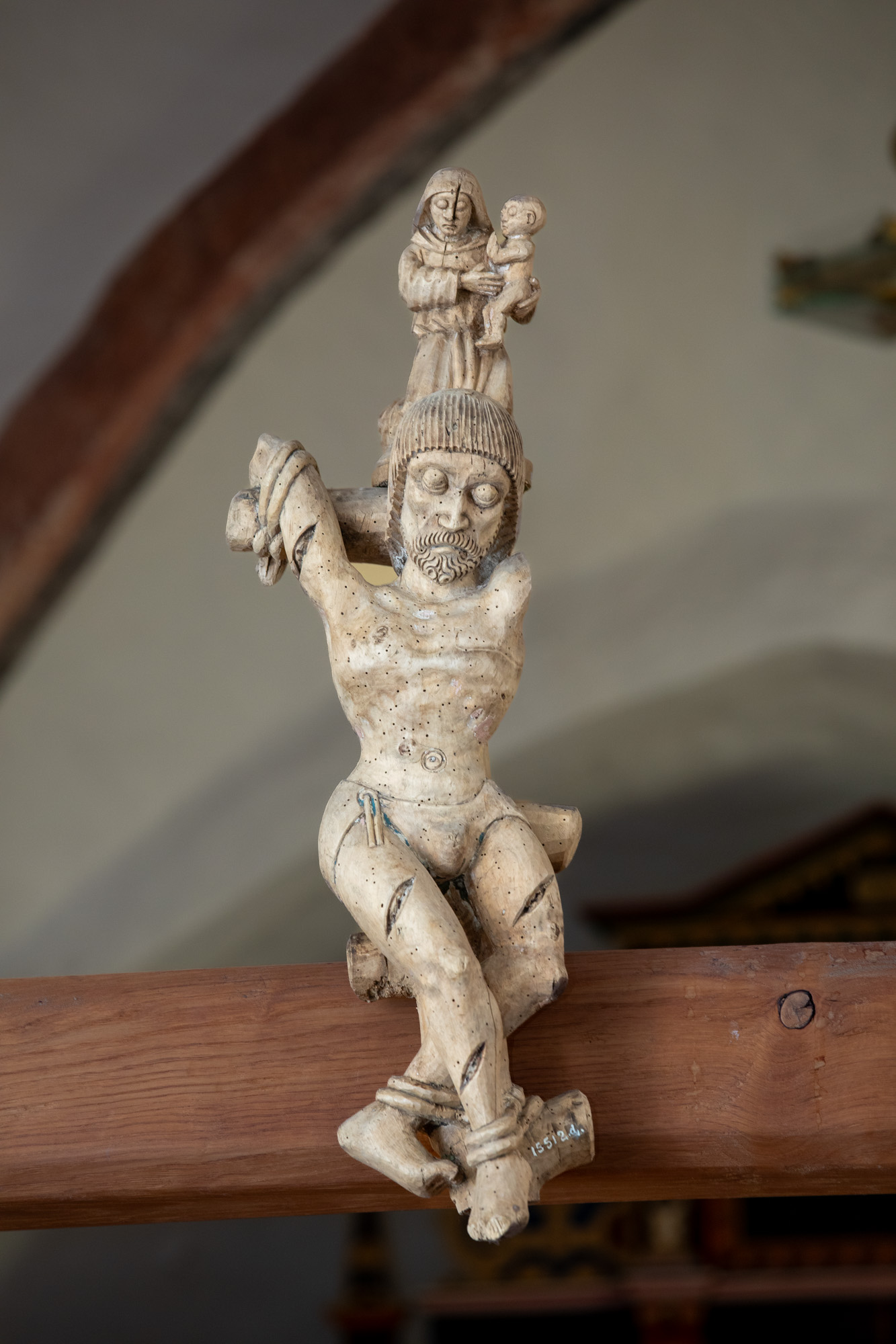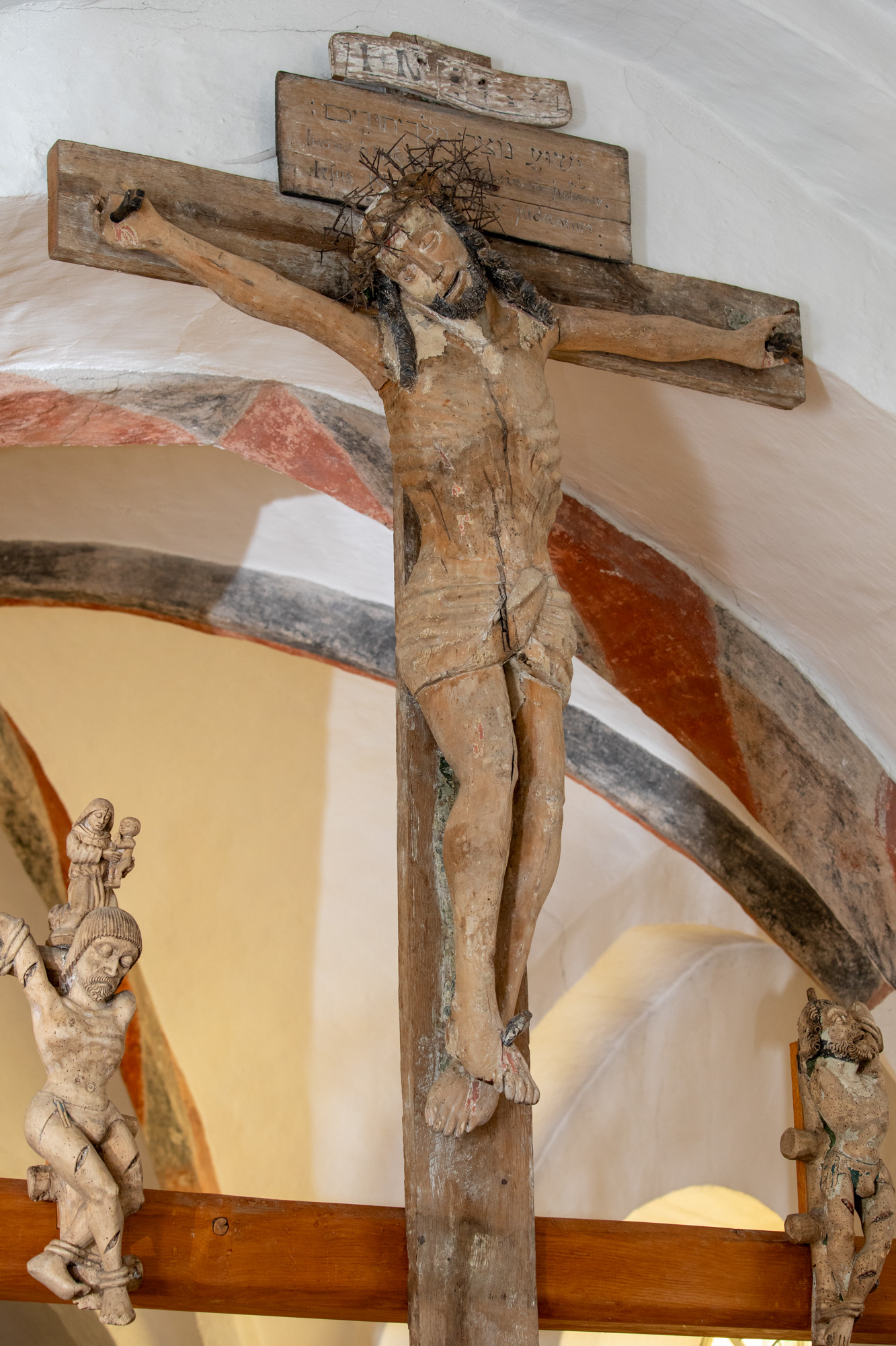 Kors fra 1200-tallet eller måske før. Korset er lavet af kobber og har spor af forgyldning. Kristus har en korsglorie. Armene er udstrakt næsten horisontalt og hænderne åbne med lige fingre. Lændeklædet er knælangt. Benene er parallelle, og fødderne er drejet ud til venstre henholdsvis højre. Øverst i korset rækker Faderen hånden ned til Sønnen og peger på ham.