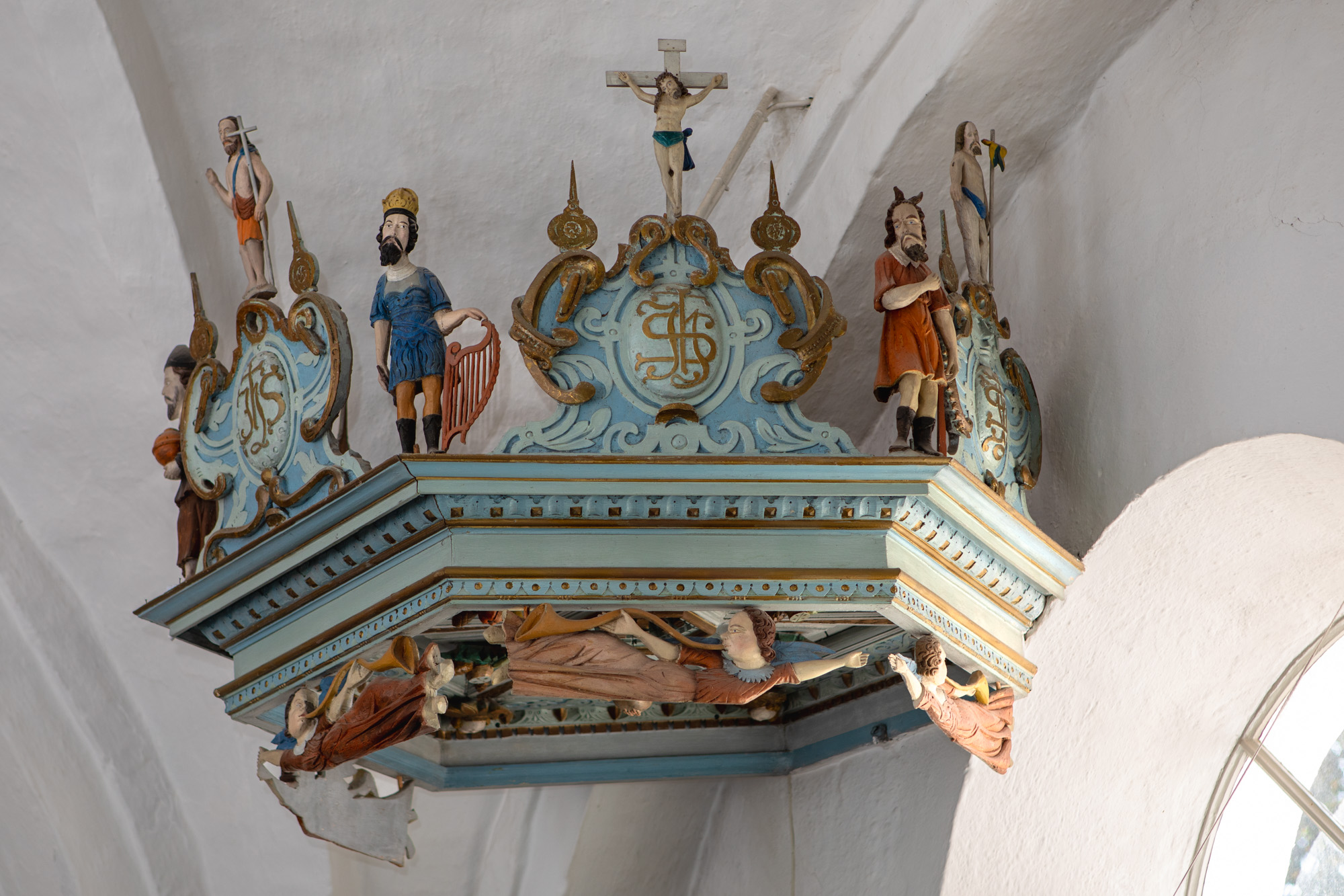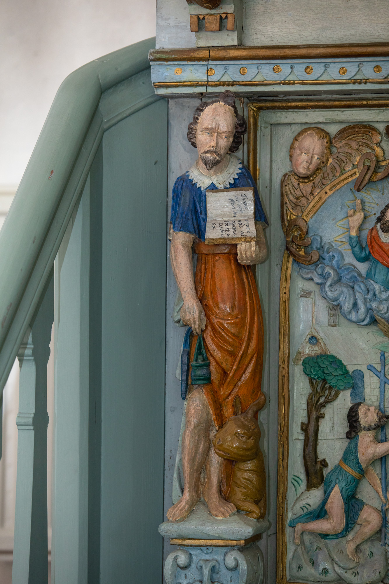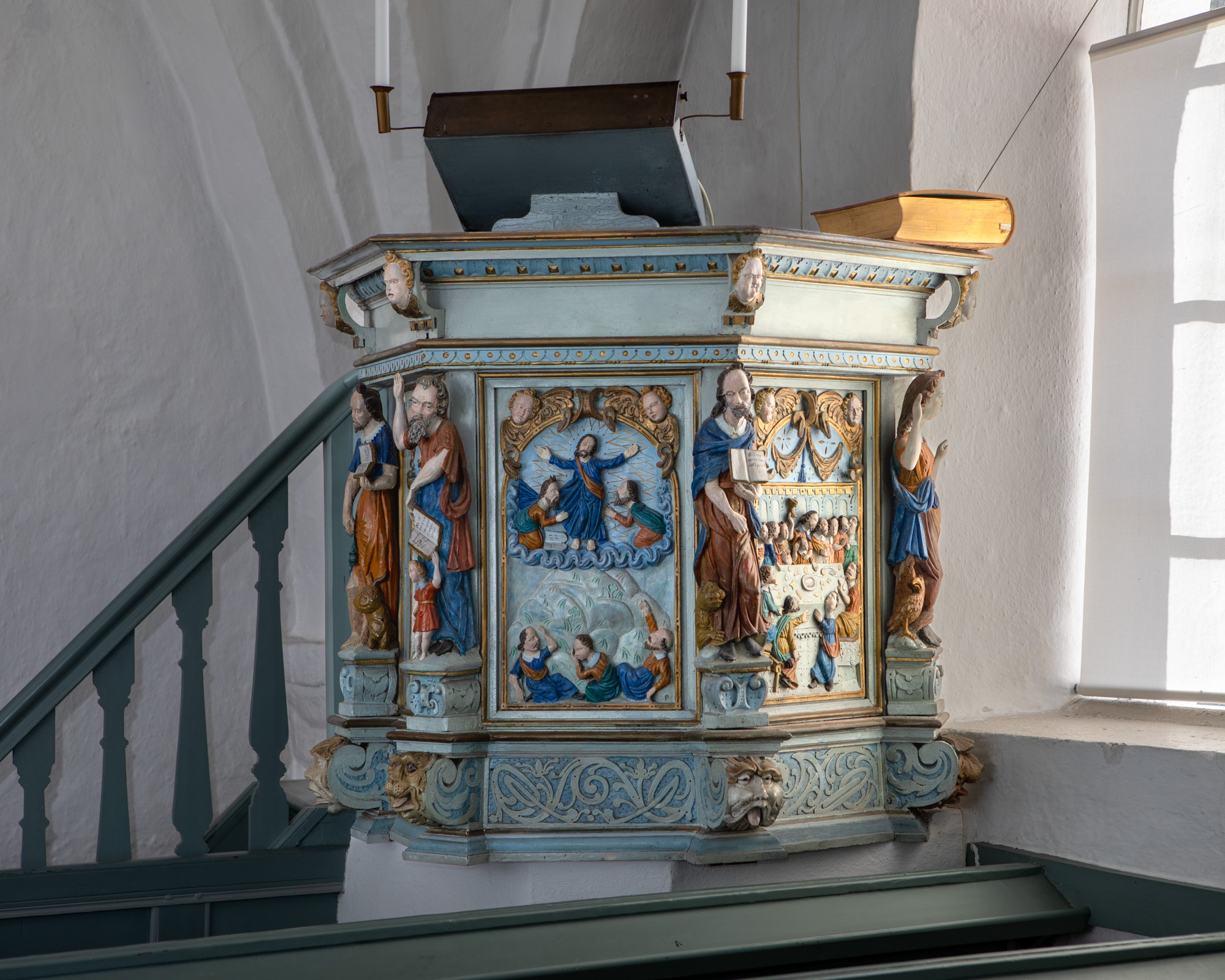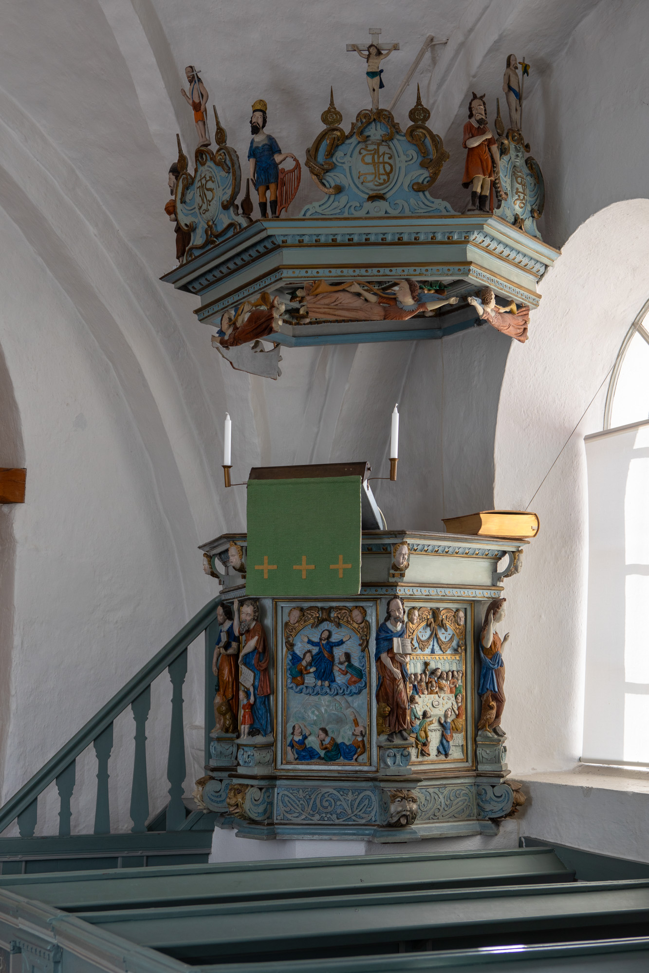 Prædikestolen er fra 1643. Storfelterne har relieffer med fremstilling af Jesu Dåb, Forklarelsen på Bjerget og Nadveren. Motiverne er indrammet af en tynd ramme med rundbue og englehoveder i sviklerne. I hjørnerne står evangelisterne på konsoller.