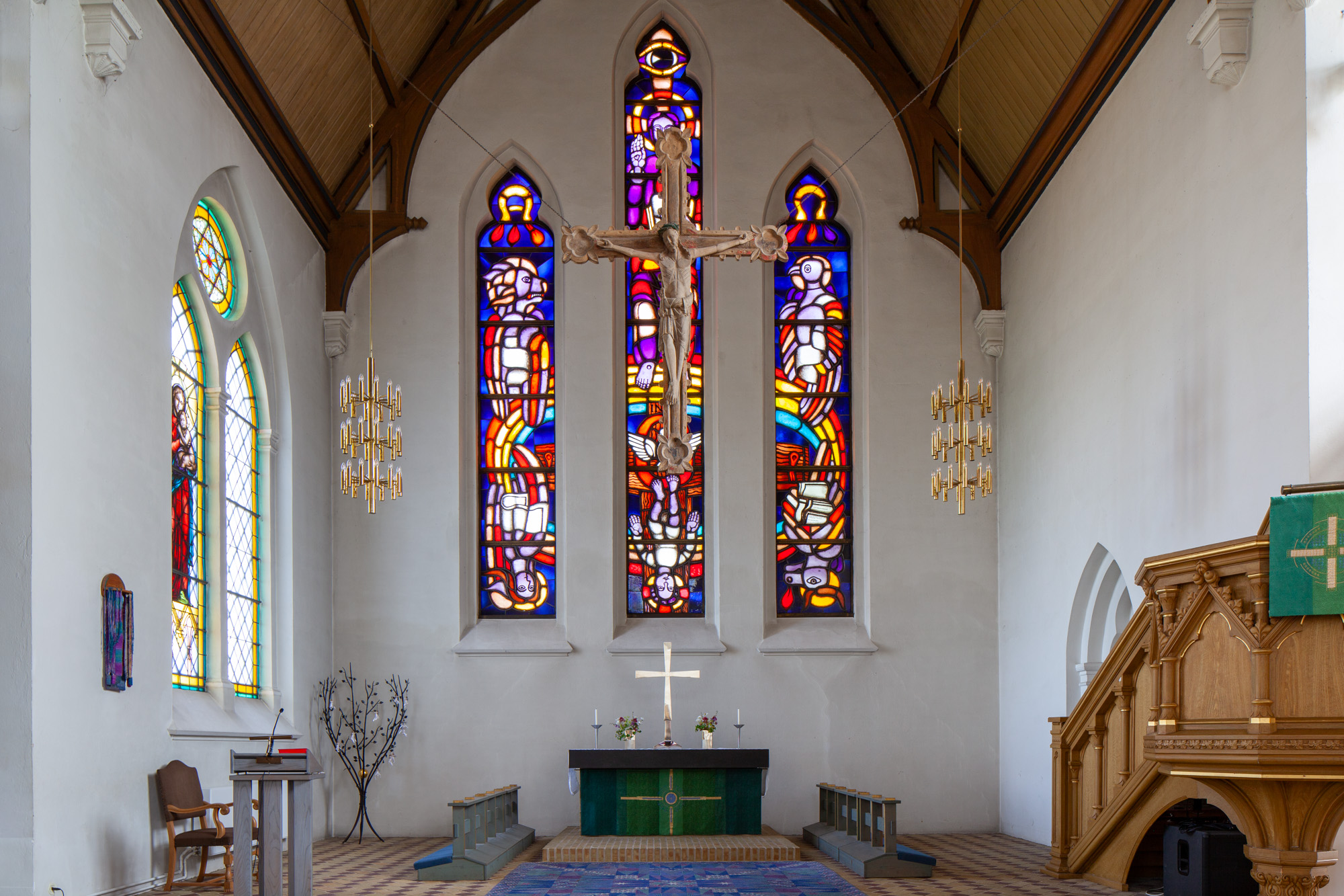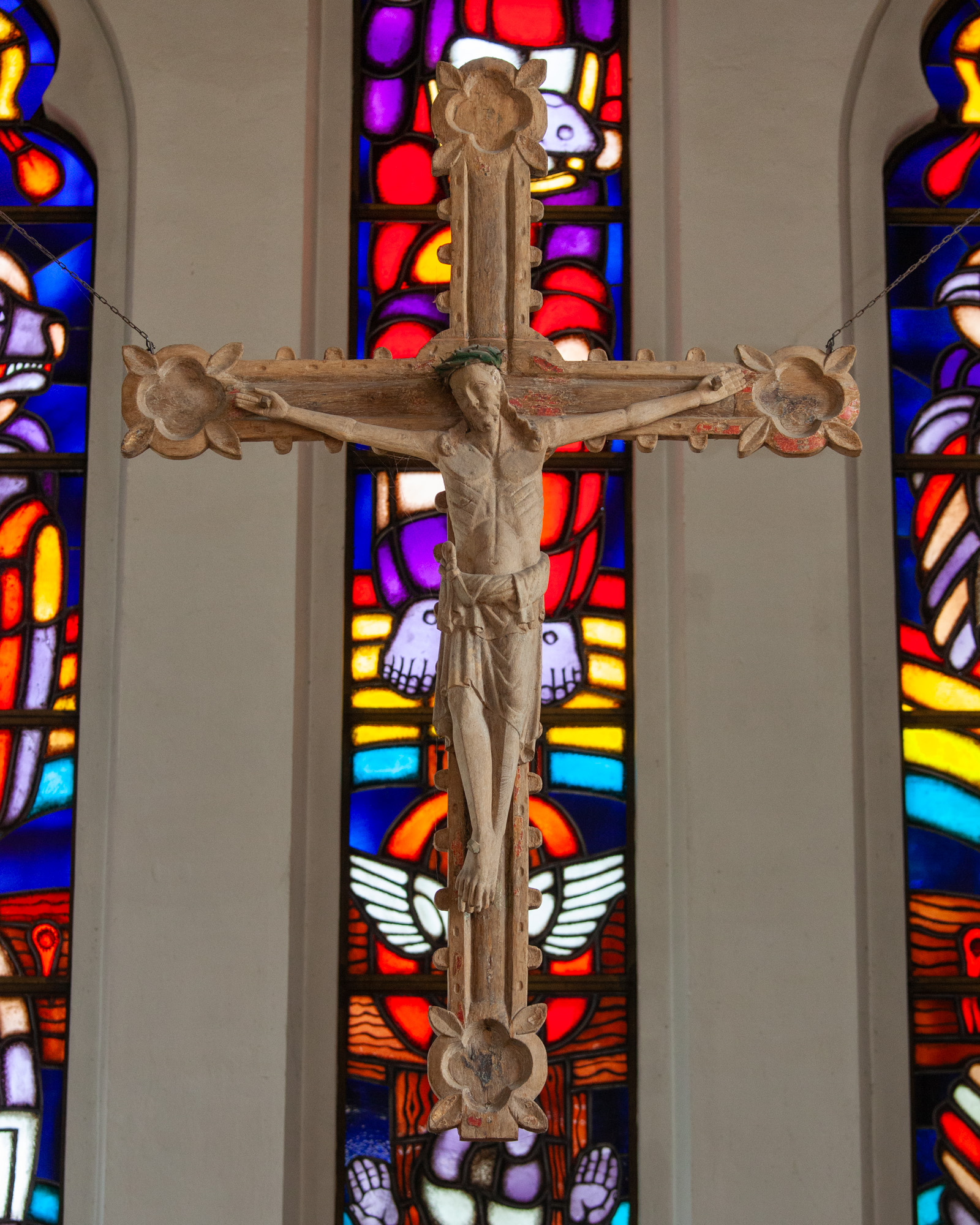 Krucifix fra o. 1250. Hovedet hælder nedad mod højre og har en tornekrone. Brystkassen er skematisk fremstillet. Arme og fingre er udstrakte. Lændeklædet, der går ned til knæene har en kraftig vulst om midjen og en stor knude i højre side. Det minder om krucifixet i Kieby. Højre fod er lagt ind over venstre. Korset har knopper med firpasformede endeplader.