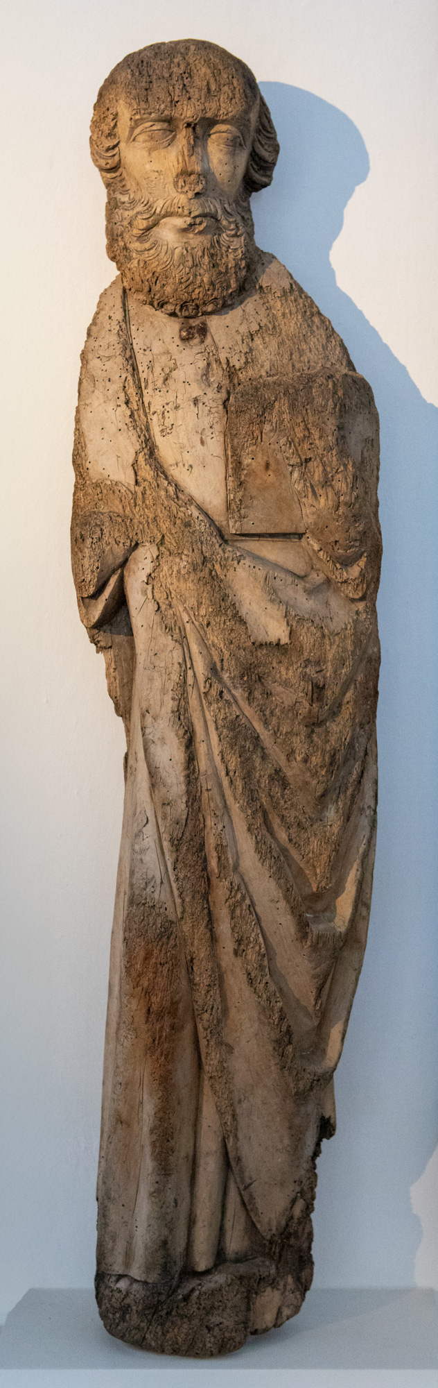 Figuren holder en bog i venstre hånd, men er ellers uden attributter, der kan identificere ham.