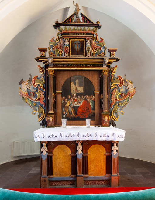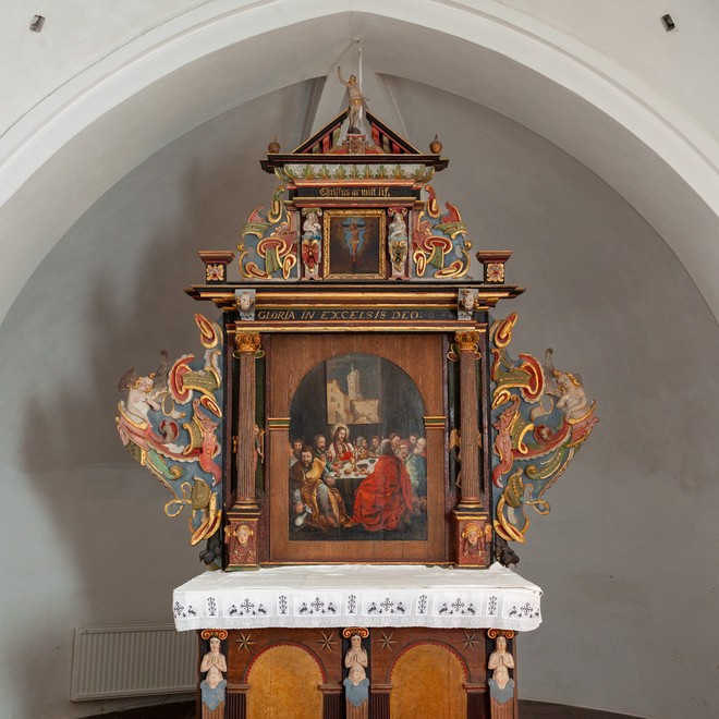 Altertavlen er fra 1600-tallet. Storstyket har et nadverbillede i en rundbue. Det er det oprindelige billede, som blev fremdraget i 1938, da man fjernede et billede fra en senere tid. Dette billede er nu ophængt i nordre korsarm. Vingerne er udsmykket med bruskornament. To fritstående søjler med riflede skafter står på fremskudte konsoller og bærer gesimsen med topstykket. Det centrale i topstykket er et lille korsfæstelsesbillede flankeret af to hermer og forsynet med vinger. Øverst en gennembrudt gavl med den opstandne.