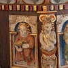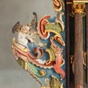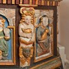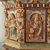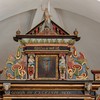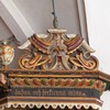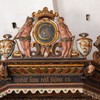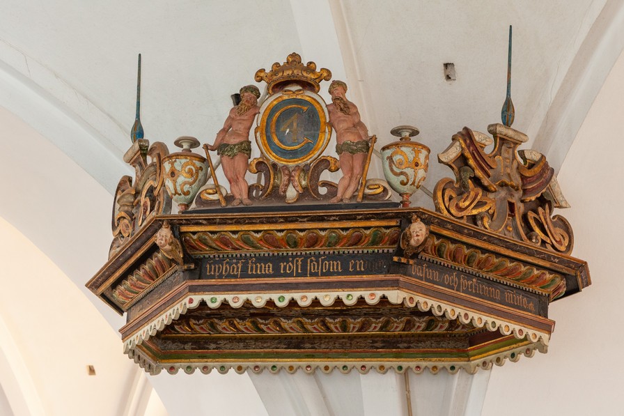 På lydhimlen ses foruden masker og bruskornamentik Christian IV’s monogram. Det blev senere overmalet med Carl XI’s og derefter Gustav III’s monogrammer, inden det oprindelige blev fremdraget.