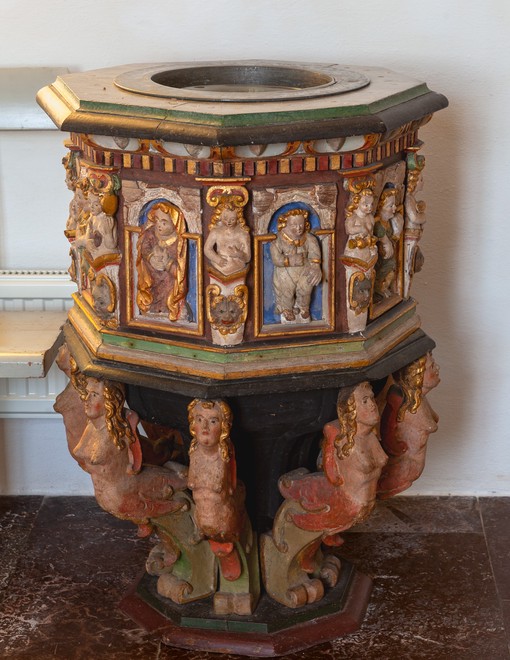 Døbefonten, som er fra første halvdel af 1600-tallet, er inspireret af Daniel Tommisens døbefont i Malmø Sankt Petri kirke. Hermerne fremstiller dyder.