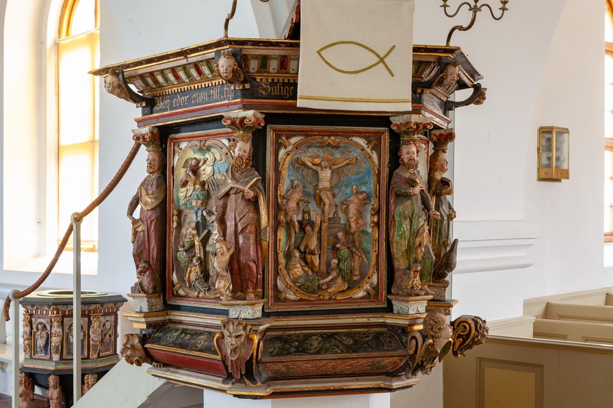 Prædikestolen skal være fra 1640. Kurven har fire sider. Heraf er der relieffer i de tre: Jesus i Getsemane, Korsfæstelsen og Opstandelsen. I hjørnerne står evangelisterne.