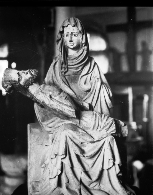 Maria er iklædt hovedtørklæde og kappe. Sønnen ligger på ryggen med ansigtet drejet udad. Tornekronen er omviklet.