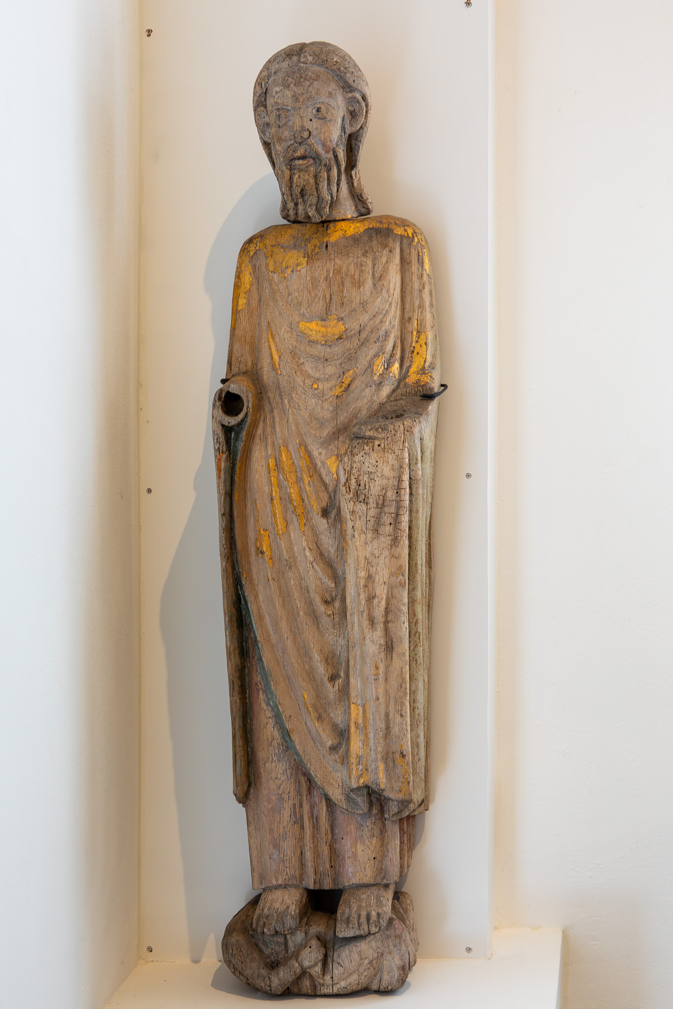 Mandlig helgen fra begyndelsen af 1200-tallet. På venstre arm er der rester af en attribut, som kan have været en bog. Han står på en menneskelig underligger, der ligger på ryggen. Hovedet er sekundært tilføjet, idet det oprindelige hoved er borte.