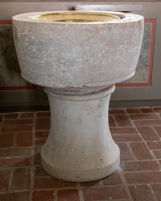 Døbefonten er af gotlandsk kalksten og har hverken udtømningshul eller fals. Profilen er svagt bøjet med en rundstav forneden. Foden er ikke den oprindelige. Det er uklart, hvordan den har set ud.