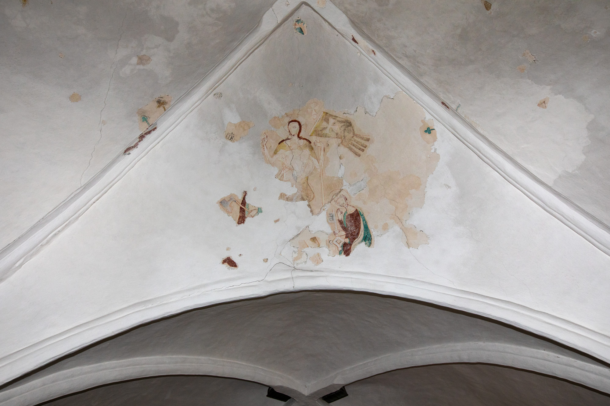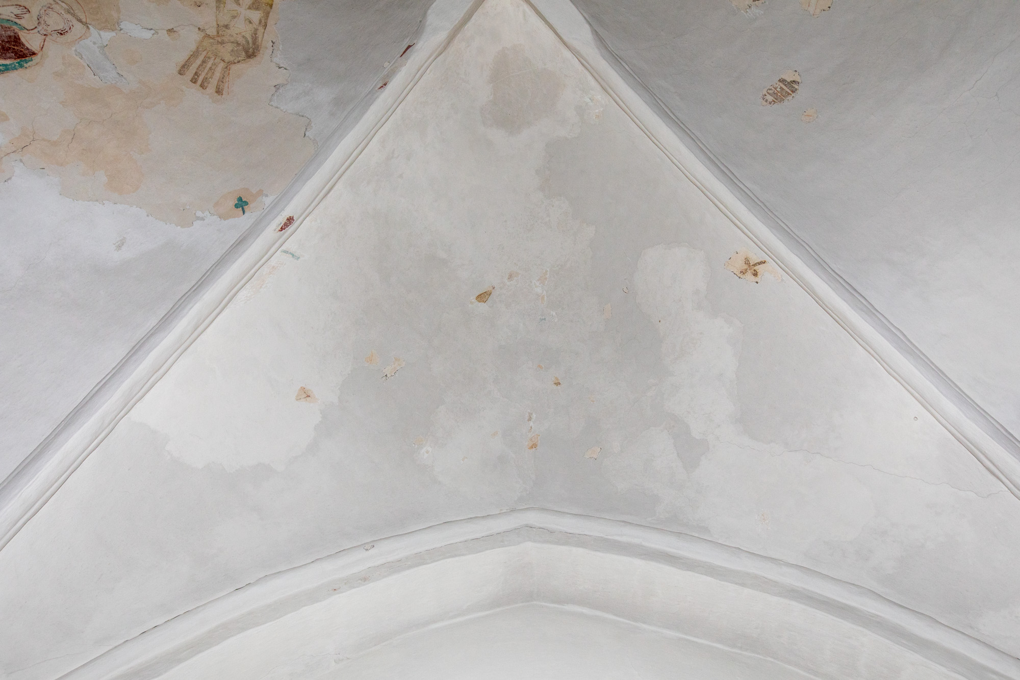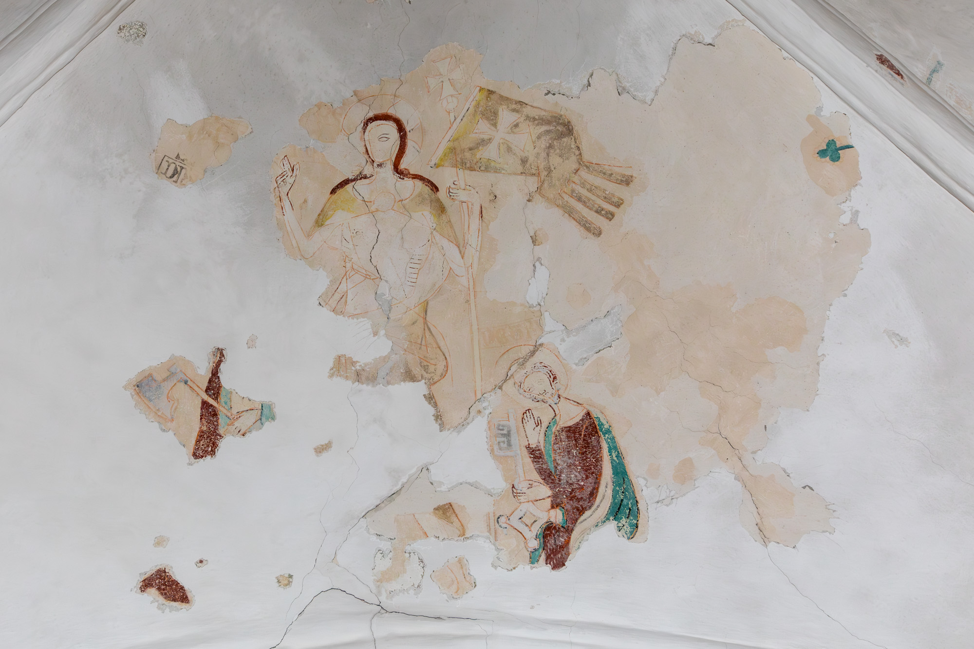 Fragmenterne er for små til, at man kan identificere motiverne. Men i vestkappen ses Kristus med sejrsfane. Både fanen og stangen, den sidder på, er forsynet med et kors, som i begge tilfælde er et georgskors. Kristus har korsglorie og løfter højre hånd velsignende. Han bærer en kappe, der holdes sammen midt for af et spænde, så den nøgne overkrop er synlig. Ribbenene er antydet med streger, og en hånd stikkes ind i sidesåret. Det må være Thomas, men kun hånden er synlig. Nedenfor er et fragment, der viser en hånd, der holder en økse. Det er Judas Thaddæus’ attribut. Et større fragment viser Peter med en meget stor nøgle. Et lille fragment viser et hjørne af et skriftbånd med to bogstaver. Motivet er sandsynligvis Den Opstandne, der åbenbarer sig for disciplene, Joh. 20,24-29. Det er et usædvanligt motiv i kalkmalerier.