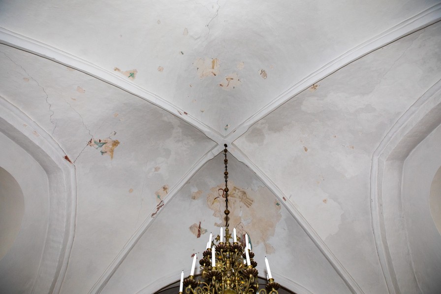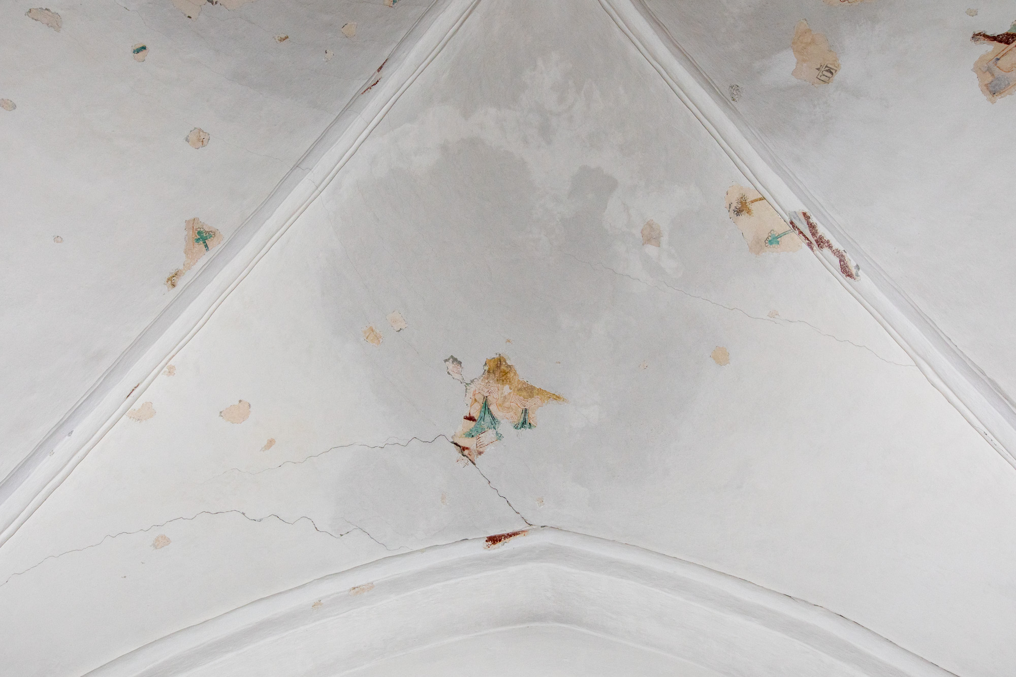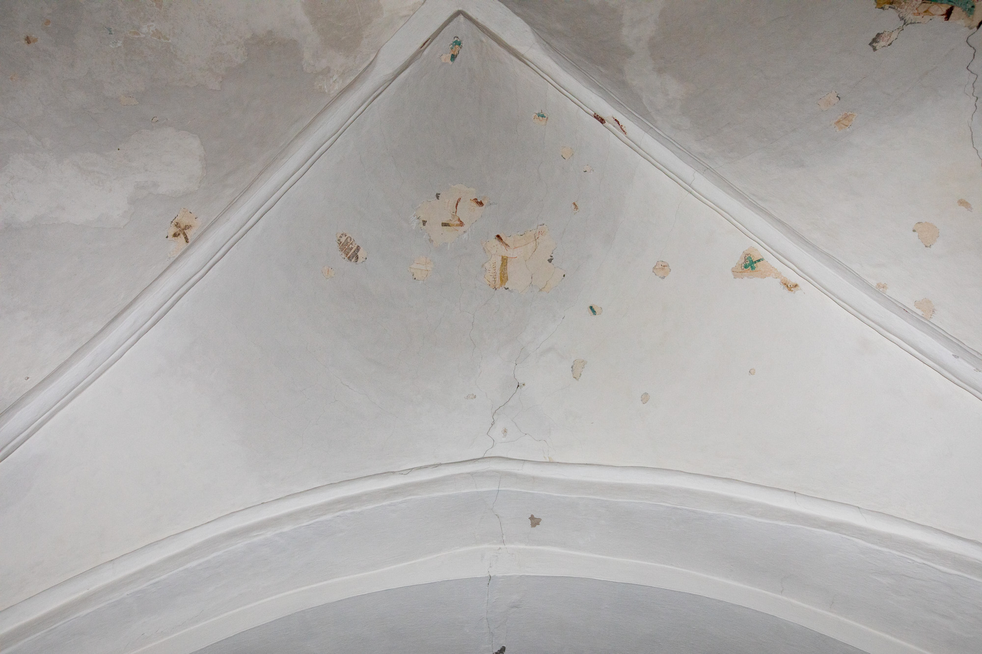 Fragmenterne er for små til, at man kan identificere motiverne. Men i vestkappen ses Kristus med sejrsfane. Både fanen og stangen, den sidder på, er forsynet med et kors, som i begge tilfælde er et georgskors. Kristus har korsglorie og løfter højre hånd velsignende. Han bærer en kappe, der holdes sammen midt for af et spænde, så den nøgne overkrop er synlig. Ribbenene er antydet med streger, og en hånd stikkes ind i sidesåret. Det må være Thomas, men kun hånden er synlig. Nedenfor er et fragment, der viser en hånd, der holder en økse. Det er Judas Thaddæus’ attribut. Et større fragment viser Peter med en meget stor nøgle. Et lille fragment viser et hjørne af et skriftbånd med to bogstaver. Motivet er sandsynligvis Den Opstandne, der åbenbarer sig for disciplene, Joh. 20,24-29. Det er et usædvanligt motiv i kalkmalerier.
