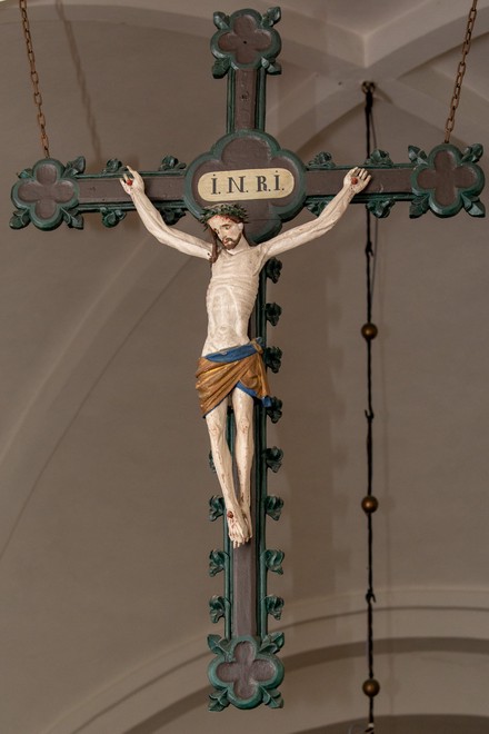 Kroppen hænger i en bue mod højre. Hovedet er bøjet fremad mod højre. Tornekronen er snoet med store pigge. Armene er med blodårer og sener og løftet diagonalt opad. Der er ikke noget sidesår. Lændeklædet er bundet i venstre side. Højre fod er lagt ind over venstre, og begge er bøjet nedad.