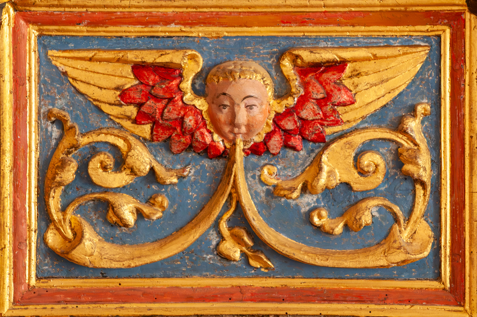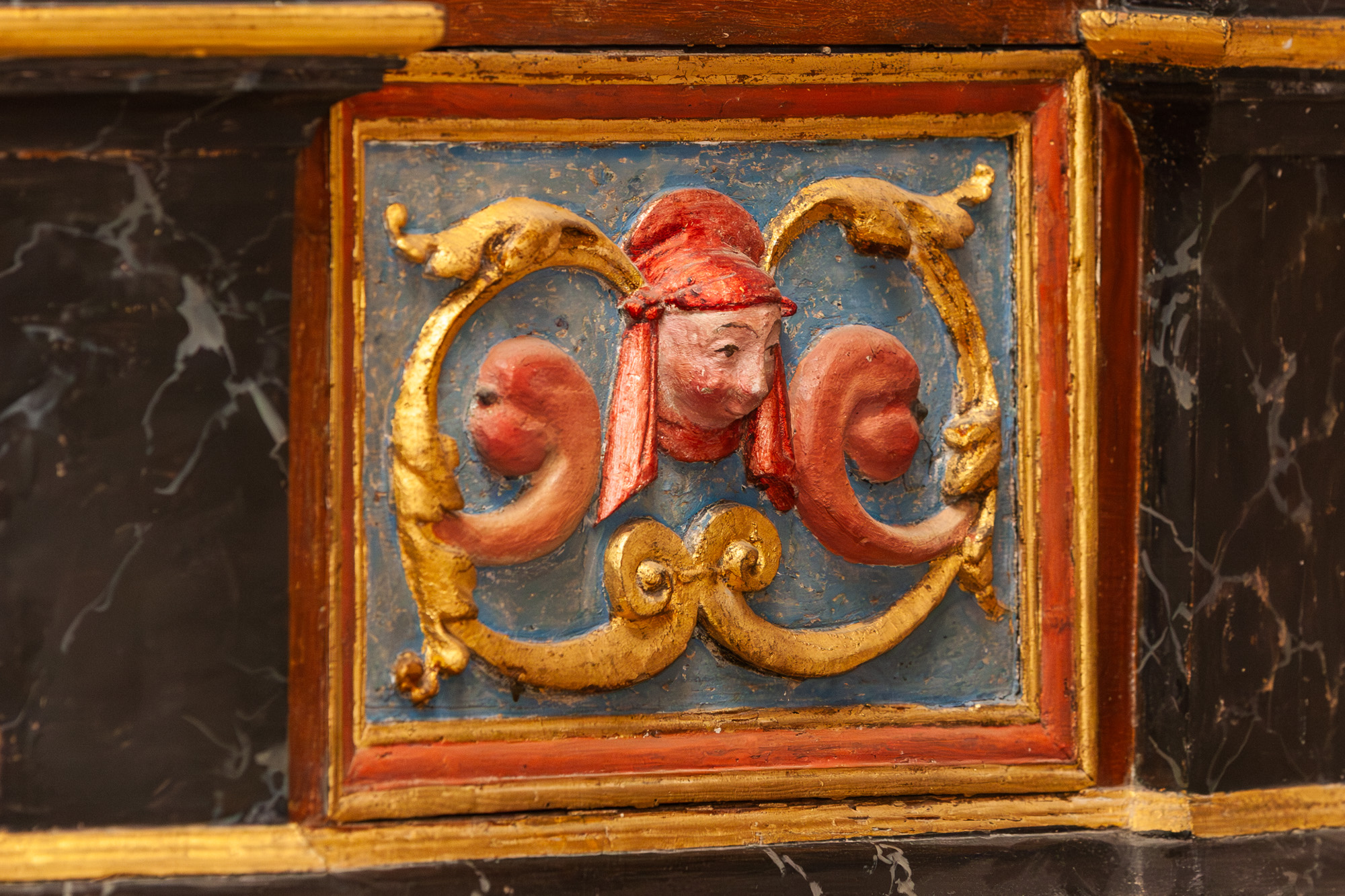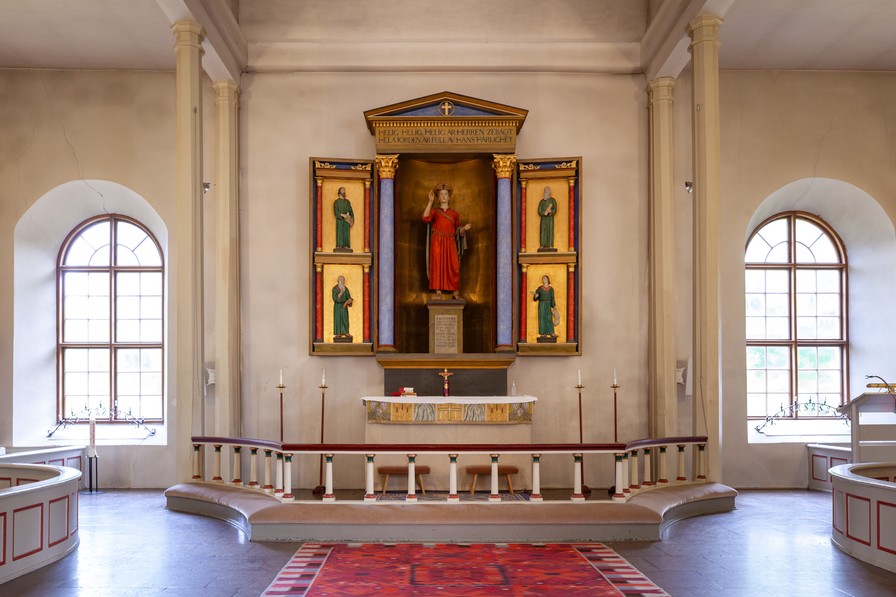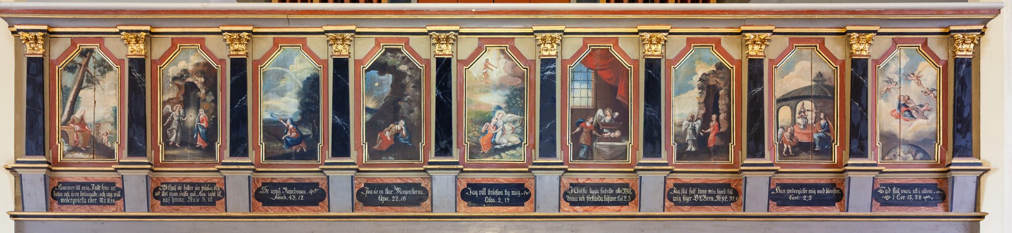 Prædikestolen er fra 1592 med senere ændringer. Den er skænket af Lene Thott, enke efter kirkens patron Henrik Brahe til Vidskøvle. Den havde oprindelig intarsiaindlæg af mahogni og ibenholt. Ved en restaurering 1926 opdagede man et enkelt felt med intarsia. Billederne i storfelterne er fra 1740’erne ligesom døren.
