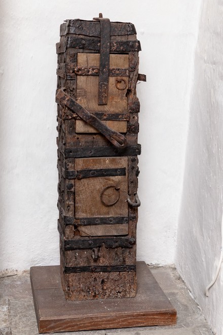 Kassse til indsamling af kollekt fra middelalderen. Kassen har et håndtag af hjortehorn. Bagstykket forestiller en kamtakket gavl. Foran den sidder Gud Fader på en stol under den midterste af tre buer, som danner en baldakin. Den bæres af to søjler og er prydet med tre små spidser med en riflet knop. Faderen er klædt i en fodlang foldet dragt og bærer en krone på hovedet. Med højre arm tager han om Sønnen, som er iført en rød kjortel og grønne bukser eller strømper, og som rækker ud efter et æble – sikkert rigsæble, som Faderen holder i venstre hånd.