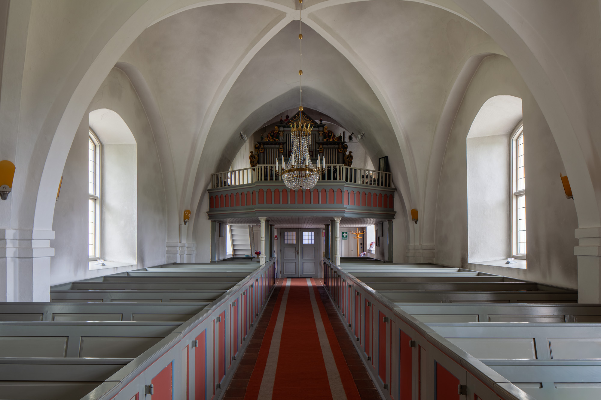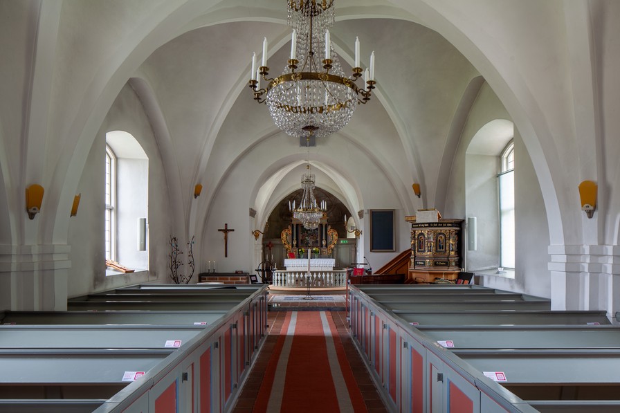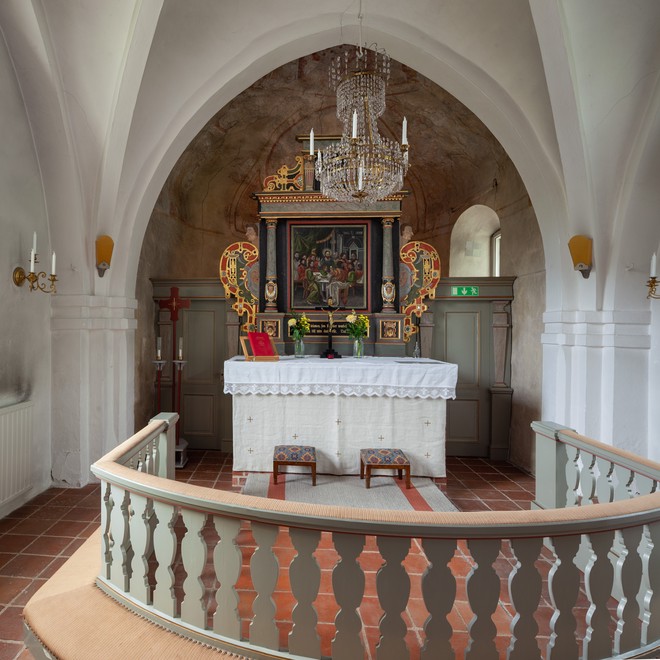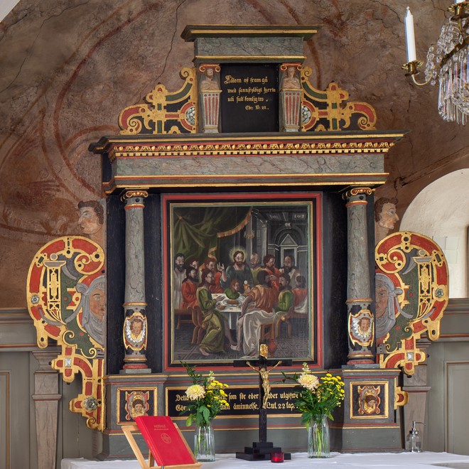 Altertavlen er udført i renæssancestil af Johan Ullberg 1749.