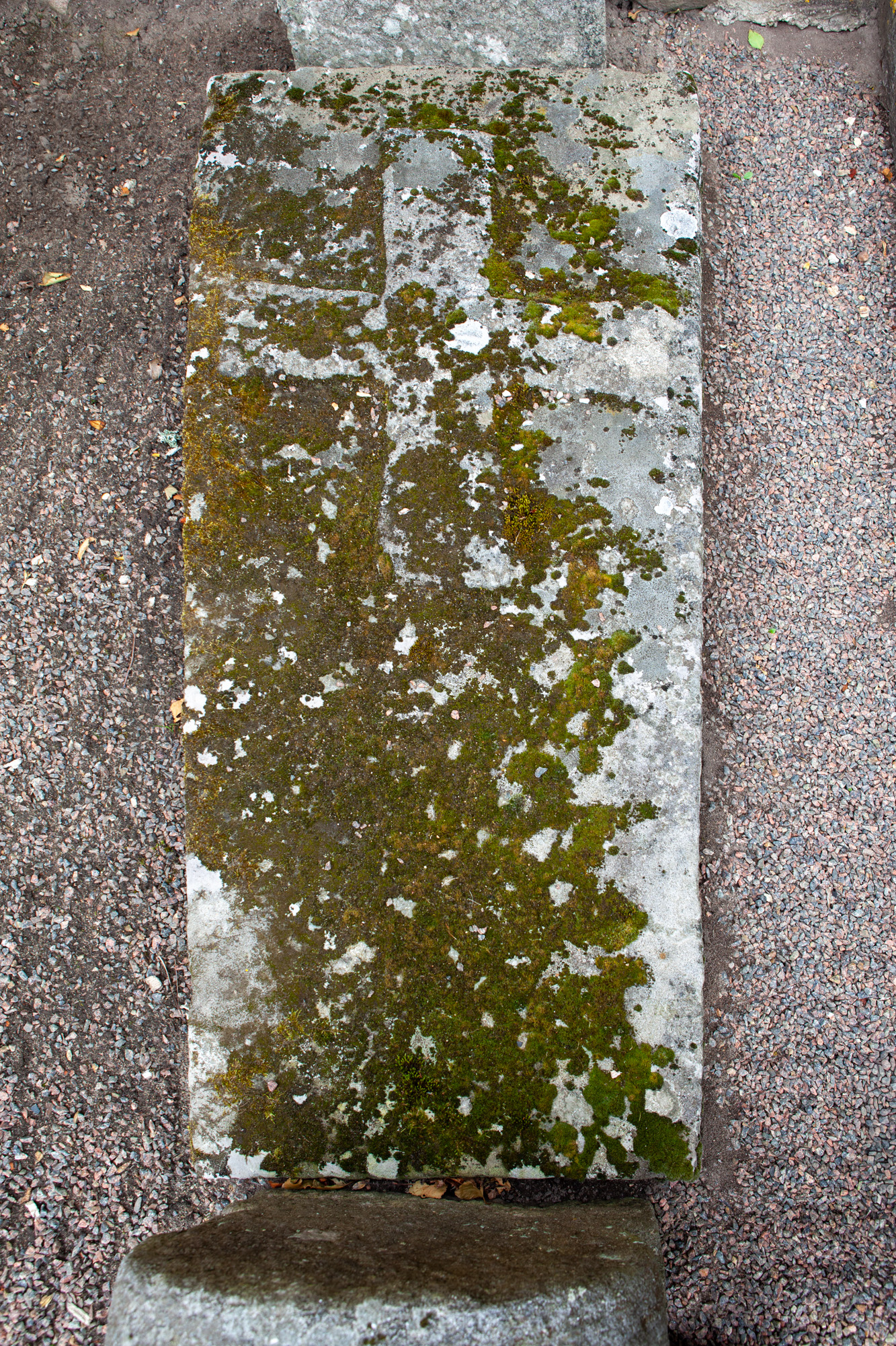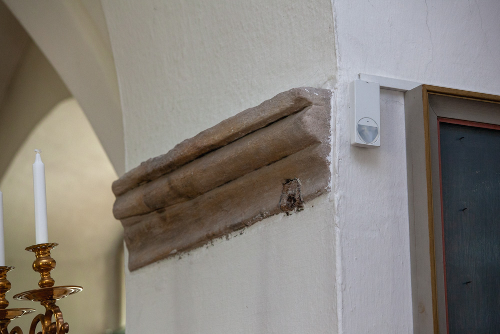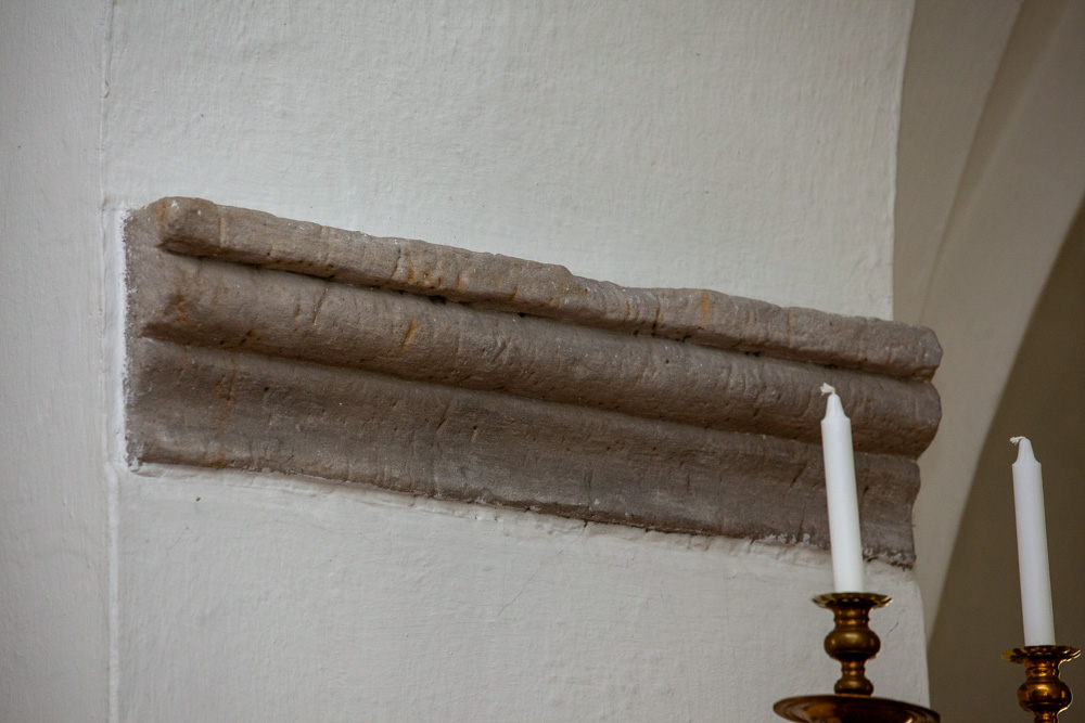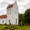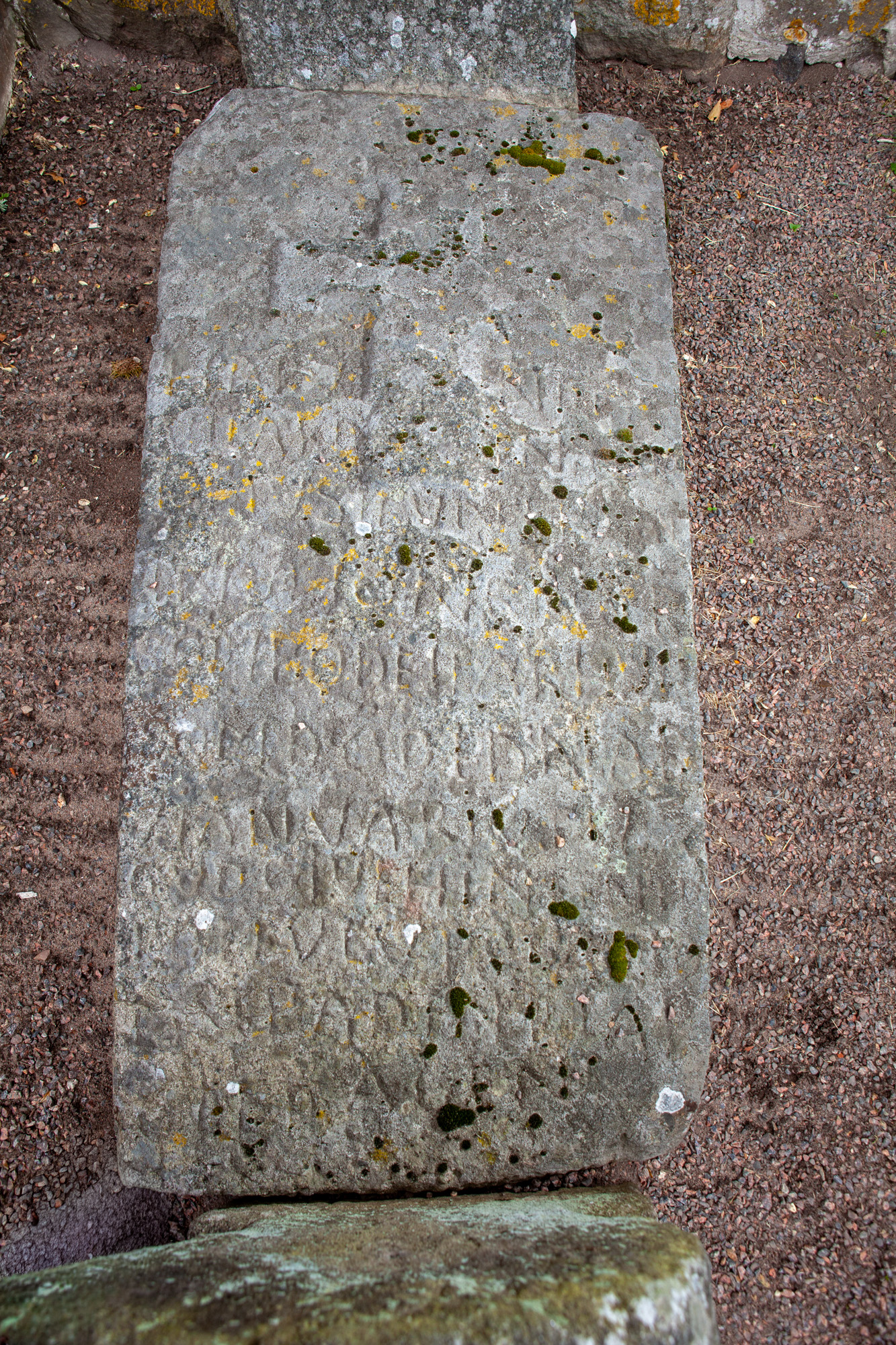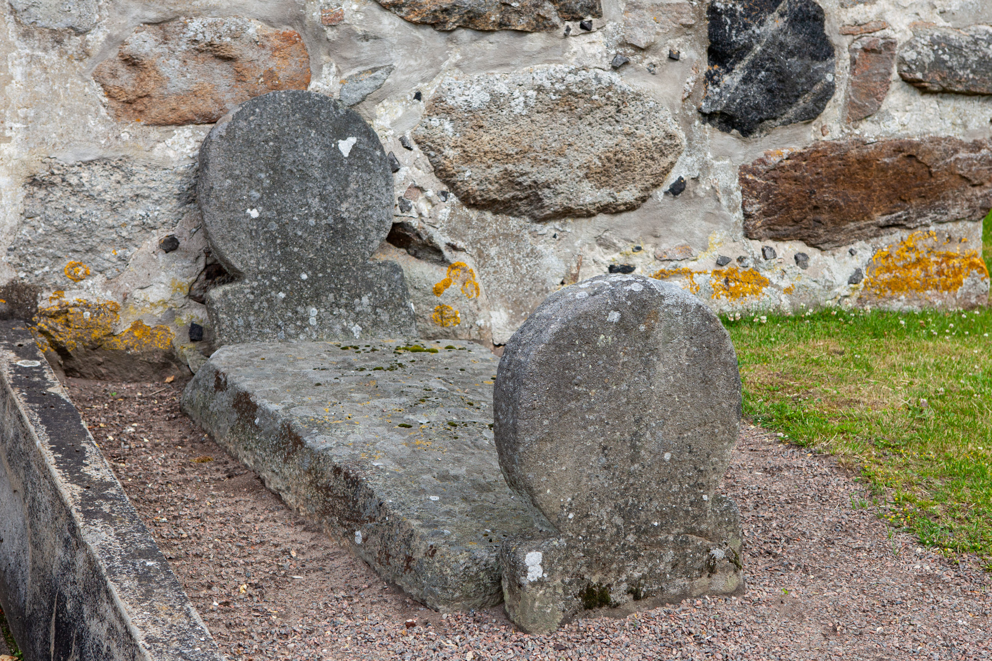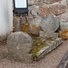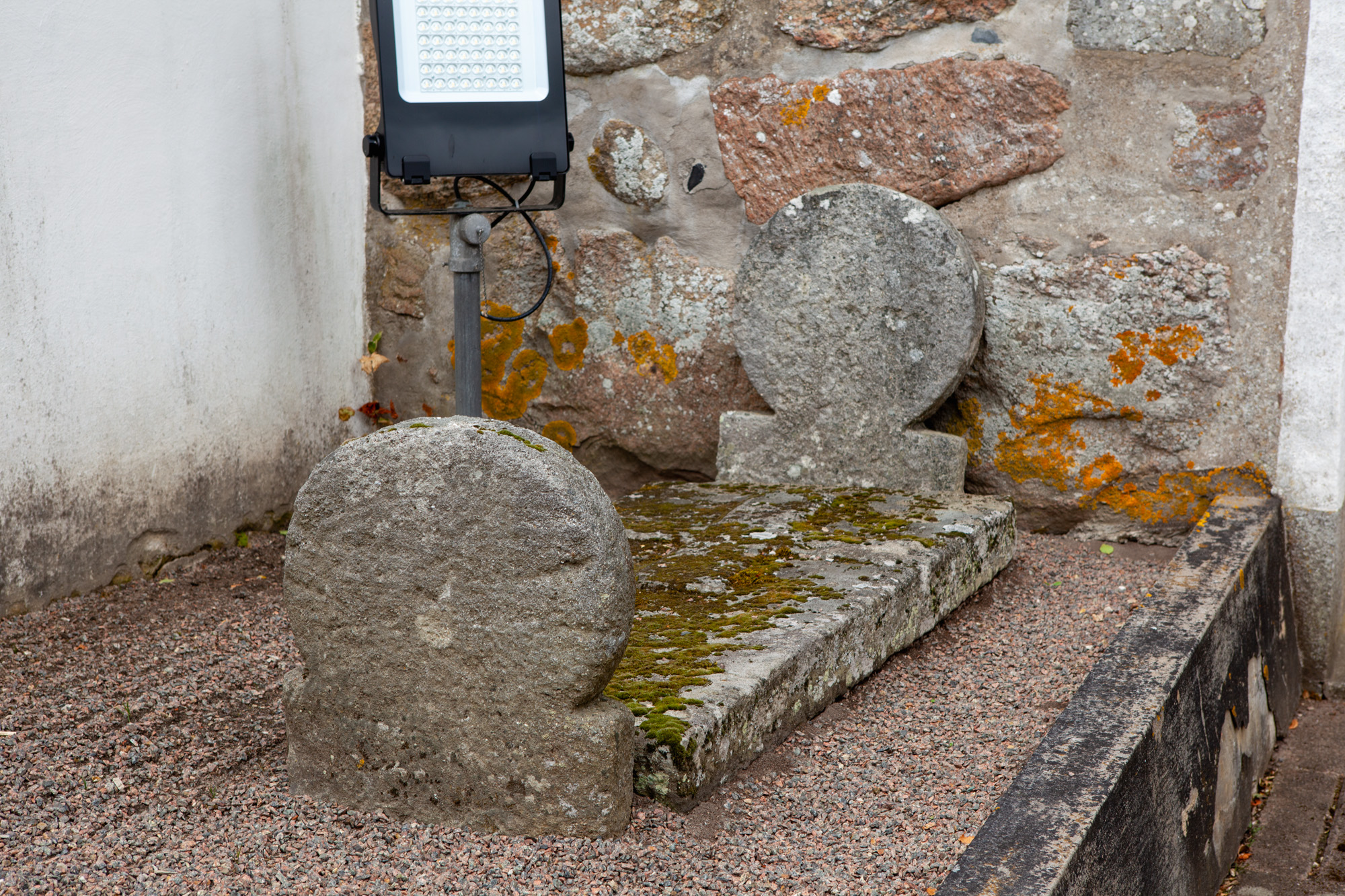 Lige udenfor kirken ligger to romanske gravsten, som begge har gavlsten. Indskriften på den ene sten viser, at den har været genanvendt.
