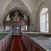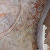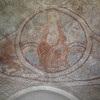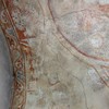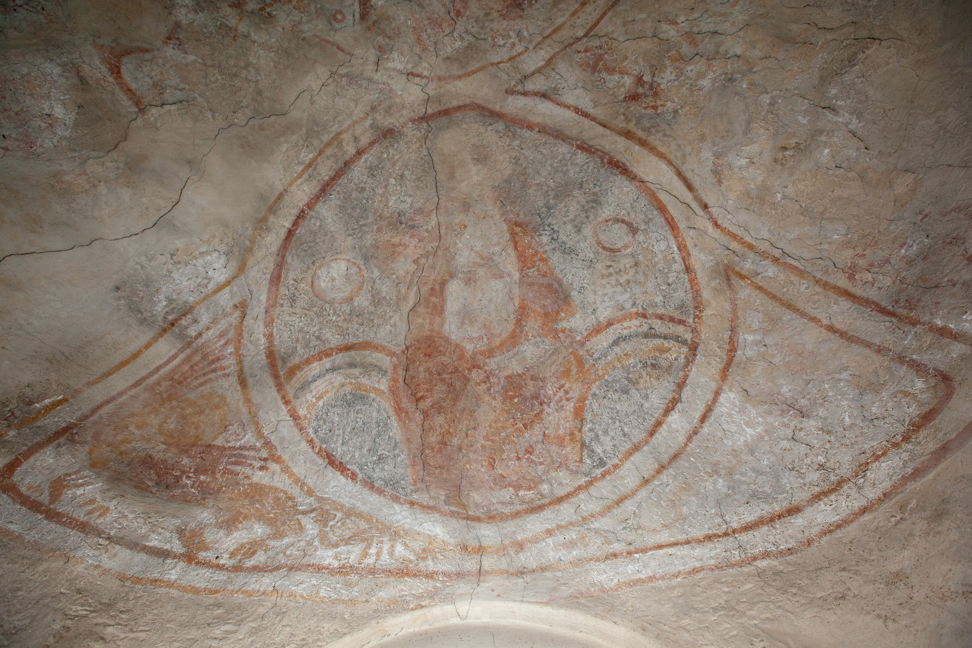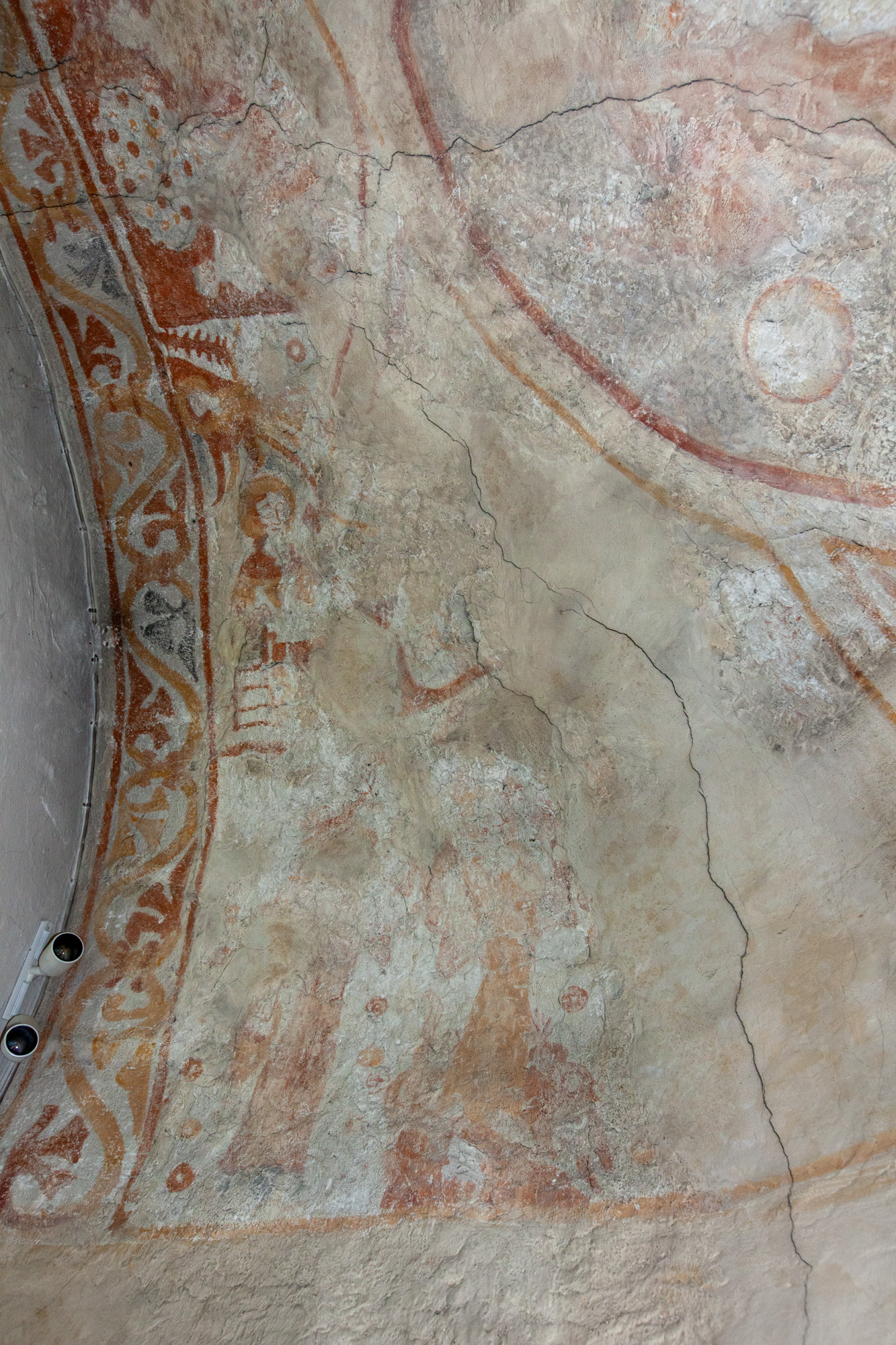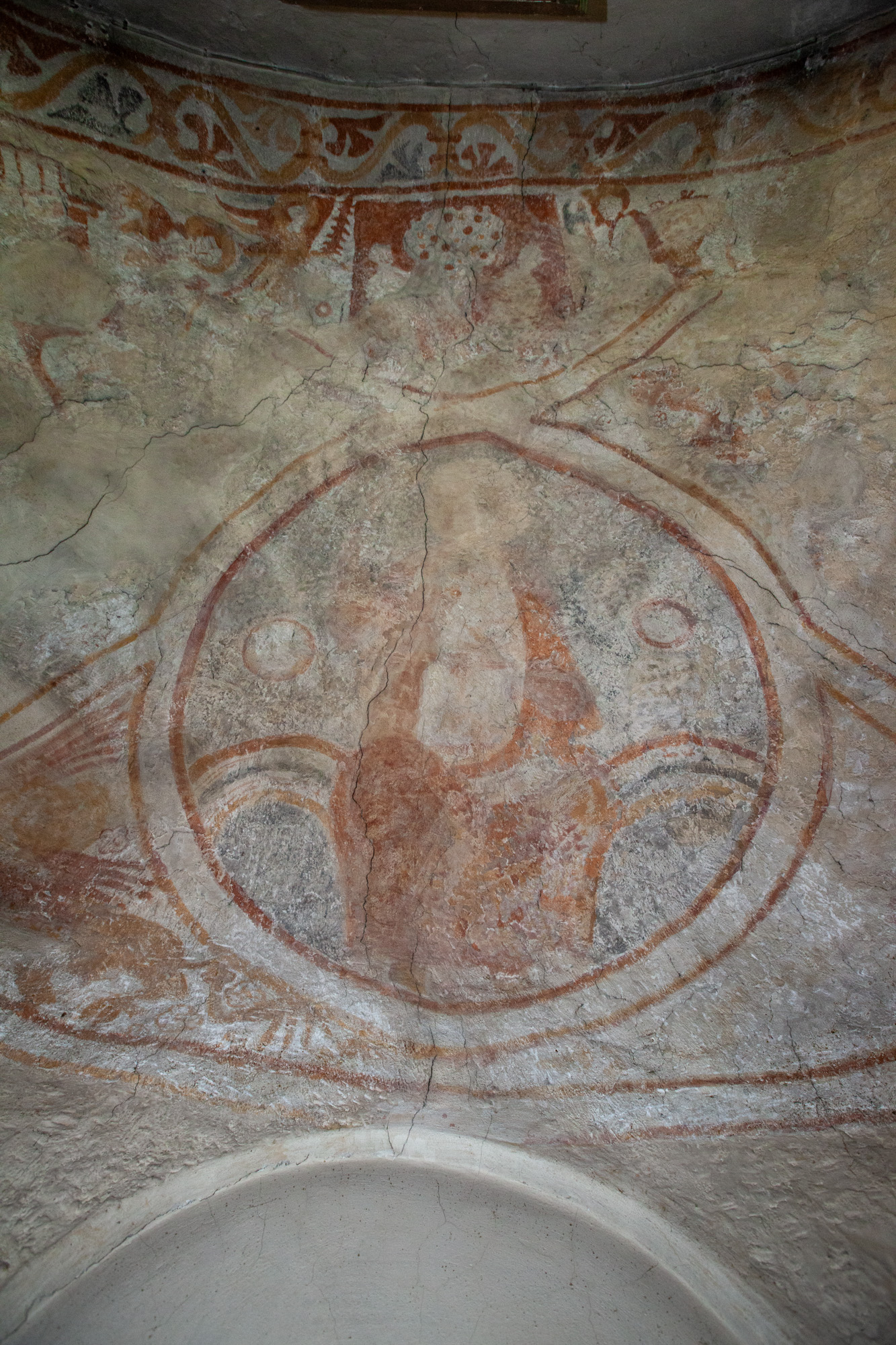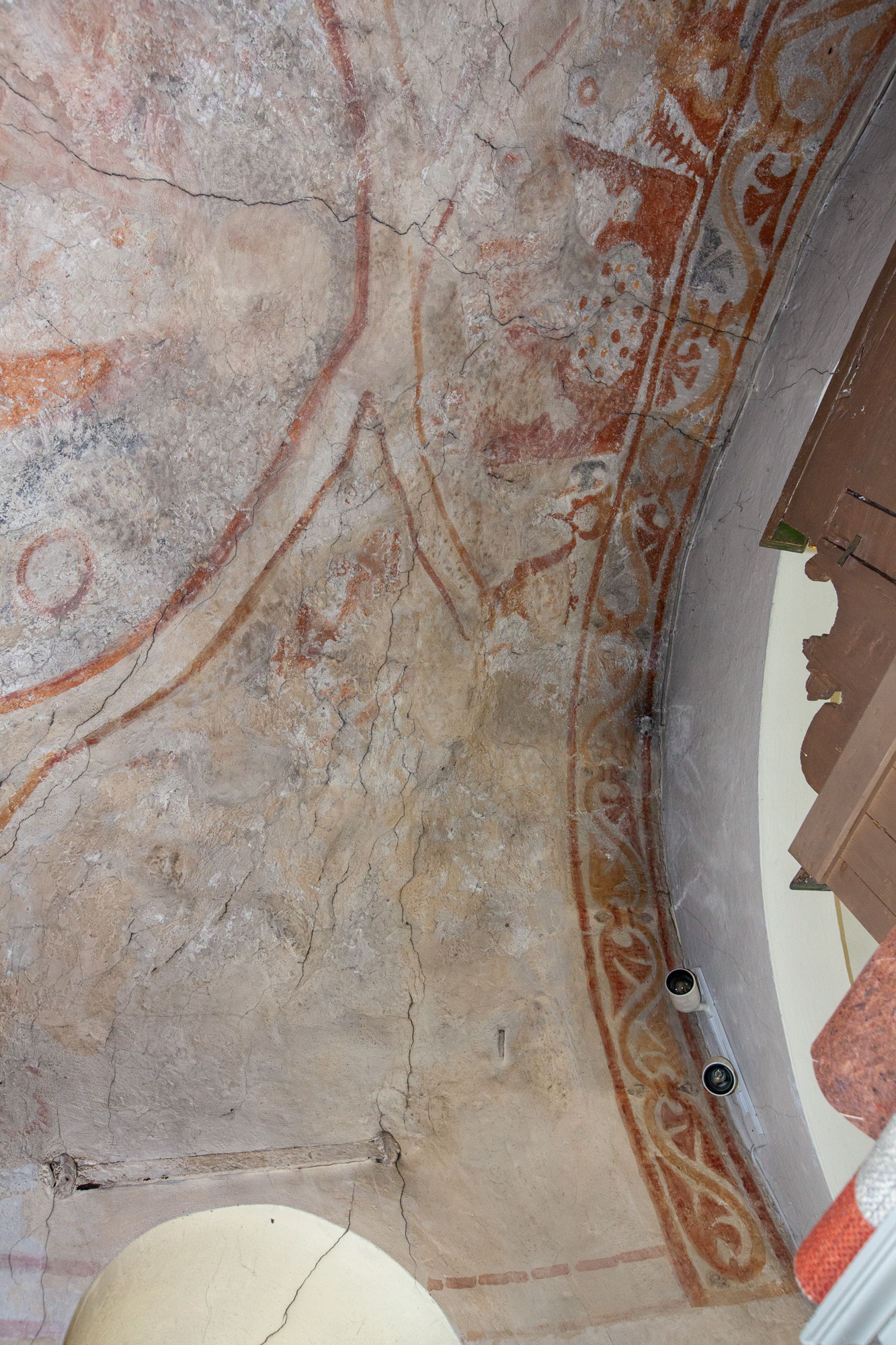 Kalkmalerierne er fra 1300-1325 og domineres af en Majestas Domini. Herren sidder på en regnbue flankeret af sol og måne. Forneden mod nord ses evangelisten Markus. Ovenover – på rød baggrund – skimtes Syndefaldet. Det øverste af Adam og Eva samt kundskabens træ kan ses. Nord for dette motiv ses en engel med løftet sværd – Uddrivelsen. Umiddelbart syd herfor ses en person med kongekrone, som menes at være S. Olav. Umiddelbart nord for englen står S. Laurentius med risten og foran – meget fragmentarisk – en knælende person, som nok er en donor. Nederst i nordsiden står en person med en kurv i hånden. Det er S. Dorothea med blomsterkurven. Ved siden af hende skimtes en person, som måske er S. Margrete.
