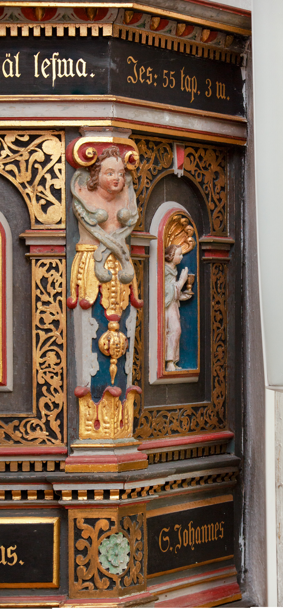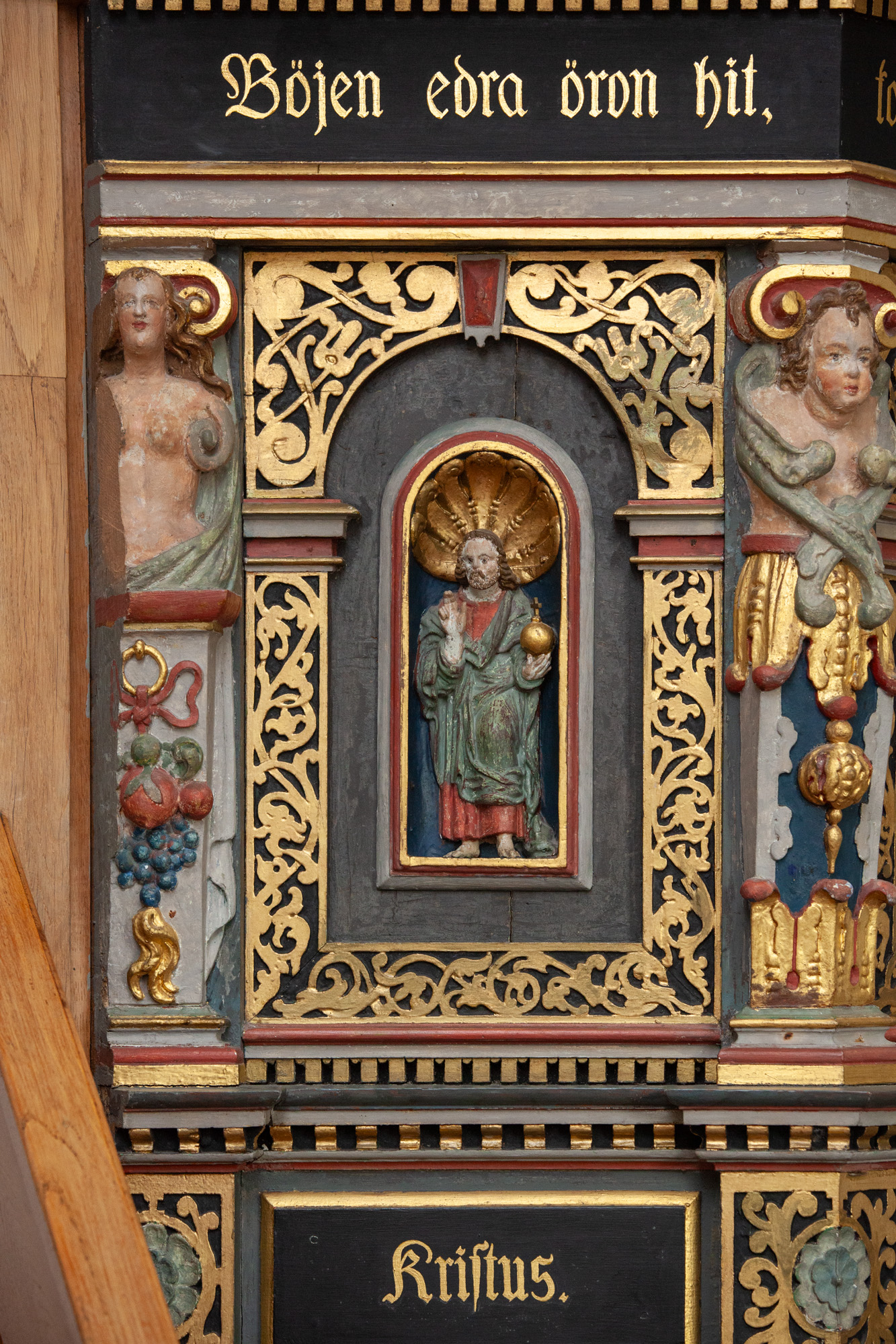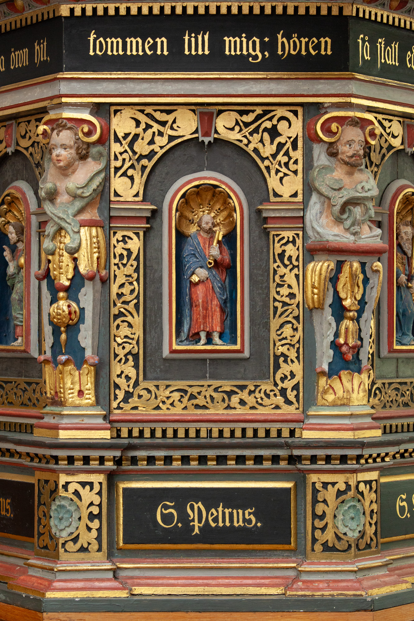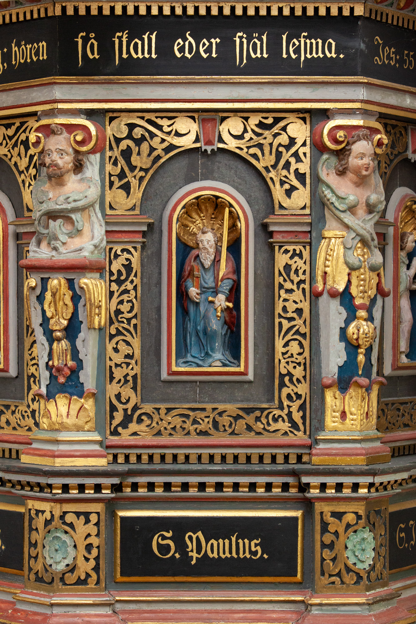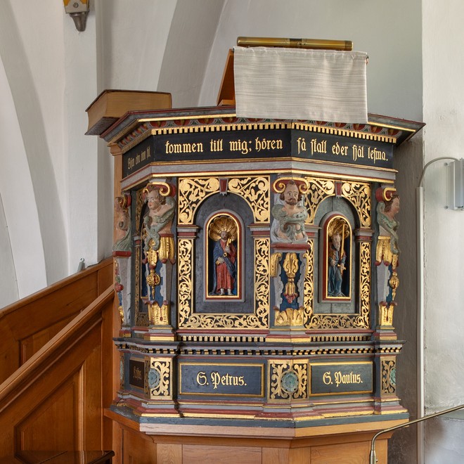 Prædikestolen er fra 1626. Storfelterne er indrammet af buefelter udsmykket med rankeværk. I små buefelter midt i storfelterne er der skulpturer, der fremstiller Kristus, Peter, Paulus og Johannes. Navnene står i smalfelterne forneden. I hjørnerne mellem storfelterne står der hermer. I smalfelterne foroven er et citat fra Es. 55,3.