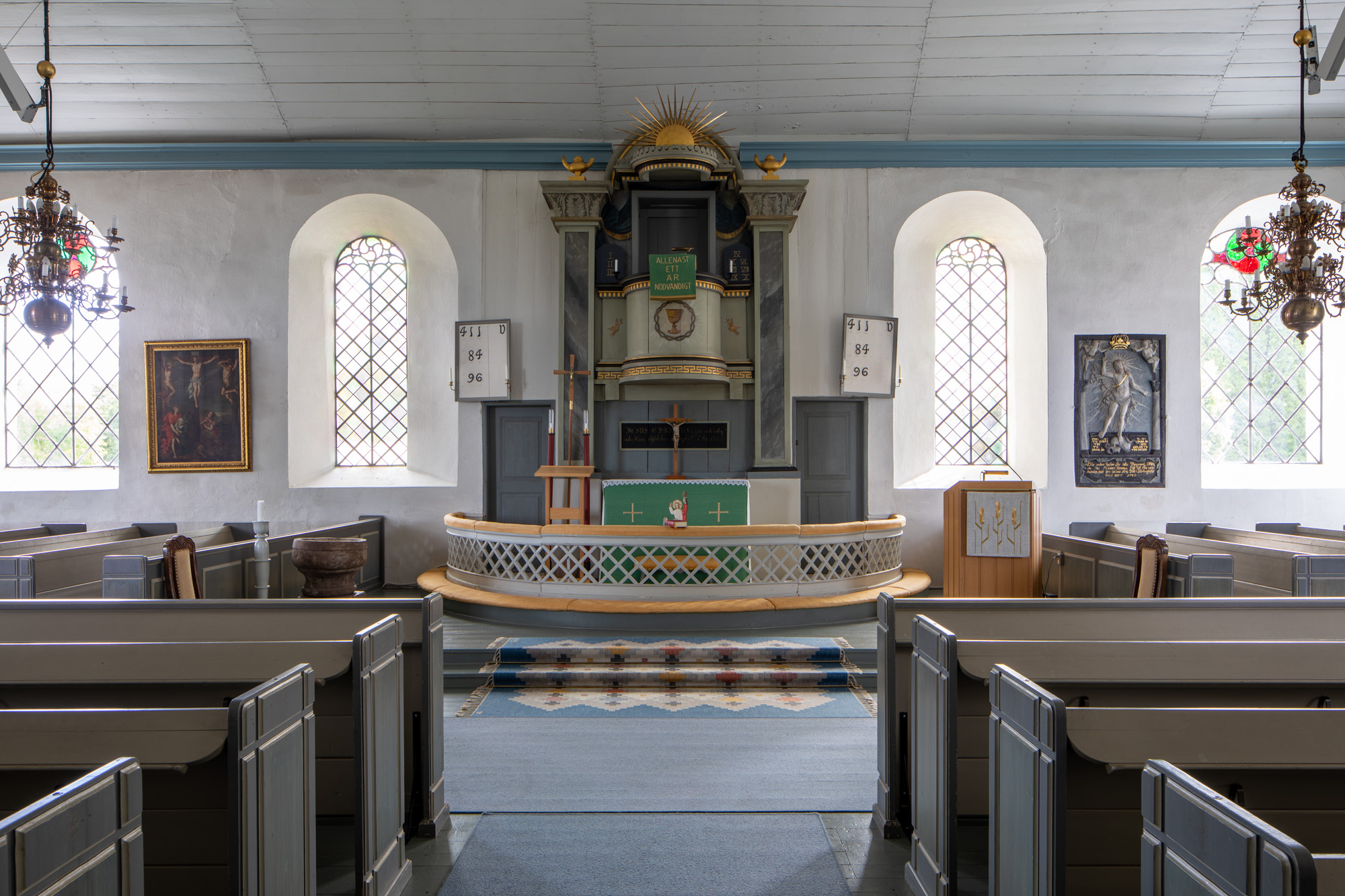 b. En medaljon, hvor Maria med en krone på hovedet (måske) ligger på et leje. Overfor sidder Josef. På en kalk, som står midt imellem dem, ligger Jesus som svøbelsesbarn. Båder Maria og barnet rækker armene ud mod hinanden. Omkring dem ses tilbedende engle.
