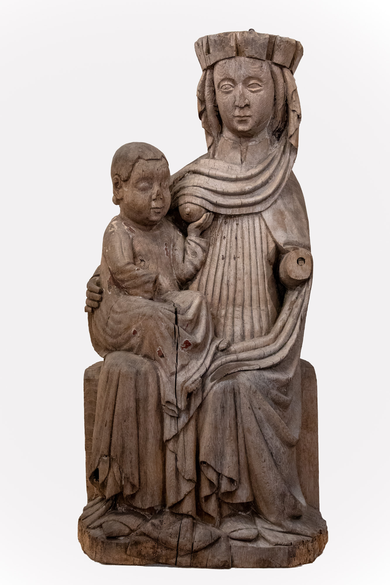 Maria sidder frontalt på en bænk med løftet venstre arm. På hovedet bærer hun en kronring og på kroppen i øvrigt en kjortel, der falder tynde tætsinddende folder, og derover en kappe. Barnet, der sidder på hendes højre knæ, er iført en kjortel. Med venstre hånd tager han fat i moderens blottede bryst.