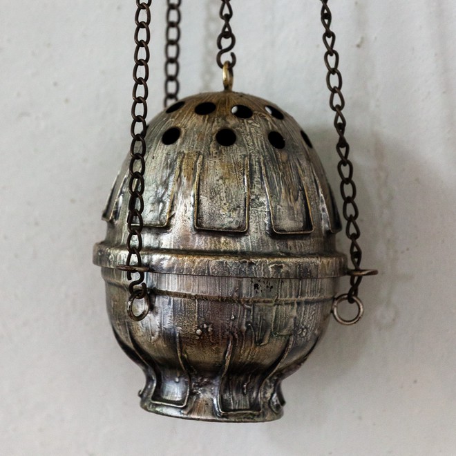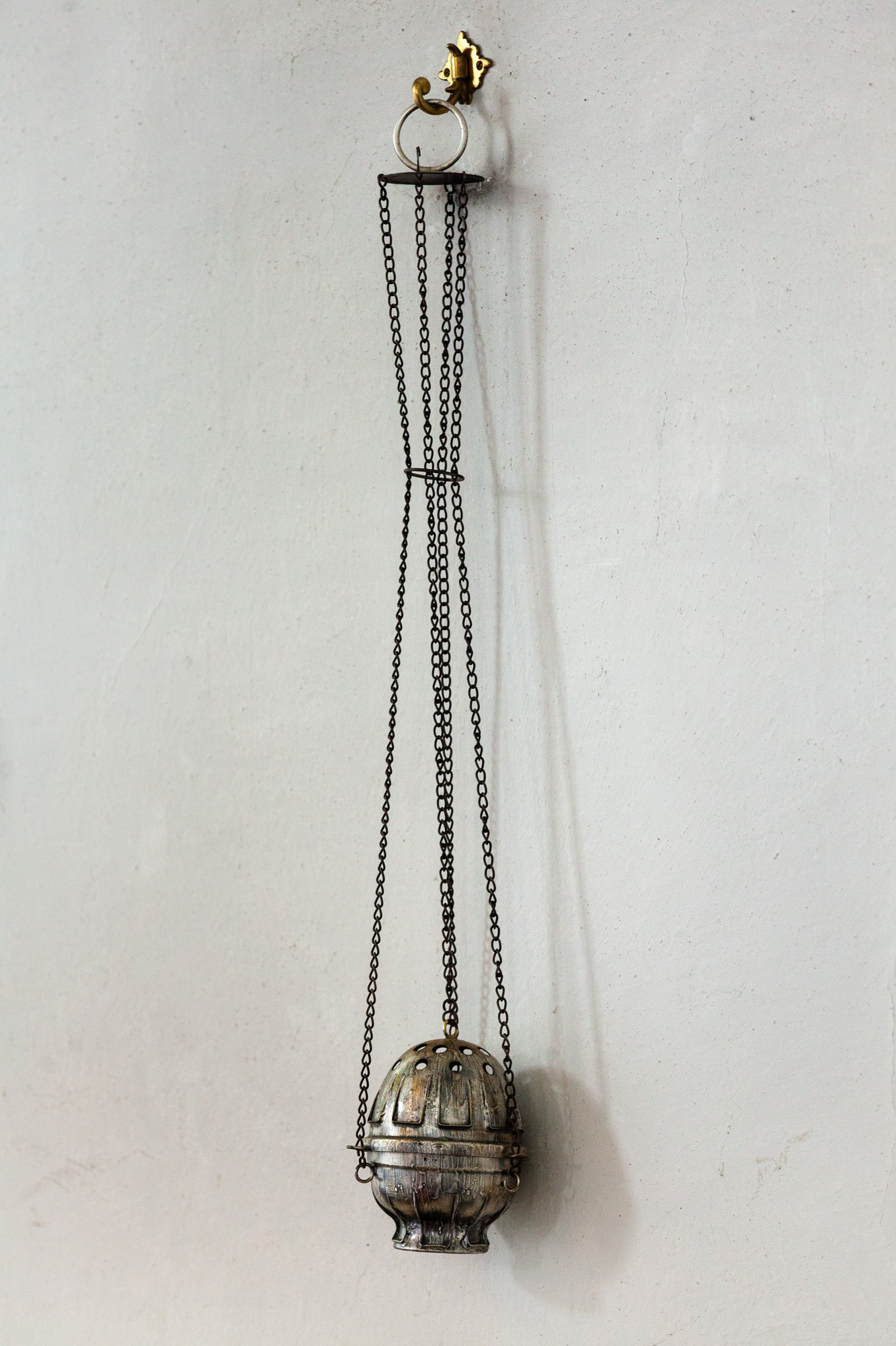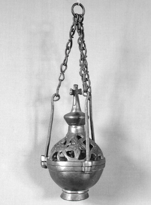 Røgelseskar af malm ophængt i tre jernkæder. Kugleformet. Den øverste del i gennembrudt arbejde i form af blade. Øverst et kors. Middelalderen.