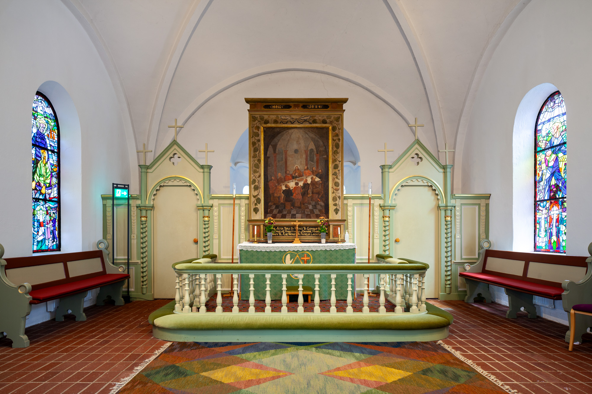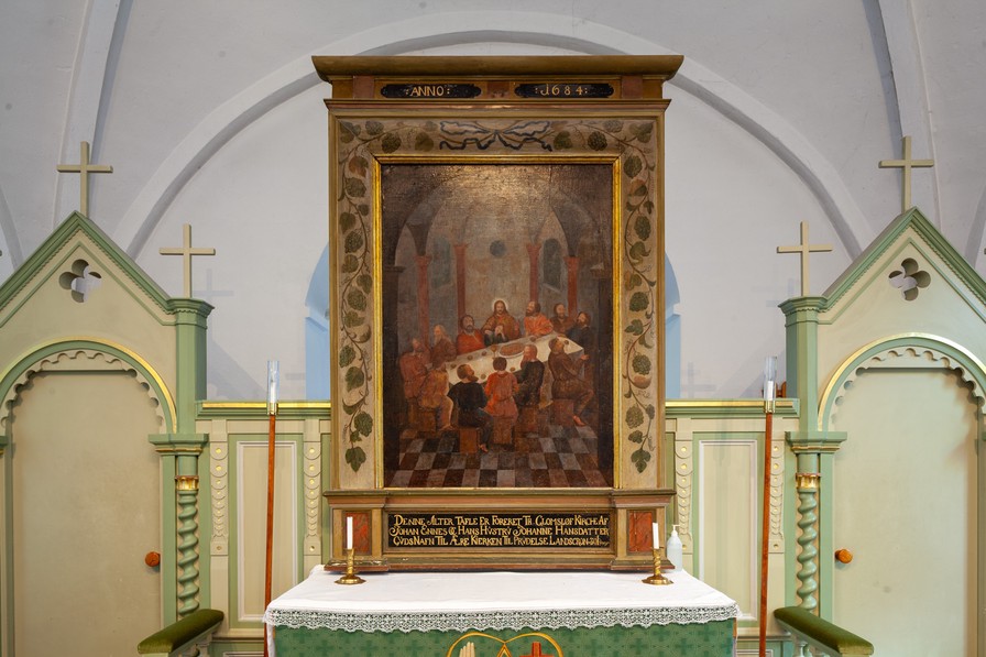 Altertavlen er fra 1684. Billedet, der forestiller nadveren indstiftelse, er indsat i en enkel ramme med malede bladranker. Den er således efter renæssancen, men er helt uden spor af barok. Derimod har den svage renæssancespor i form af konsollerne i fodstykket og tekstfeltet. Konsollerne bærer dog hverken søjler eller pilastre. I tesktfeltet på fodstykket står der: