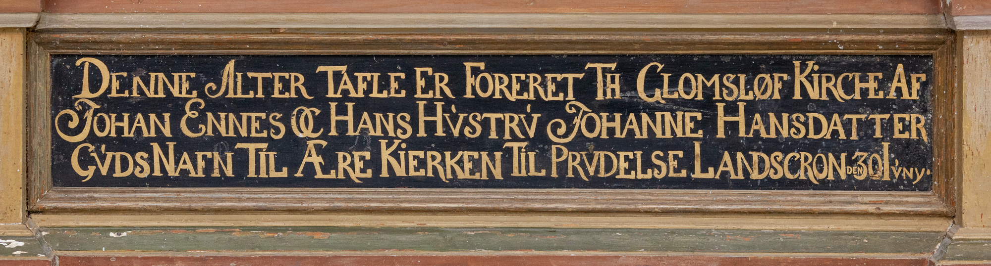 Denne Alter Tafle Er Foreret Til Glomsløf Kirche Af Johan Ennes oc Hans Hustru Johanne Hansdatter Guds Nafn Til Ære Kierken Til Prydelse Landscron 30 Iuny.