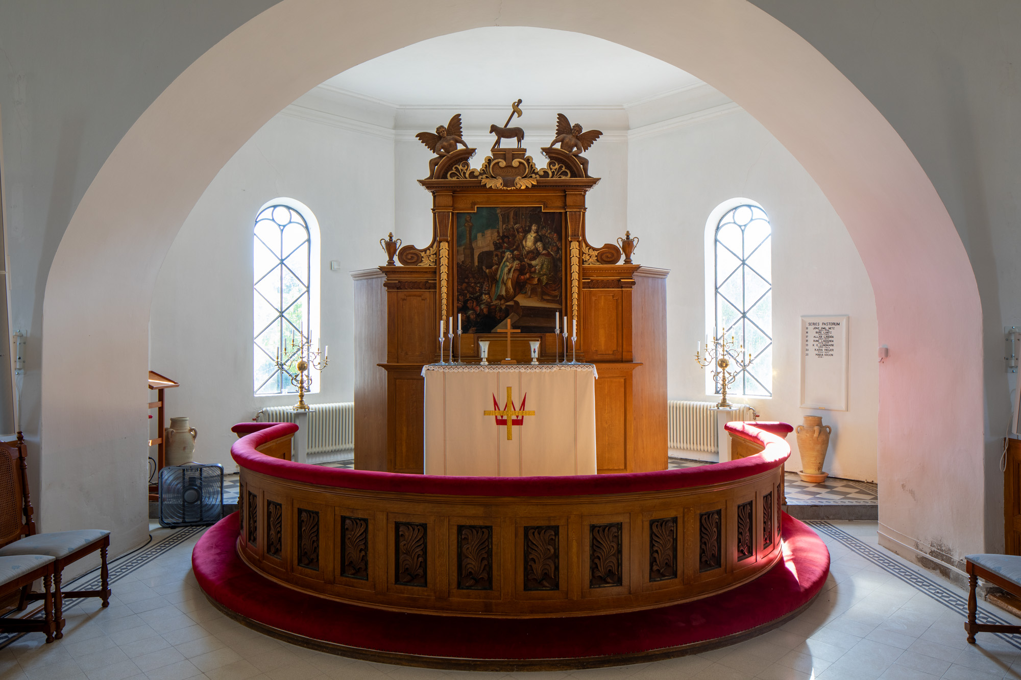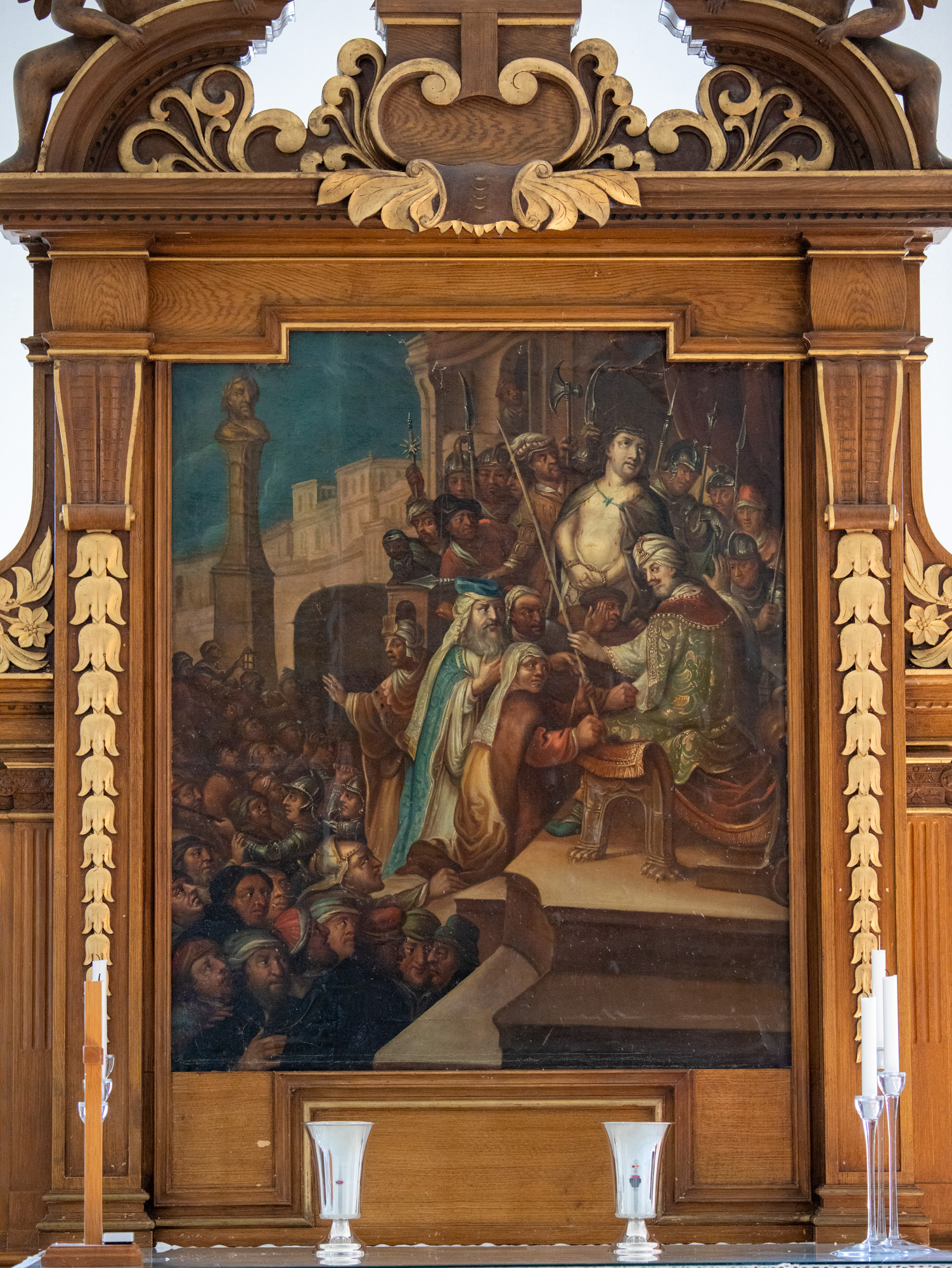 Altertavlen er fra 1800-tallet, mens alterbilledet er et oliemaleri fra 1600-tallet. Motivet er Jesus for Pilatus.
