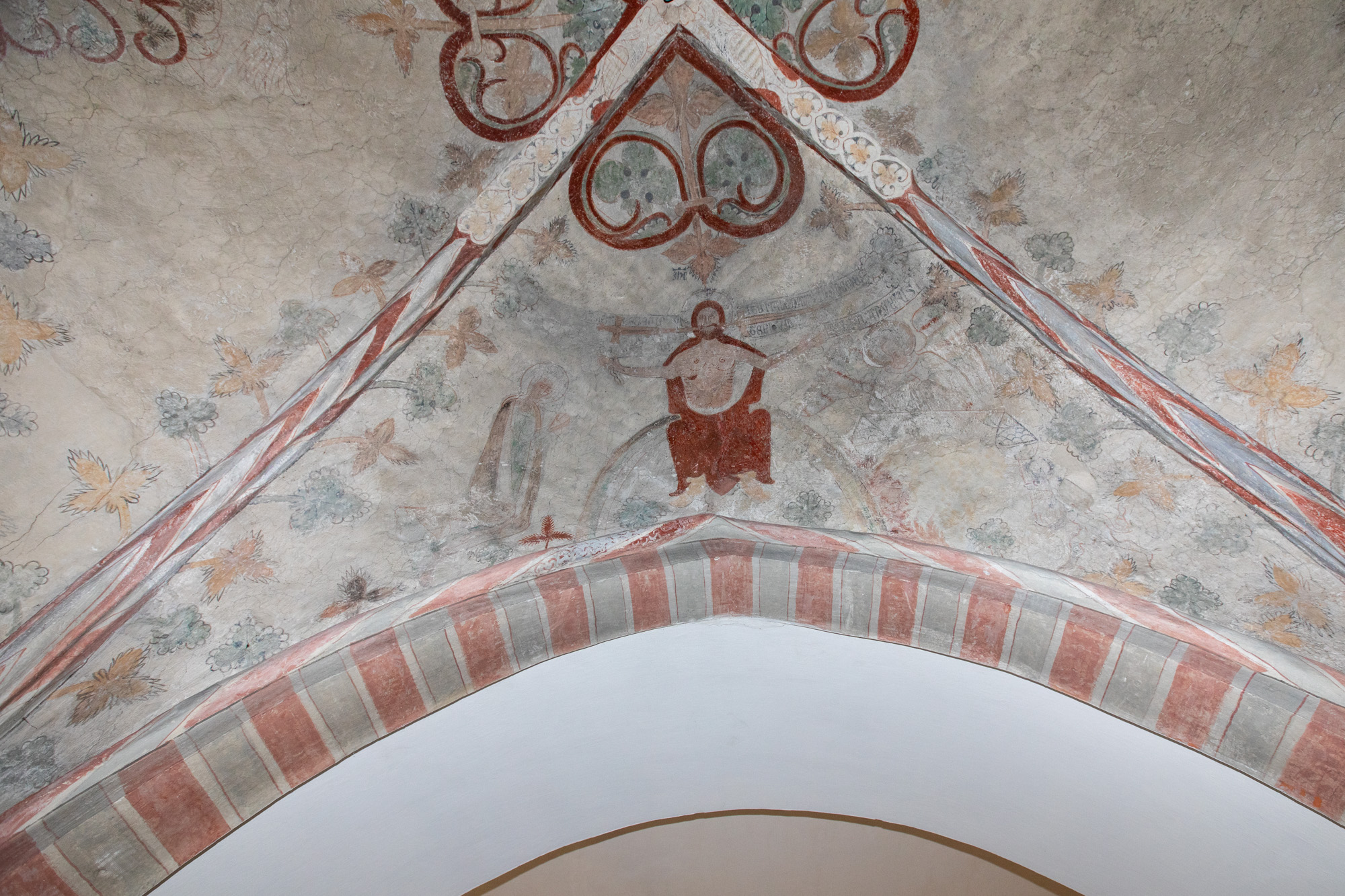 Første fag østkappe: Kristus som verdensdommer sidder på regnbuen med udbredte arme og lilje og sværd, som udgår fra hans mund. Han flankeres af Maria mod nord. Hun knæler i bøn. Mod syd står Mikael Sjælevejer med vægten. I vægtskålene ses sjælene, mens to djævle manipulerer med vægten. I skriftbåndene står der: Ihesus. – Venite benedicti… - Ite maledicti in ignem eternum. – Michael Angelus.