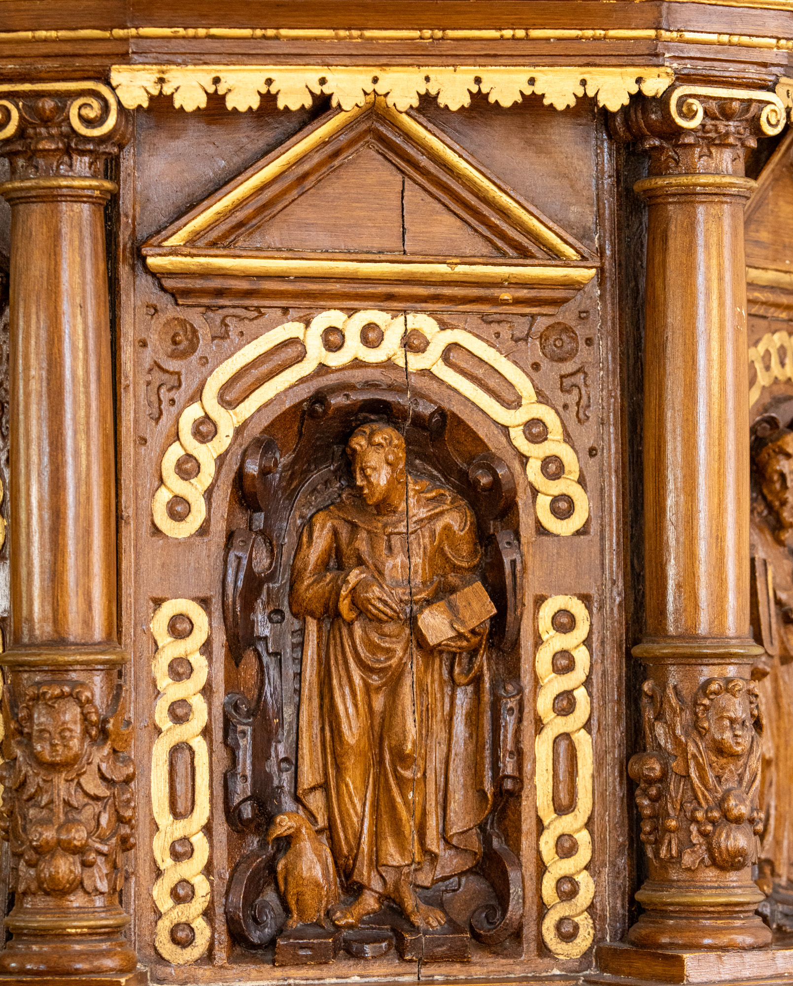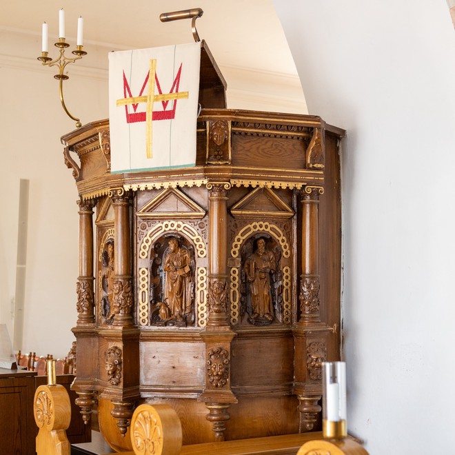 Prædikestolen er fra 1600-tallet. De nederste smalfelter er tomme. Løvemasker pryder konsollerne.