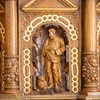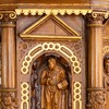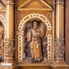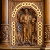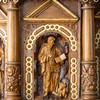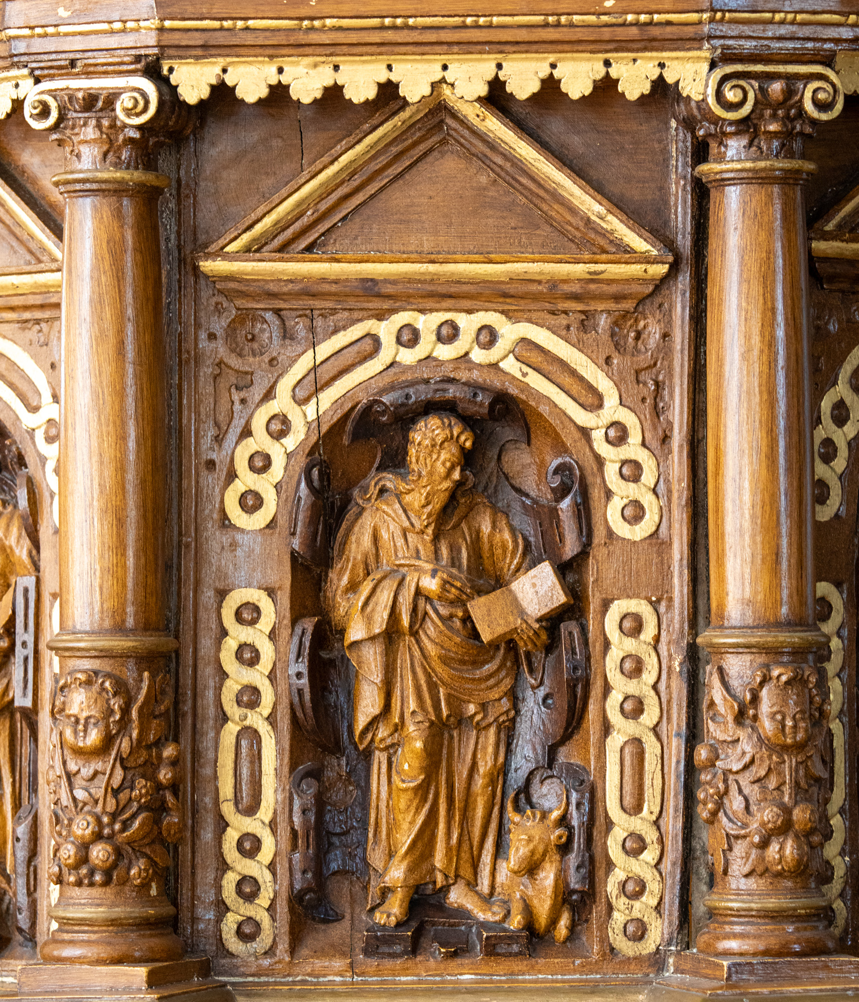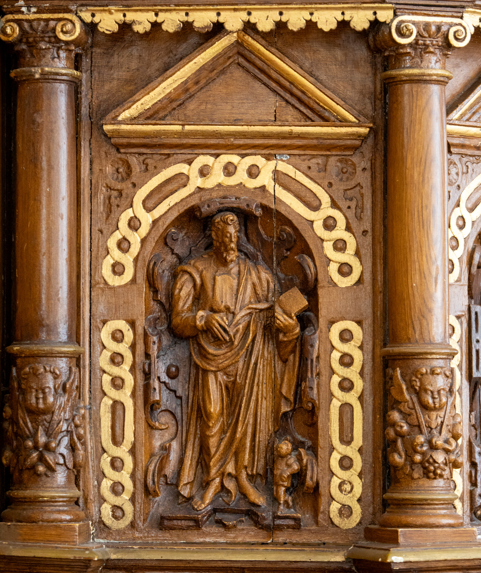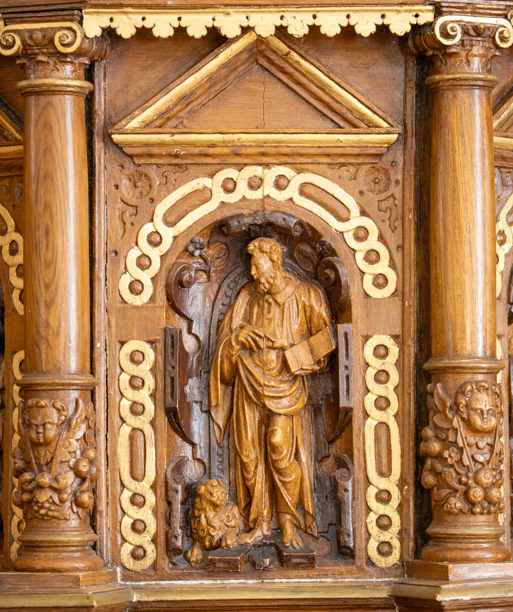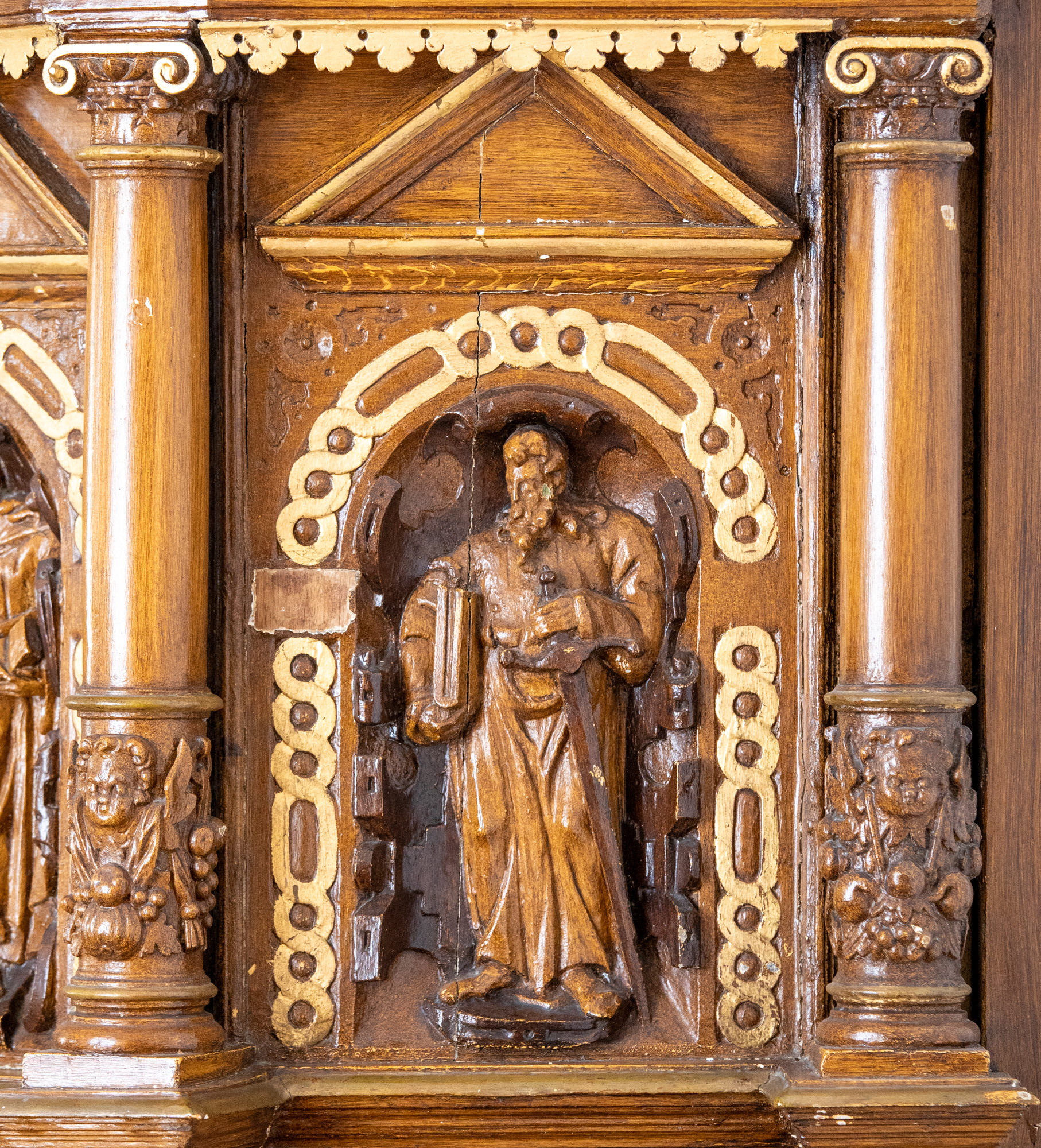 Motiverne i storfelterne er Peter og evangelisterne – alle med atributter. De er indrammet i rundbuefelter med slyngbånd og øverst et gavlfelt. Storfelterne adskilles af søjler med joniske kapitæler, glatte skafter og prydbælter med englehoveder og frugtklaser.