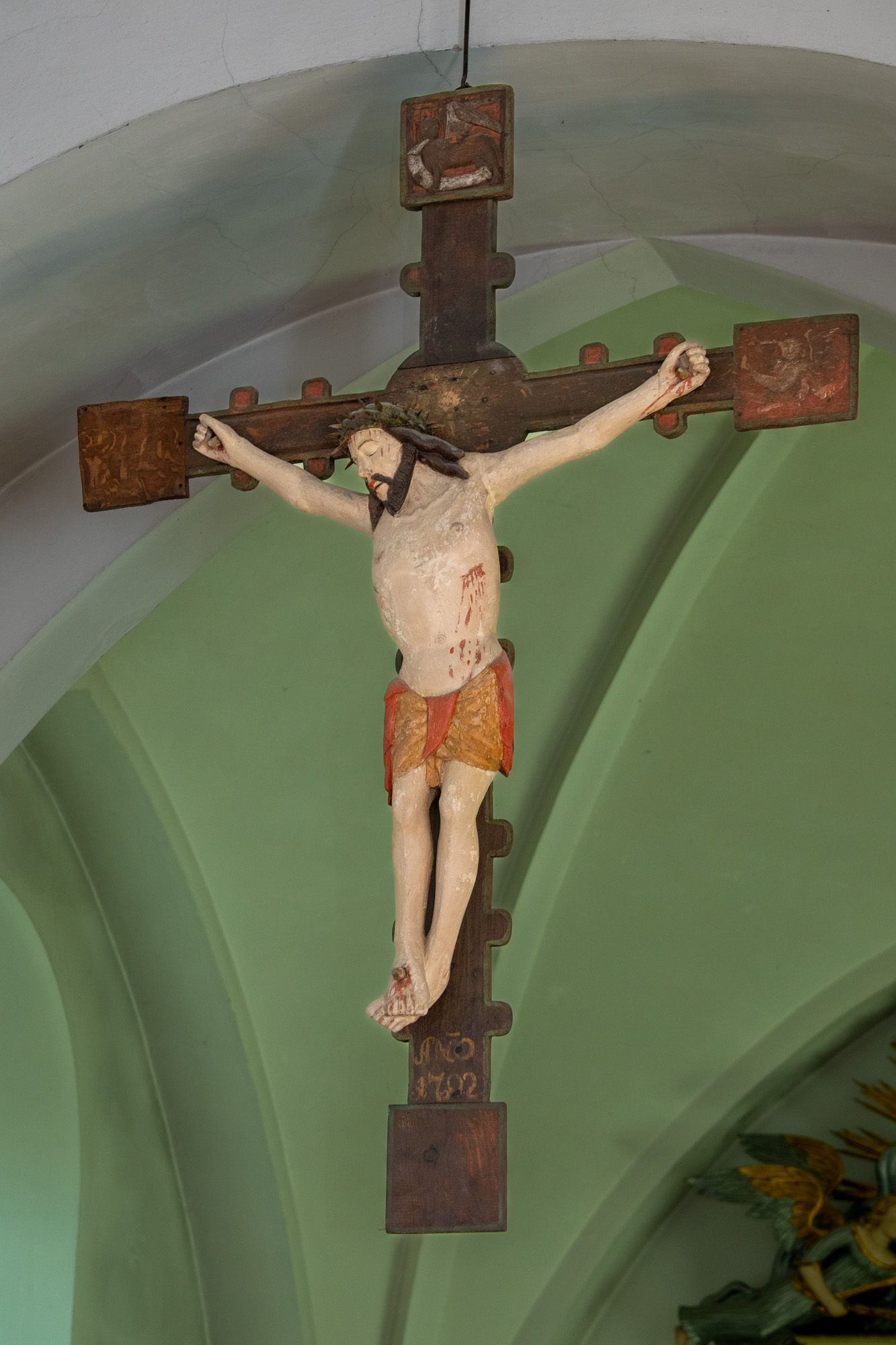 Overkroppen hælder til højre, ligesom hovedet er bøjet ned forover mod højre. Tornekronen er snoet. Armene er udstrakt diagonalt, og fingrene er bøjede. Sidesåret er diagonalt. Lændeklædet er kort og bundet midt for. Højre fod er lagt ind over venstre.