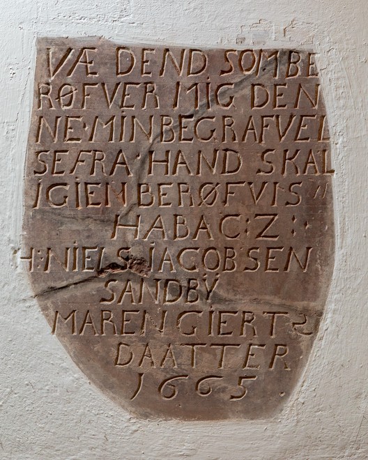 Væ dend som berøfver mig denne min begrafvelse fra hand skal igien berøfvis. Habc. 2. H. Niels Iacobsen Sandby. Maren Giertsdaatter. 1665.