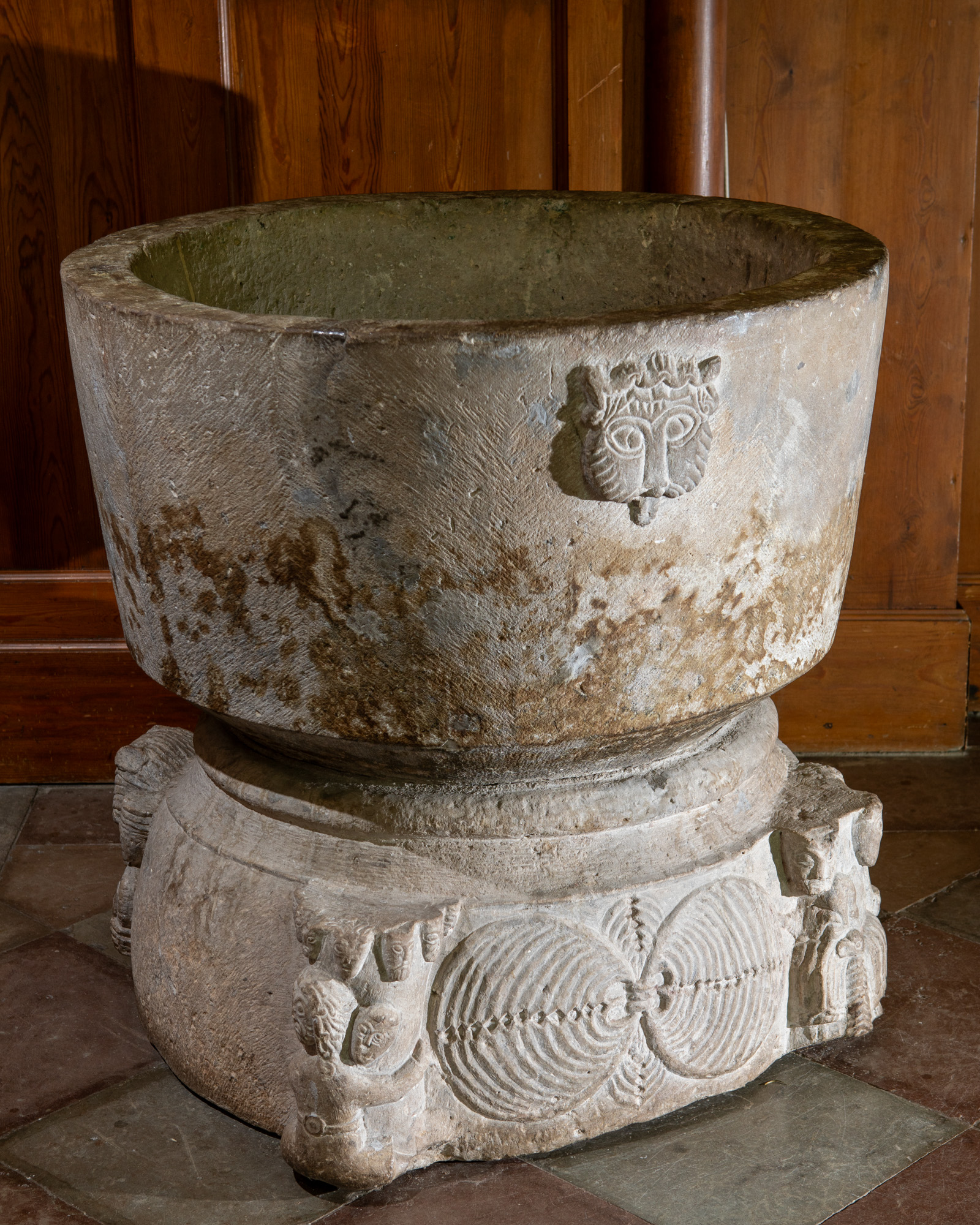 Kummen har næsten lodrette sider. En skråkant med en svag hulkehl slutter den af forneden. Der er udtømningshul, men ikke fals. På siden findes et løvehoved med udrakt tunge.