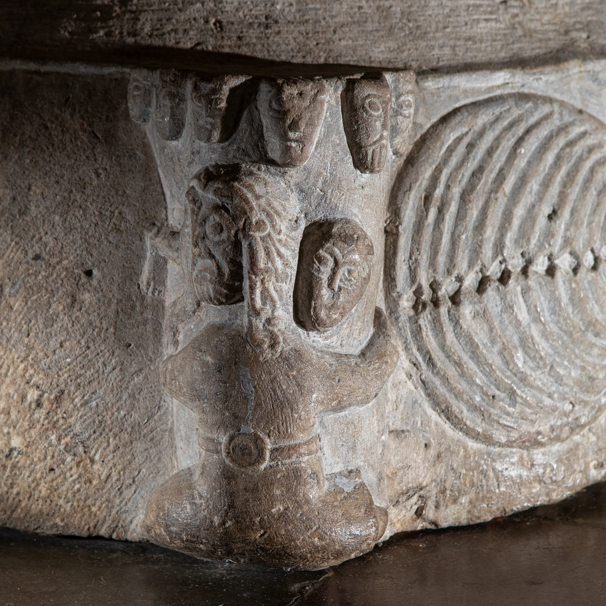 Foden består øverst af en hulkehl og derover en rundstav. På foden er der fire kraftigt fremspringende figurer.
