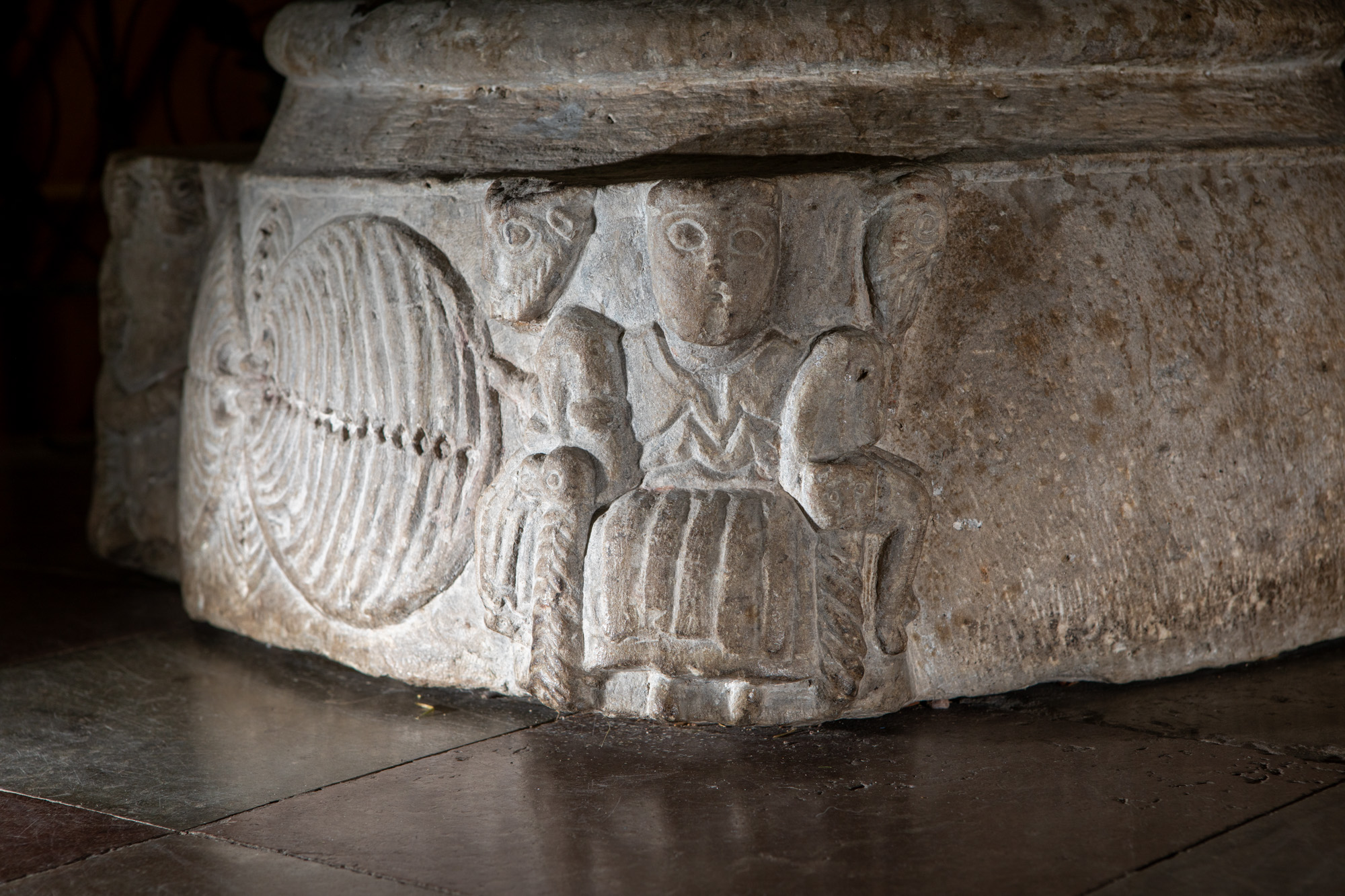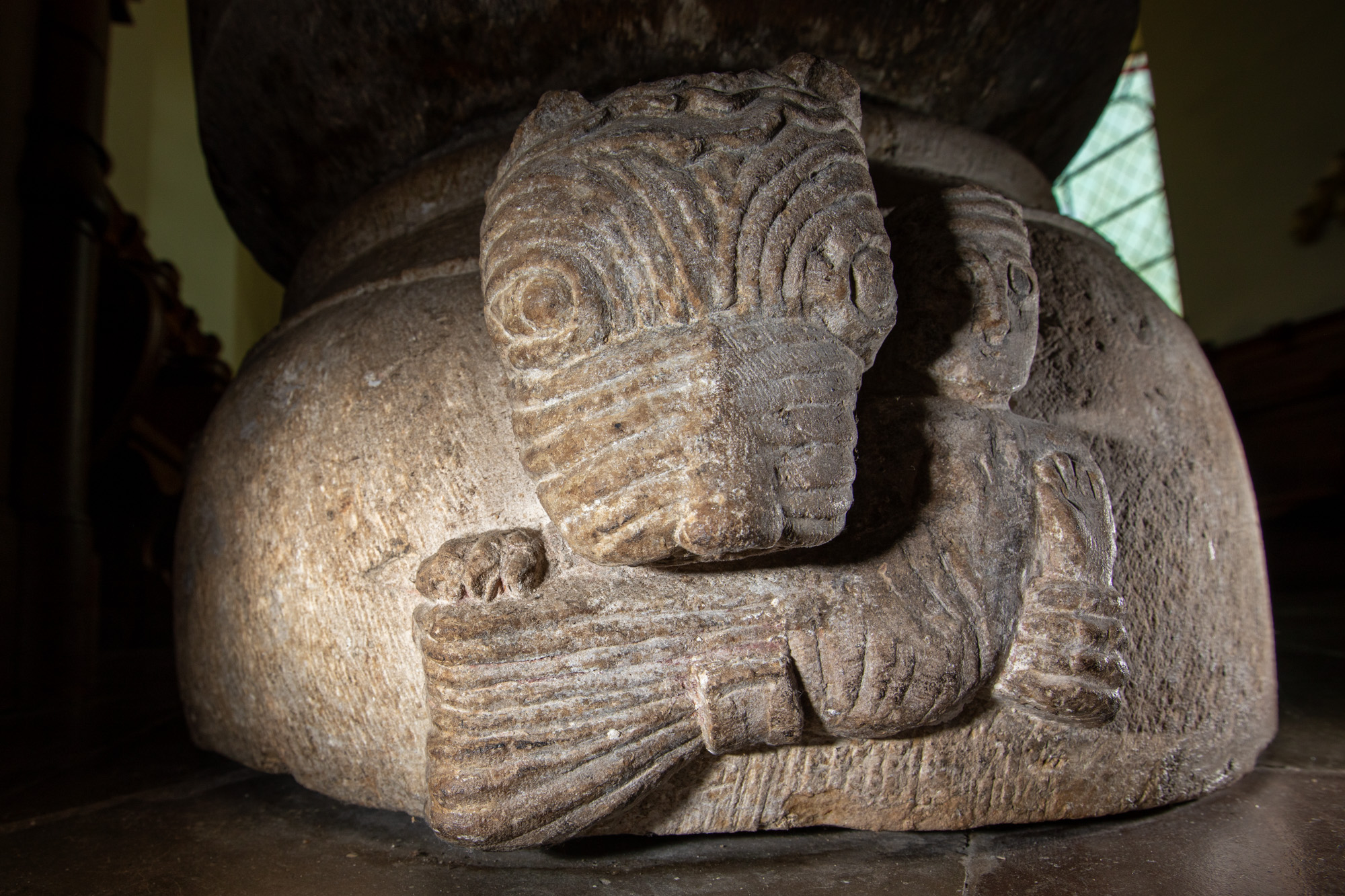 Man erinras dervid om en likartad föreställning i Lunds krypta. Jätteqvinnan med sitt barn, hedendomen, söker nedbryta kolonnen, hvars kapitel åsyftar christna församlingen. Gumsen (vædderen) symboliserar den rena christendomen. Å foten föreställes jemväl afgrundens lejon, som uppslukar en syndare, och S. Anna, som håller jungfru Maria och Christus på sina knän. Å skålen afbildas Christus såsom lejon med uträckt tunga, hvilket med lugn ställning liksom betraktar hedendomens kamp emot christendomen.