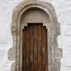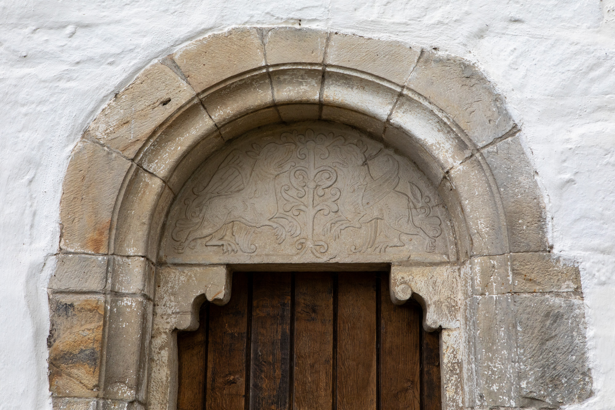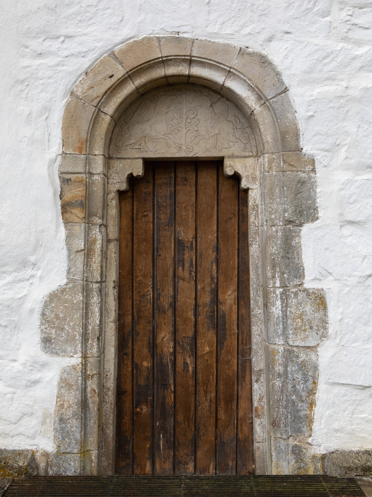 To romanske portaler er bevaret. Den på nordsiden har en tympanon med to løver, der er vendt imod hinanden med en stiliseret plante imellem sig. De har vinger, og halerne munder ud i bladranker.