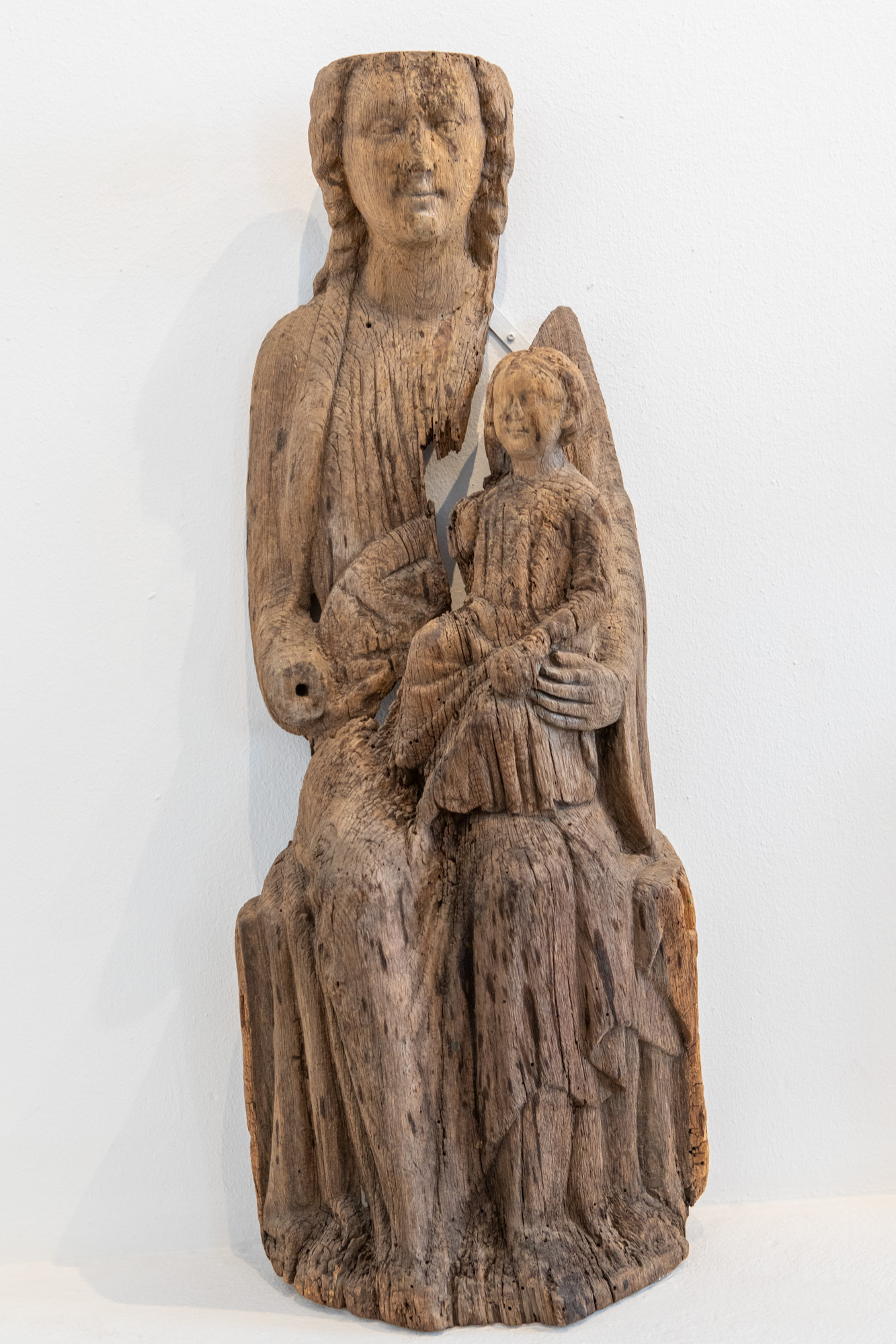 Madonna fra første halvdel af 1200-tallet. I højre hånd har hun haft et scepter. Det ses i flere af periodens madonnafigurer: Øster Vram, Ellerød, Ravlunde og Stenested. På hovedet har hun en kronring. Kjortelen har rund hals med bred glat bort, og kappen går ned til fødderne. Barnet sidder på hendes venstre knæ. I venstre hånd holder han jordkloden.