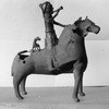 Akvamanile til liturgisk håndvask. Den er formet som en rytter. Rytteren har benene strakt ud i stigbøjlerne. For munden holder han et horn. På hestens ryg bag rytteren står en hund.
