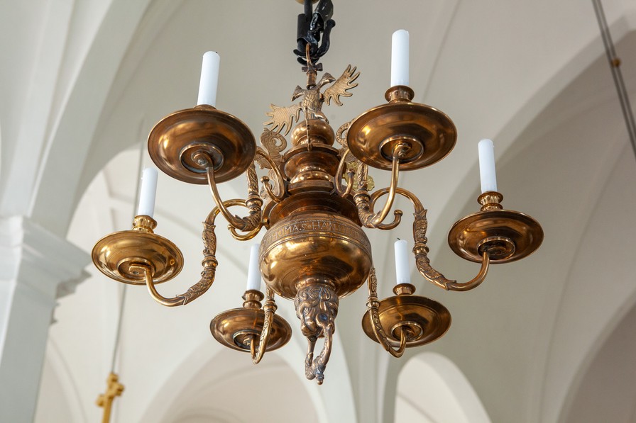 Døbefont af sandsten. Kummen har udtømningshul, men ingen fals. Foden er cylindrisk foroven med to rundstave, en kraftig og en mindre kraftig. Forneden er den firkantet (næsten kvadratisk) og består af en platte, en høj skråkant. På hjørnerne øverst mod rundstavene sidder hovedlignende knopper.